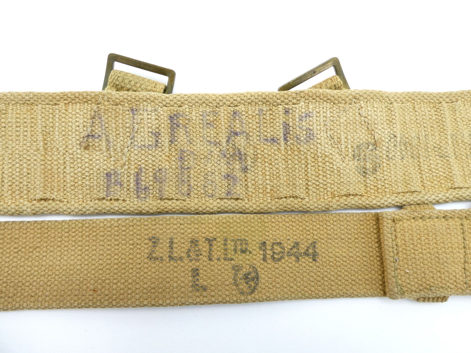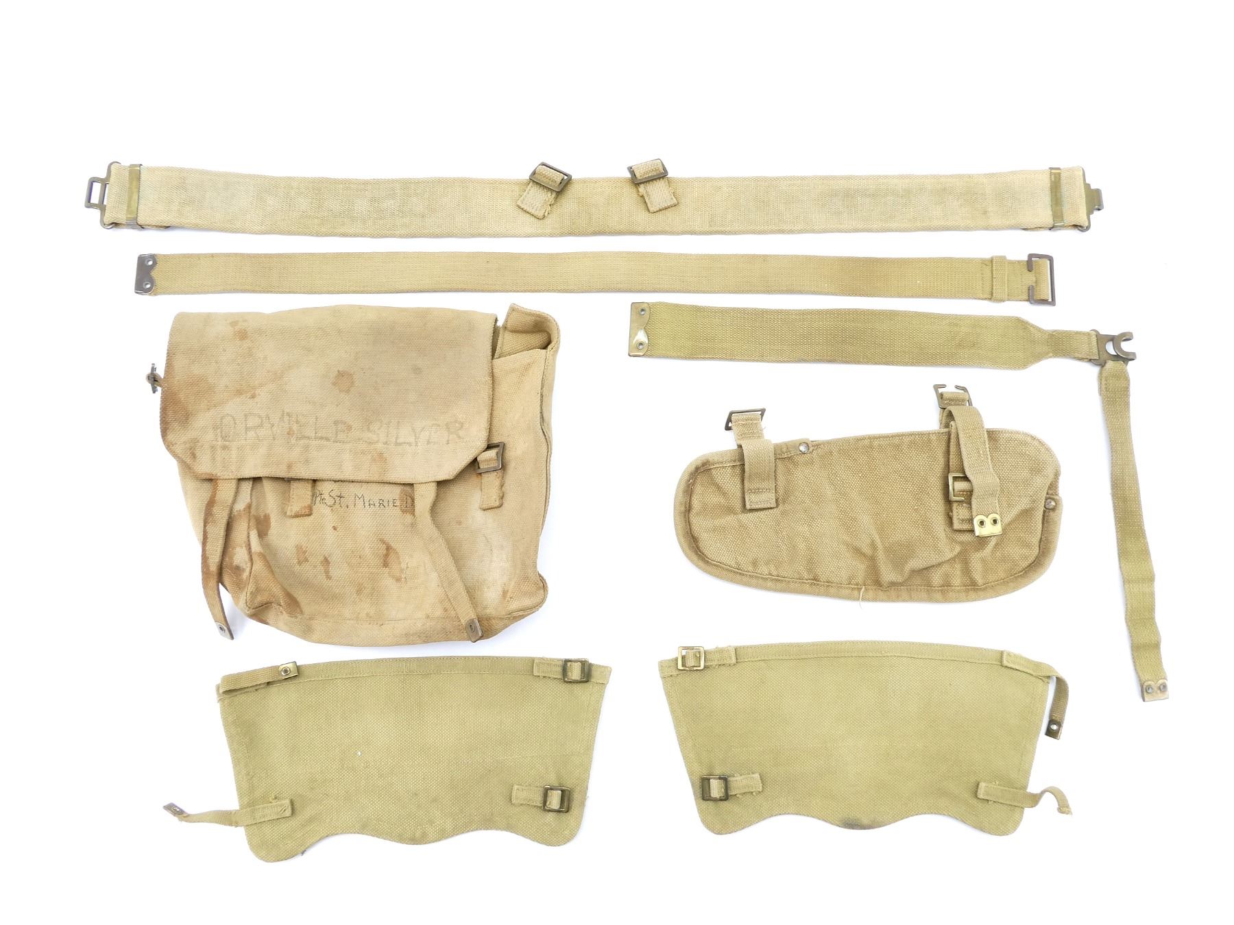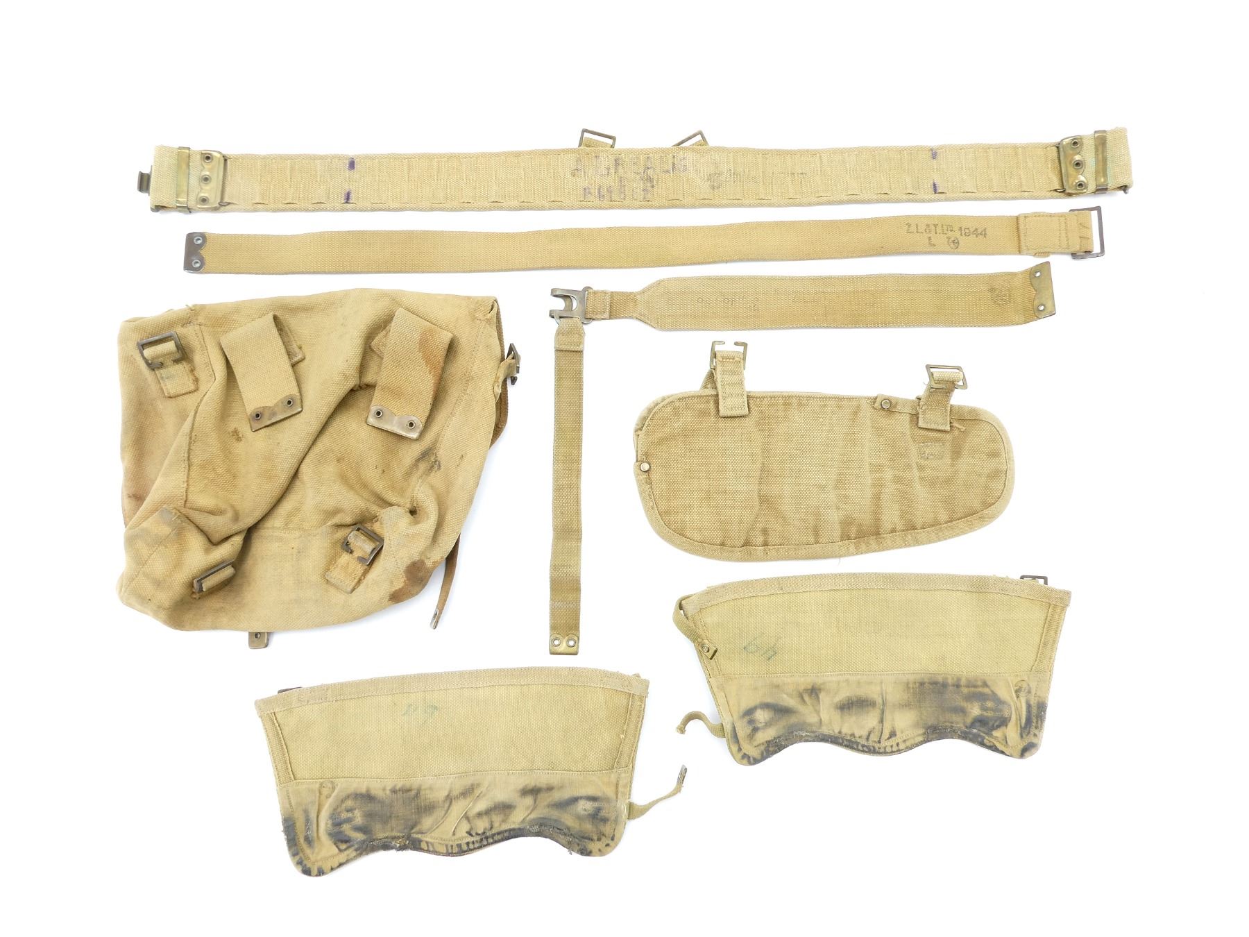 LOT INCLUDES; (1) TAN P37 WEB SMALL FIELD PACK, FAINTLY MARKED: "Z.L.&T.??? 1941" WITH C-BROAD ARROW, "S", HAND-WRITTEN MARKED: "ORVILLE SILVER", "W110395, ?ST. MARIE.D.M.", BRASS FITTINGS, NO SHOULD STRAP, SHOWS AGE / WEAR, (1) TAN P37 WEB ENTRENCHING TOOL COVER, MARKED WITH C-BROAD ARROW, BRASS FITTINGS, OVERALL LENGTH APPROX. 13.5", (1) TAN P37 WEB PAIR OF GAITERS, MARKED WITH C-BROAD ARROWS, BRASS FITTINGS APPROX. 13.25" X 6", (1) TAN P37 WEB BELT, FAINTLY MARKED: "Z.L.&T.LTD. 1940", "S" WITH VARIOUS OTHER MARKINGS, BRASS FITTINGS, OVERALL LENGTH APPROX. 36.75", ADJUSTABLE, (1) TAN P37 WEB BELT MARKED: "Z.L.&T.LTD. 1944, L" WITH C-BROAD ARROW, BRASS FITTINGS, OVERALL LENGTH APPROX. 33.25" & (1) L-SHAPED TAN P37 WEB STRAP, MARKED WITH C-BROAD ARROW & VARIOUS OTHER FAINT / UN-CLEAR MARKINGS. SEE PHOTOS.