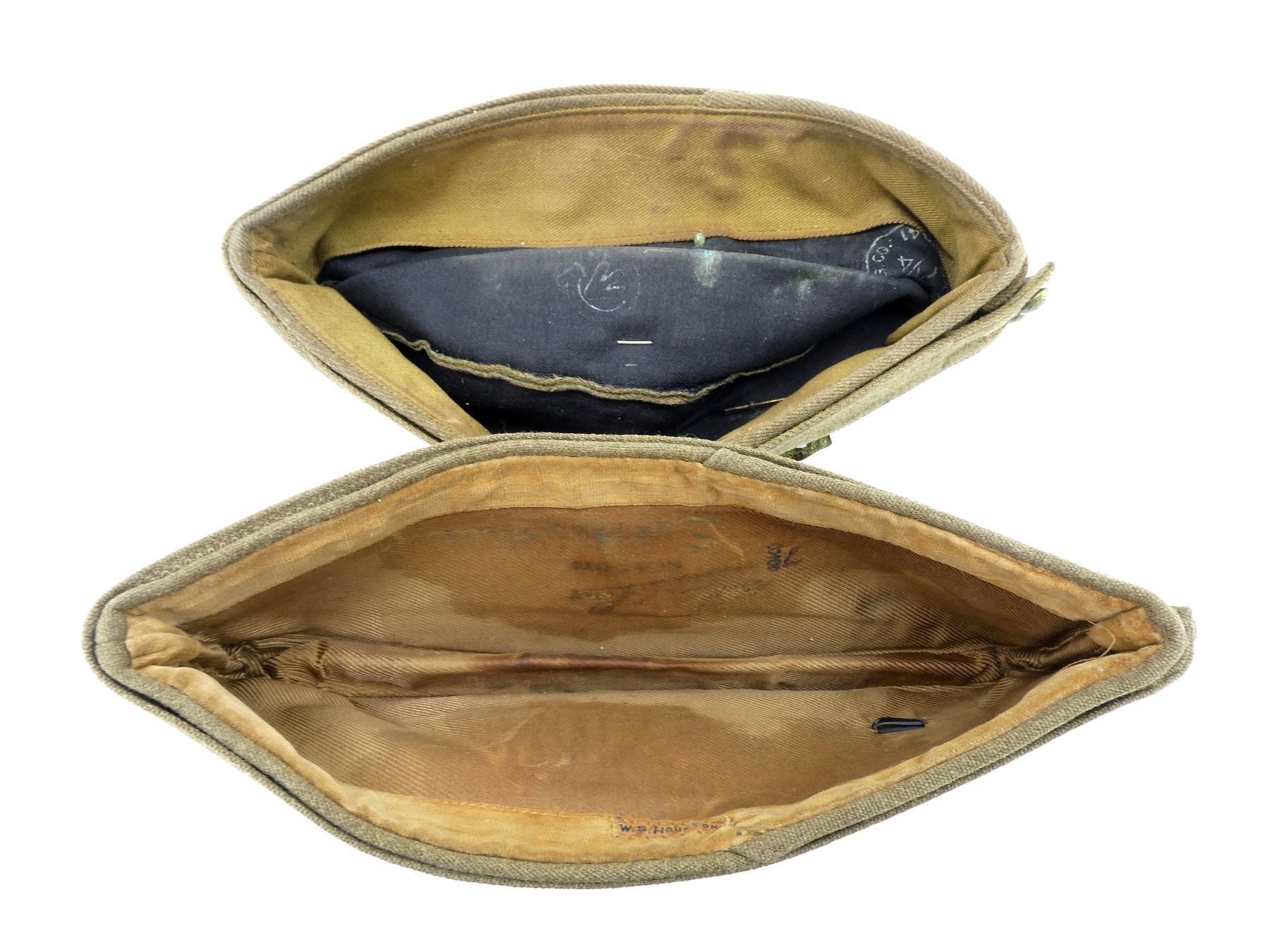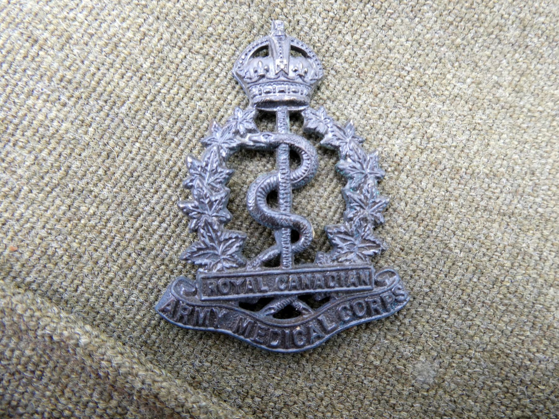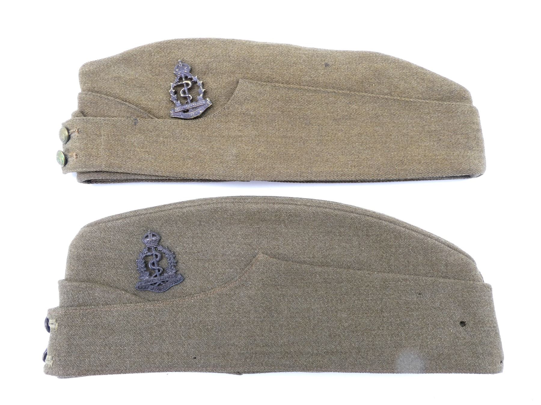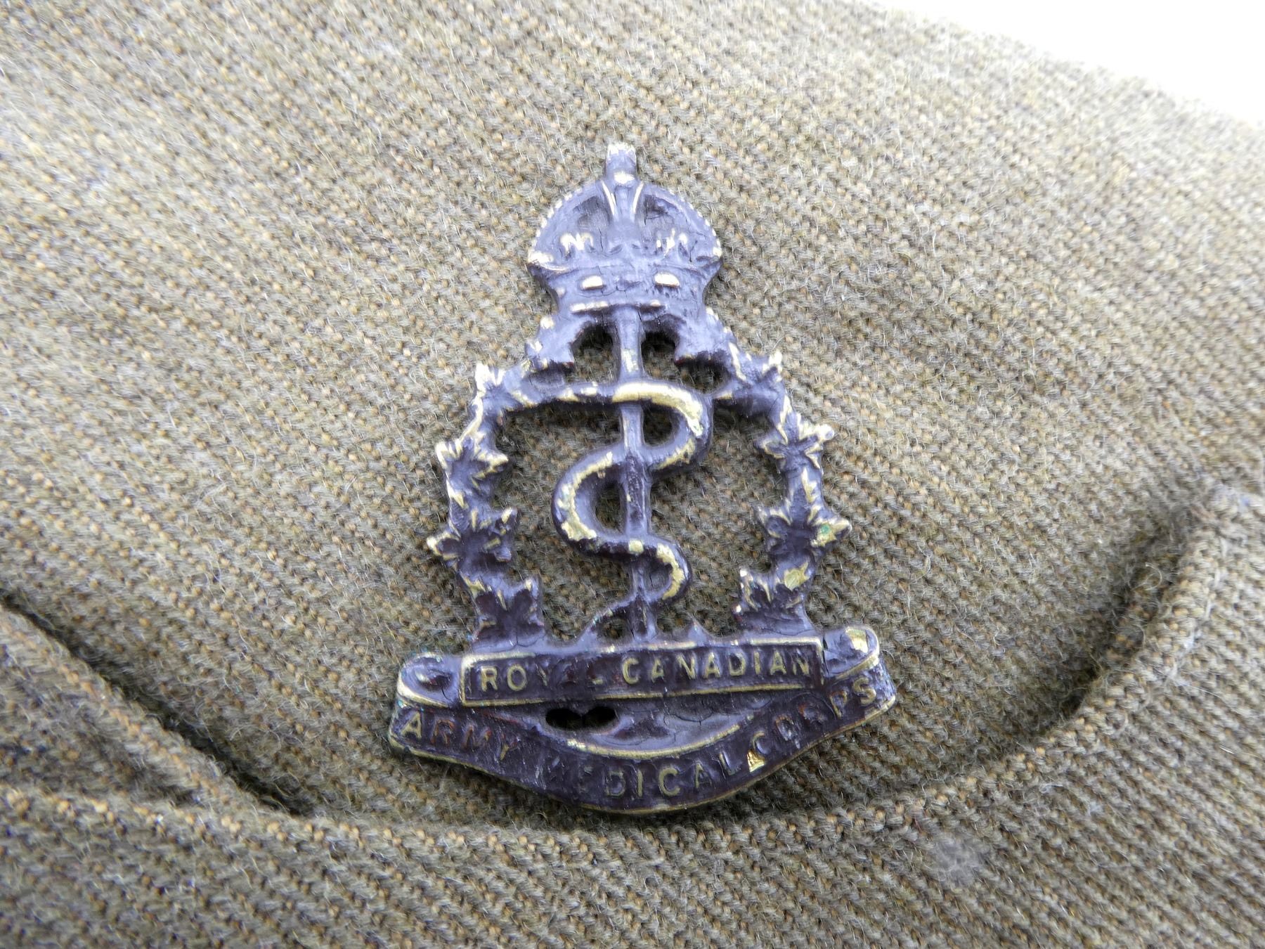 LOT INCLUDES; (2) TAN CANVAS WEDGE CAPS WITH BRASS KING'S CROWN ROYAL CANADIAN ARMY MEDICAL CORPS CAP BADGES, ONE MARKED: "NATIONAL HAT MFG. CO. 1941, 7 1/4" WITH C-BROAD ARROW, HAND-WRITTEN: "SWH", OTHER MARKED: "7 3/8" WITH FAINT / UN-CLEAR MARKER'S MARK, HAND-WRITTEN MARKED: "SW HOUSTON", TAG INSIDE MARKED: "W.S. HOUSTON", BOTH SHOW AGE / WEAR, SLIGHT MOTHS HOLES ON ONE. SEE PHOTOS.