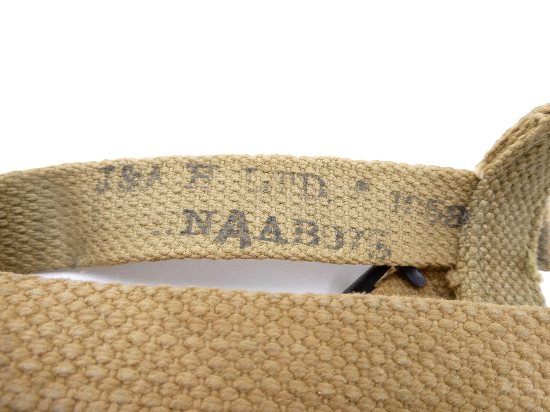 (1) WOOL / FELT COVERED GREEN ENAMELED METAL CANTEEN WITH CORK / METAL STOPPER, TAN P37 WEB SKELETON CARRIER MARKED: "J&A, H, LTD. 1953, NAABO??", STEEL / BRASS FITTINGS, SHOWS AGE / WEAR. SEE PHOTOS.