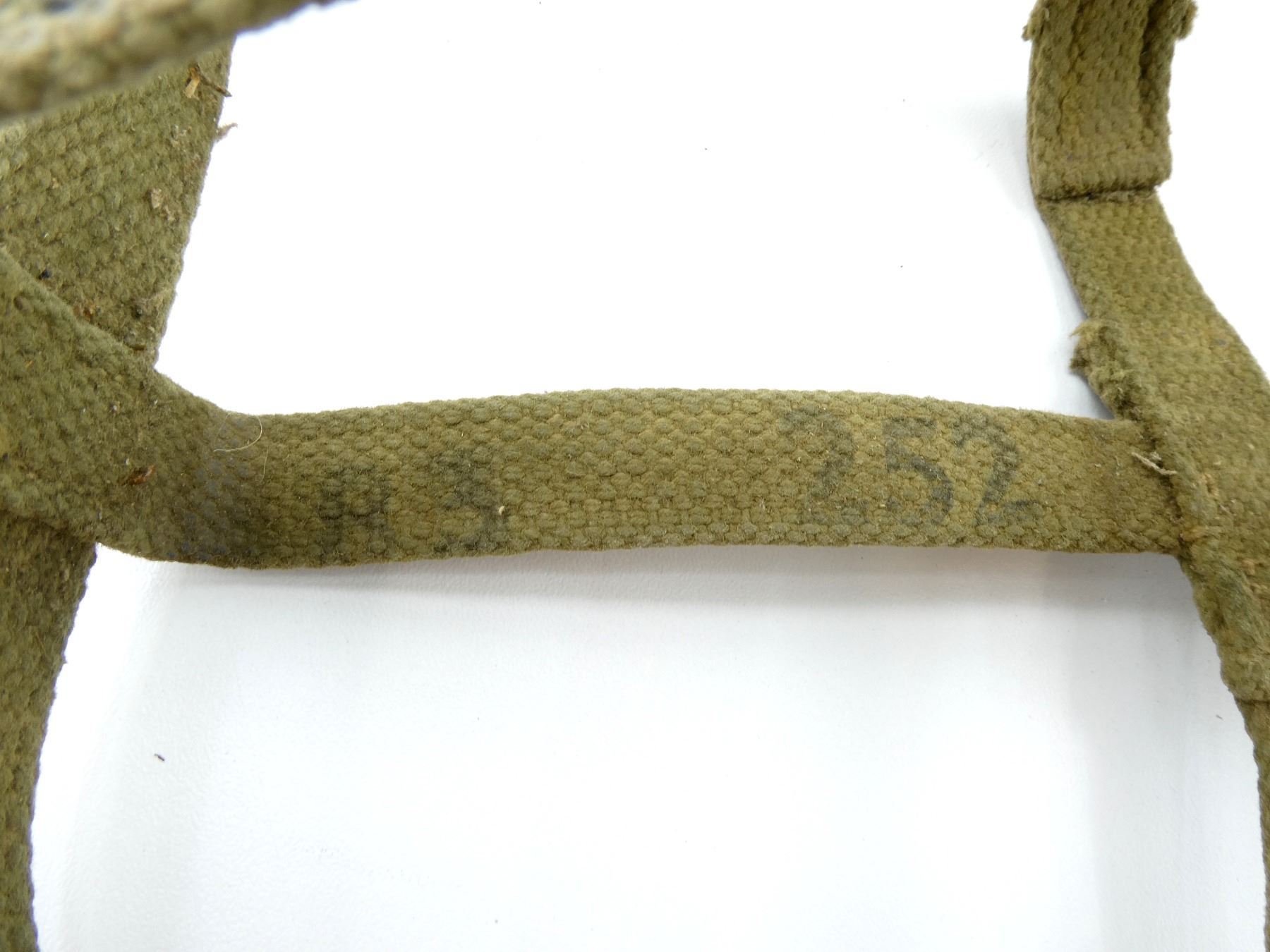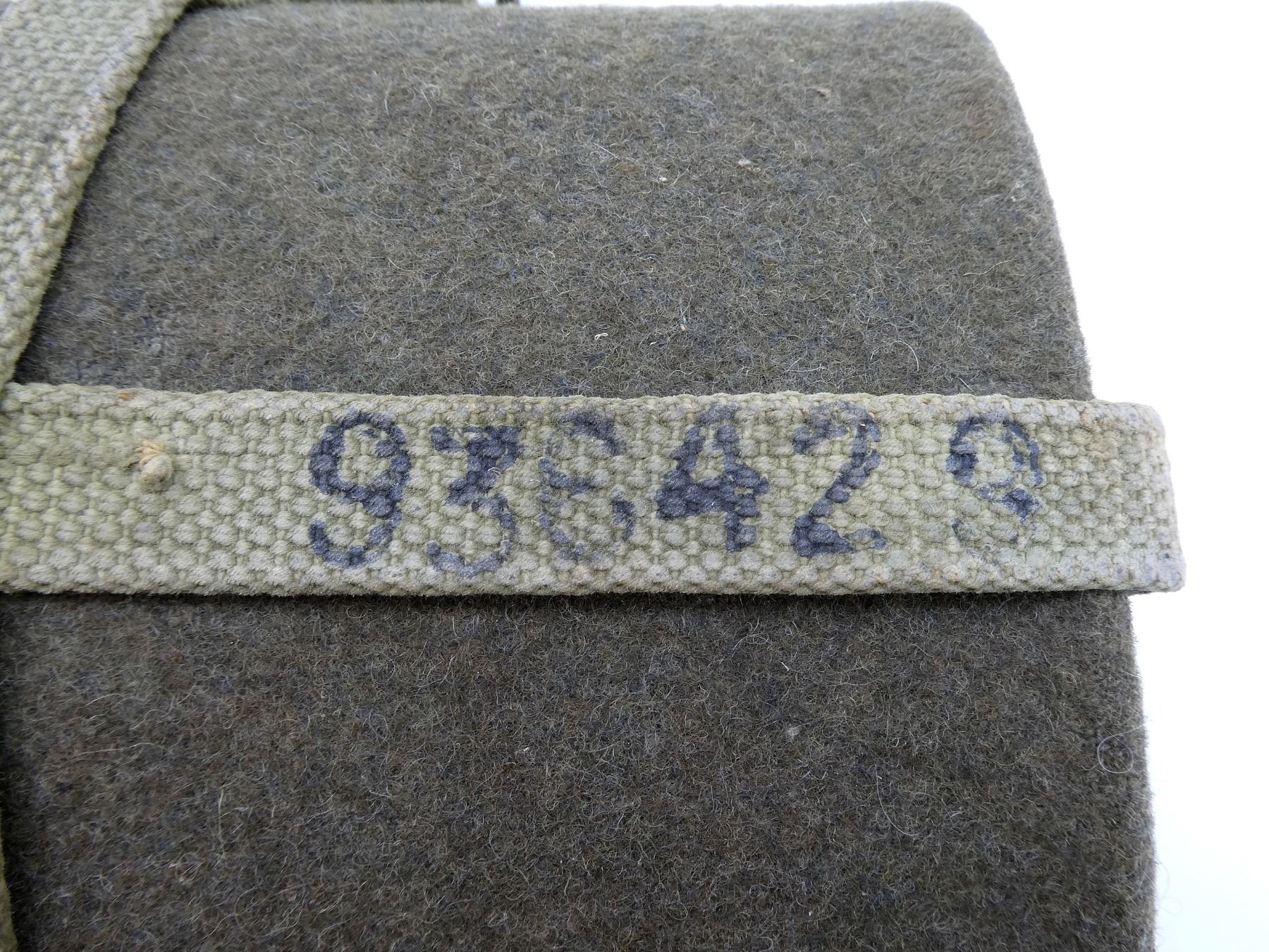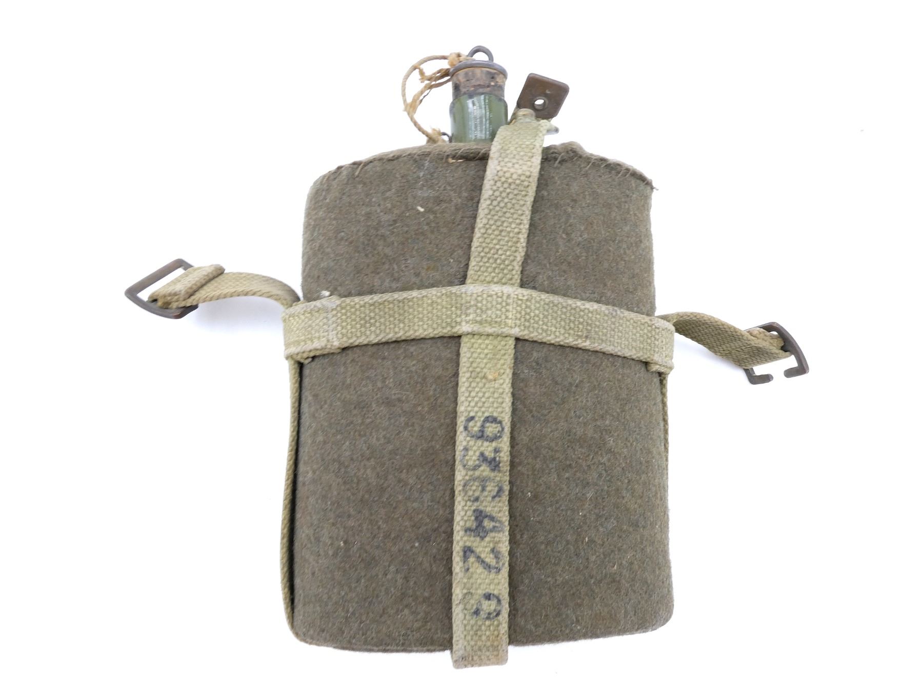(1) WOOL / FELT COVERED GREEN ENAMELED METAL CANTEEN WITH CORK / METAL STOPPER, GREEN P37 WEB CANVAS SKELETON CARRIER MARKED: "936429", "83", "252", SHOWS AGE / WEAR. SEE PHOTOS.