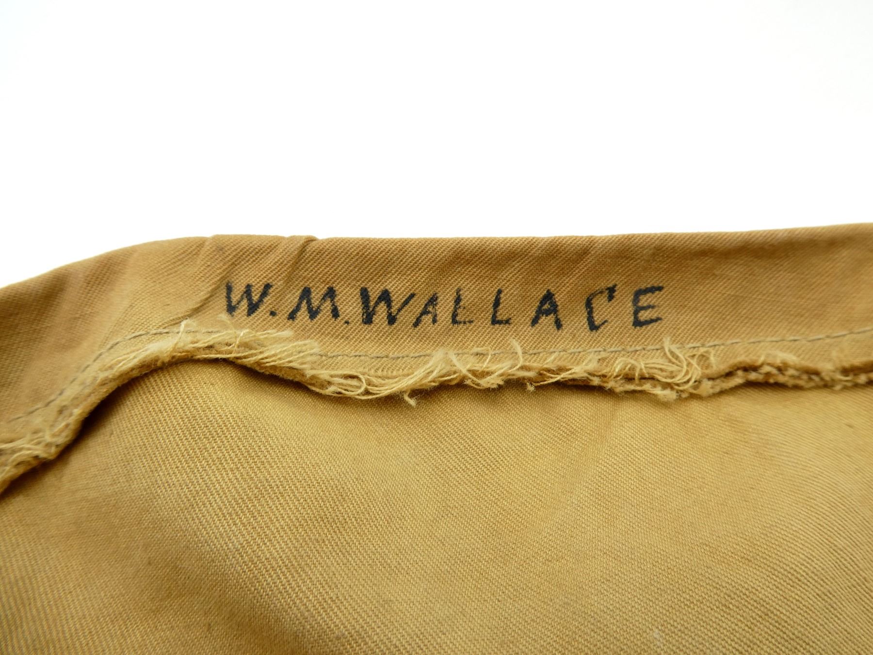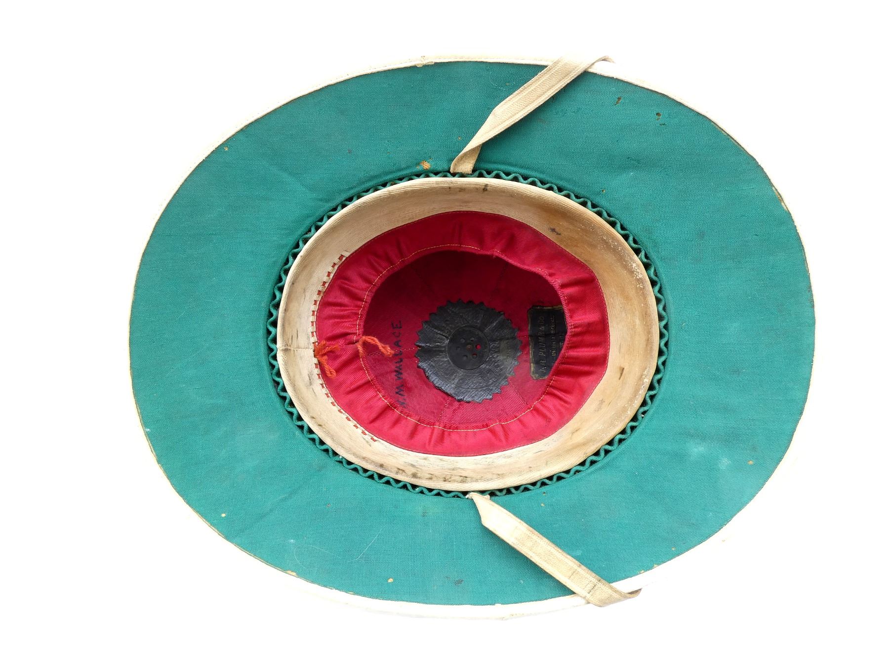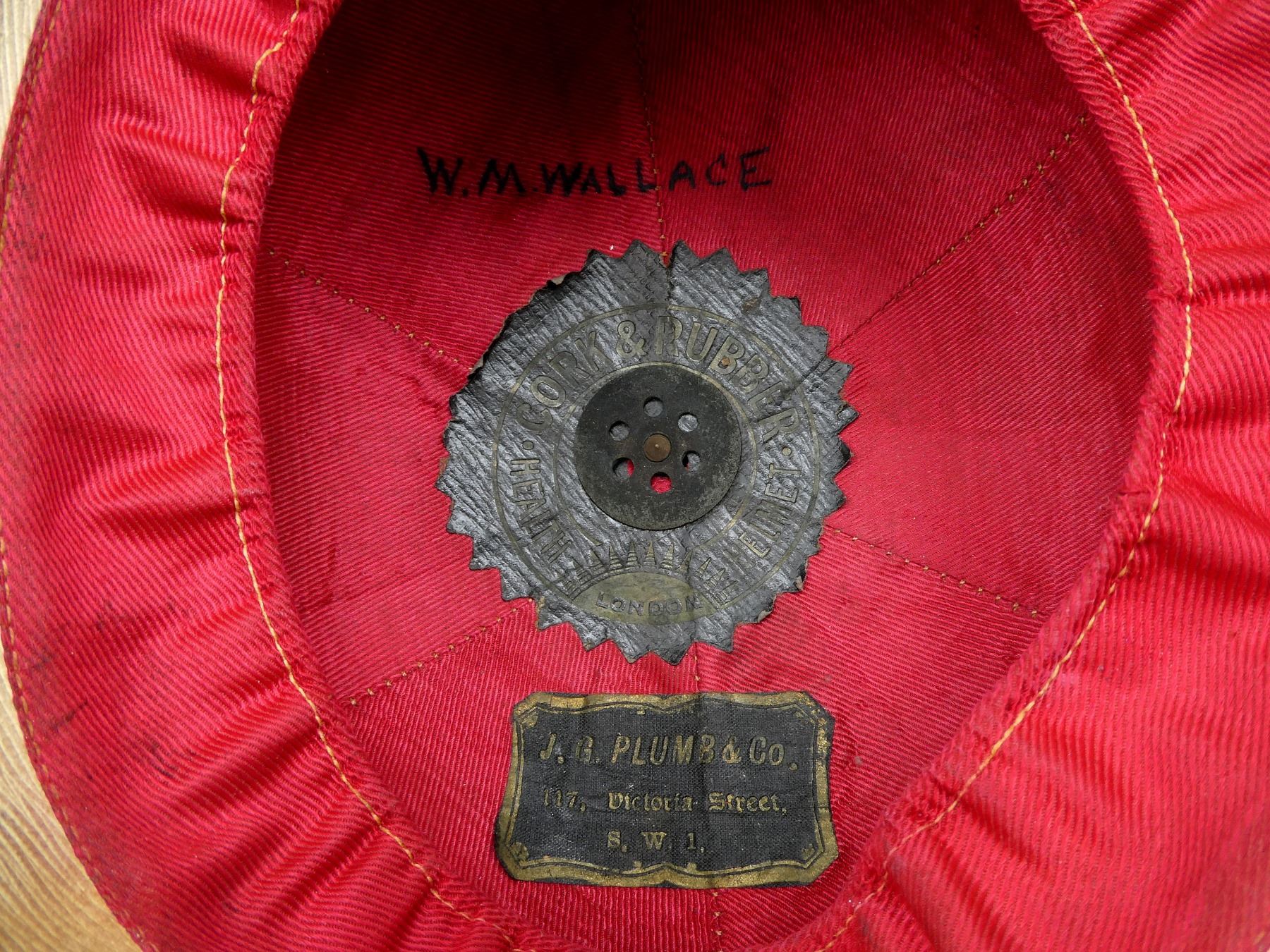 (1) TAN COTTON AND/OR CANVAS WOLSELEY PATTERN PITH / SUN HELMET, TAN LEATHER CHIN STRAP, INSIDE MARKED: "CORK & RUBBER, HEALTH HELMET, LONDON", "J.G. PLUMB & CO., 117, VICTORIA STREET, S.W.1.", HAND-WRITTEN MARKED: "W.M.WALLACE", TAN LEATHER HEAD BAND, LEATHER IS SOFT, RED SATIN-LIKE INTERIOR, GREEN COTTON / LINEN LINING ON UNDER-SIDE OF BRIM, SOME MOTH HOLES, SIZE UNKNOWN, COTTON PUGGAREE, COTTON VENT, SHOWS AGE / WEAR & (1) TAN CLOTH HELMET COVER, HAND-WRITTEN MARKED: "W.M.WALLACE", RED DRAWSTRING TO TIGHTEN, SHOWS AGE / WEAR. SEE PHOTOS.