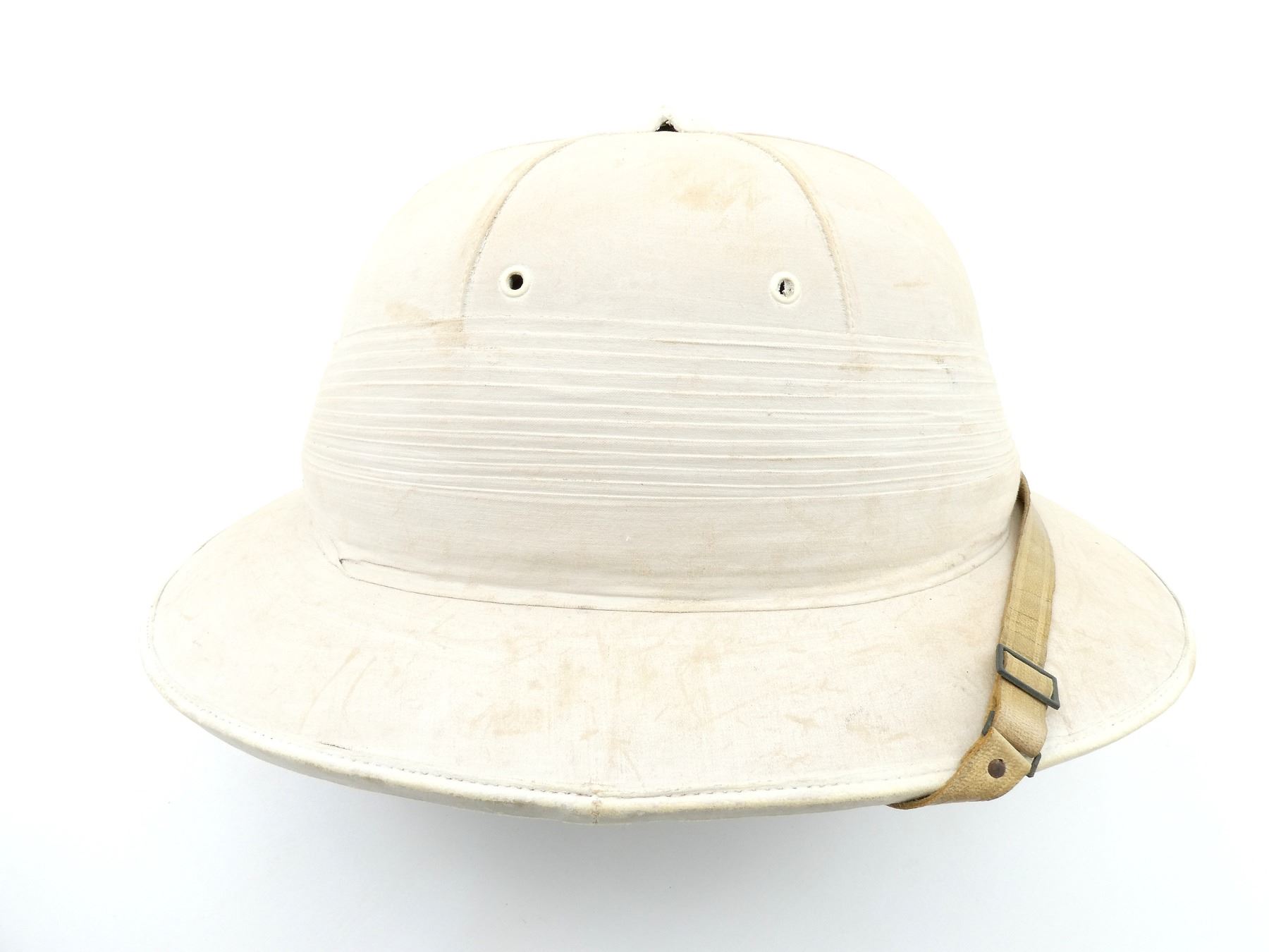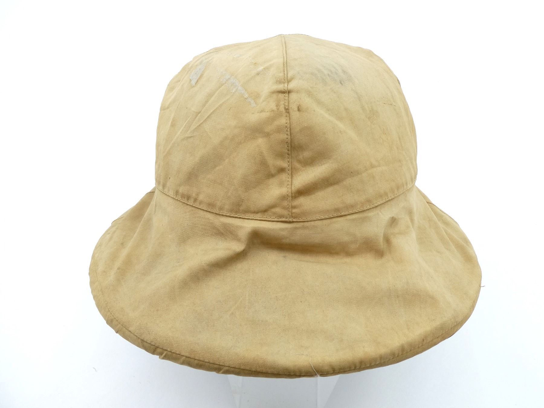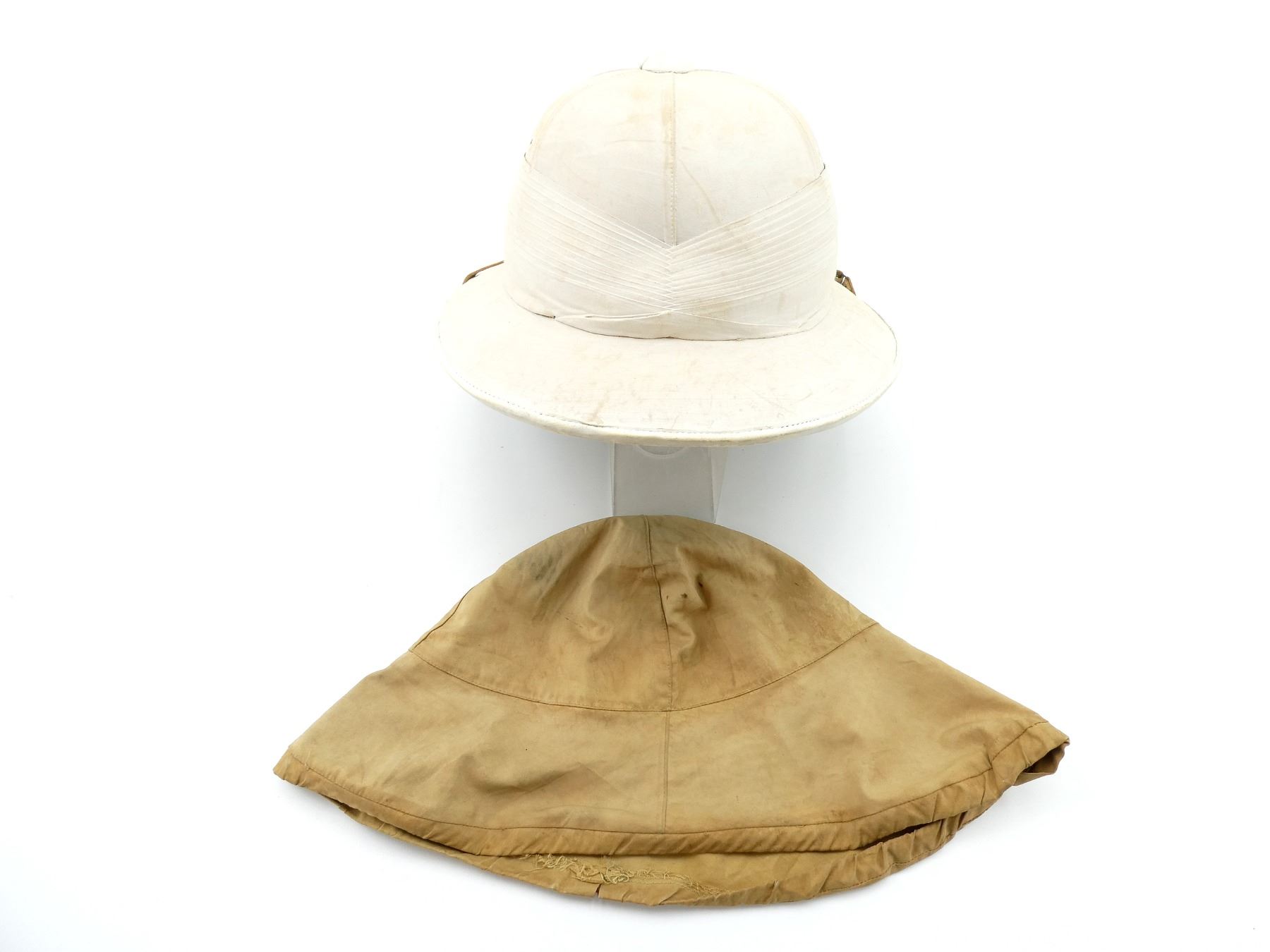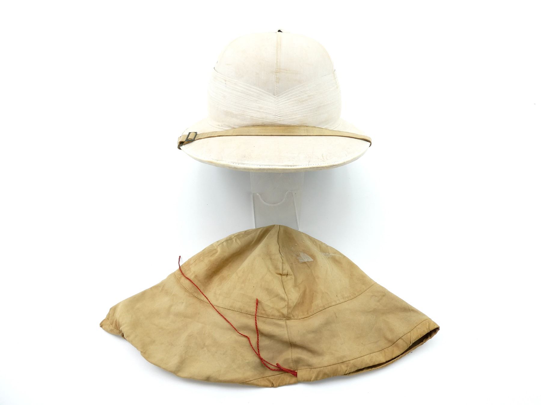 (1) TAN COTTON AND/OR CANVAS WOLSELEY PATTERN PITH / SUN HELMET, TAN LEATHER CHIN STRAP, INSIDE MARKED: "CORK & RUBBER, HEALTH HELMET, LONDON", "J.G. PLUMB & CO., 117, VICTORIA STREET, S.W.1.", HAND-WRITTEN MARKED: "W.M.WALLACE", TAN LEATHER HEAD BAND, LEATHER IS SOFT, RED SATIN-LIKE INTERIOR, GREEN COTTON / LINEN LINING ON UNDER-SIDE OF BRIM, SOME MOTH HOLES, SIZE UNKNOWN, COTTON PUGGAREE, COTTON VENT, SHOWS AGE / WEAR & (1) TAN CLOTH HELMET COVER, HAND-WRITTEN MARKED: "W.M.WALLACE", RED DRAWSTRING TO TIGHTEN, SHOWS AGE / WEAR. SEE PHOTOS.