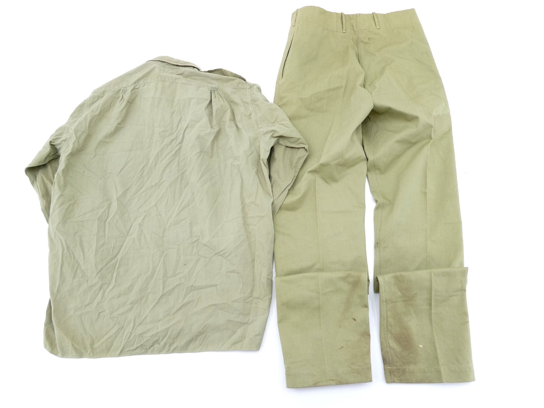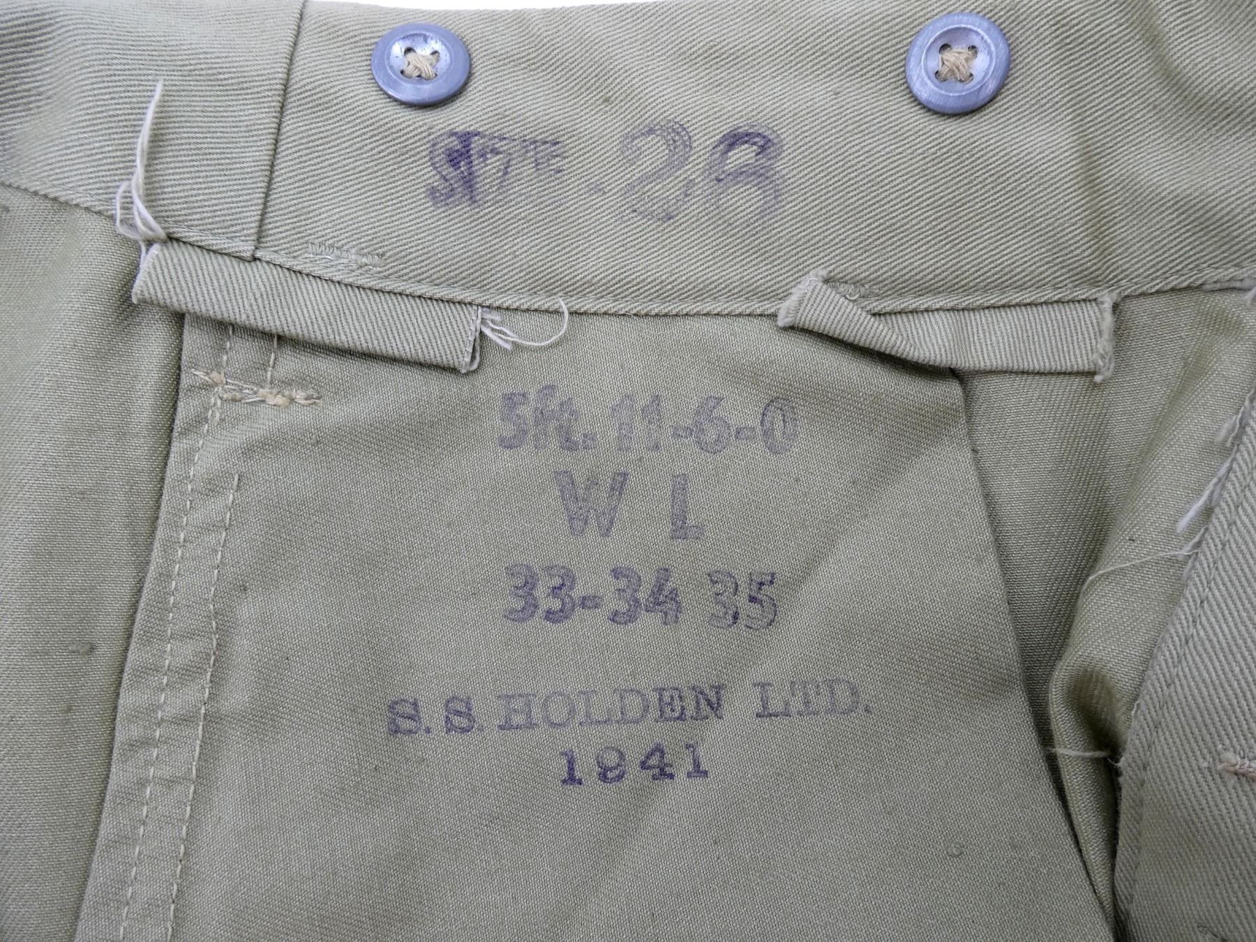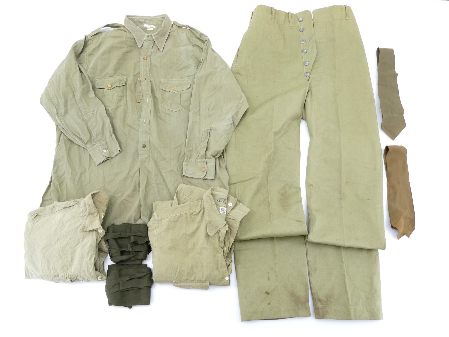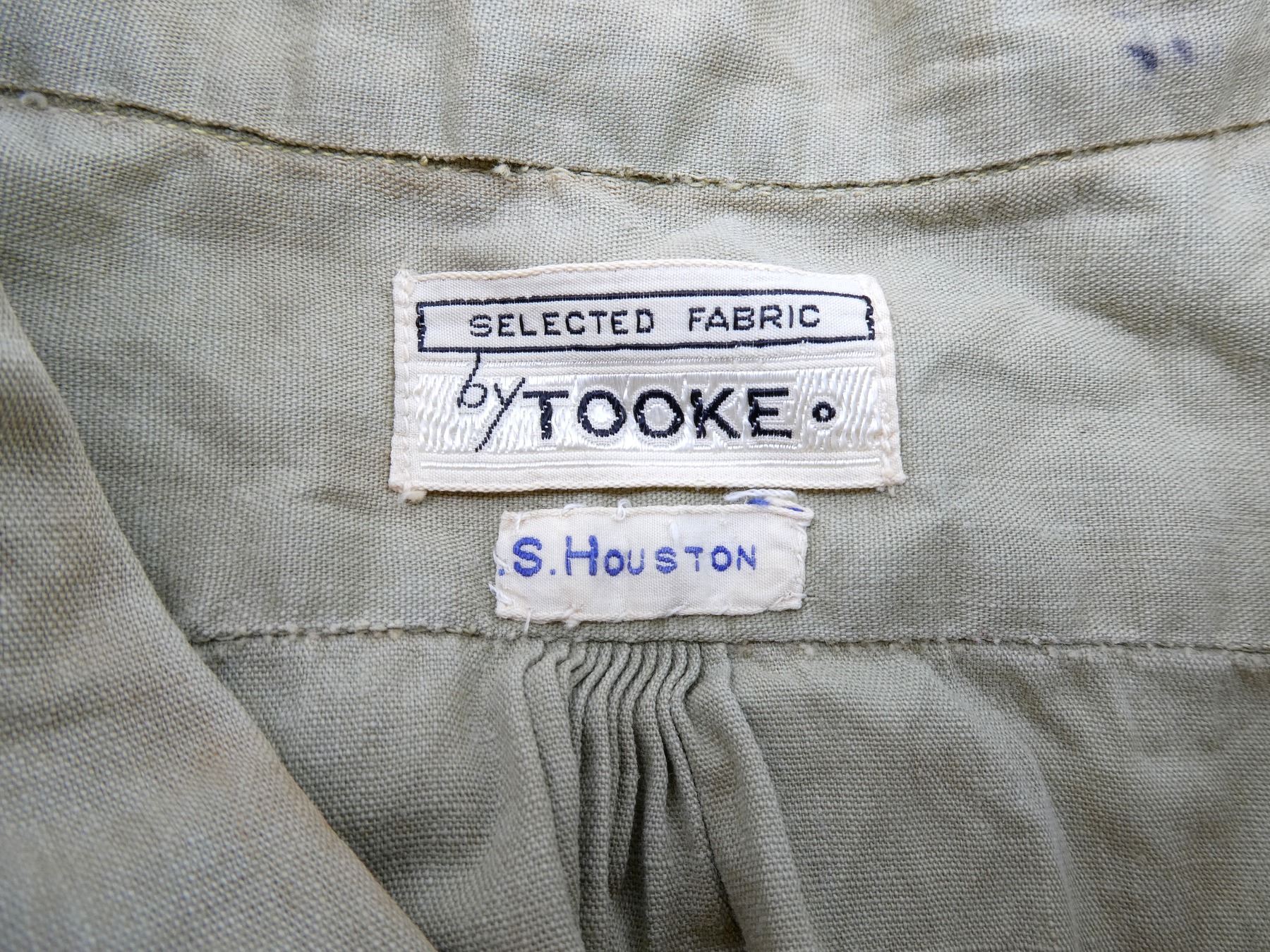 LOT INCLUDES; (1) PAIR OF GREEN CANVAS PANTS, MARKED: "SIZE-26, 5FT. 11-6-0, W 33-34, L 35, S.S. HOLDEN LTD., 1941" WITH C-BROAD ARROW, BUTTON-FLY, (3) GREEN COTTON / LINEN LONG-SLEEVED SHIRTS, NAMED TO: "S. HOUSTON", VARIOUS MARKINGS ALONG COLLARS, VARIOUS LABELS, BUTTON FRONTS, SHOWS AGE / WEAR, SHOULDER WIDTHS APPROX. 17.5", (1) PAIR OF GREEN WOOL PUTTEES, NO VISIBLE MARKINGS, APPROX. 4" WIDE & (2) TIES, GREEN / TAN, ONE MARKED: "ALL SILK, MADE IN ENGLAND" WITH VARIOUS OTHER MARKINGS, NO VISIBLE MARKINGS ON OTHER. SEE PHOTOS.