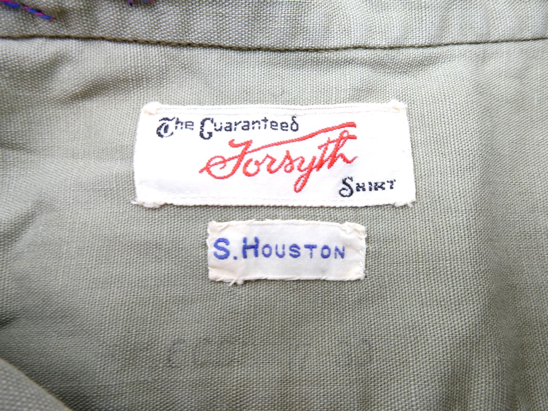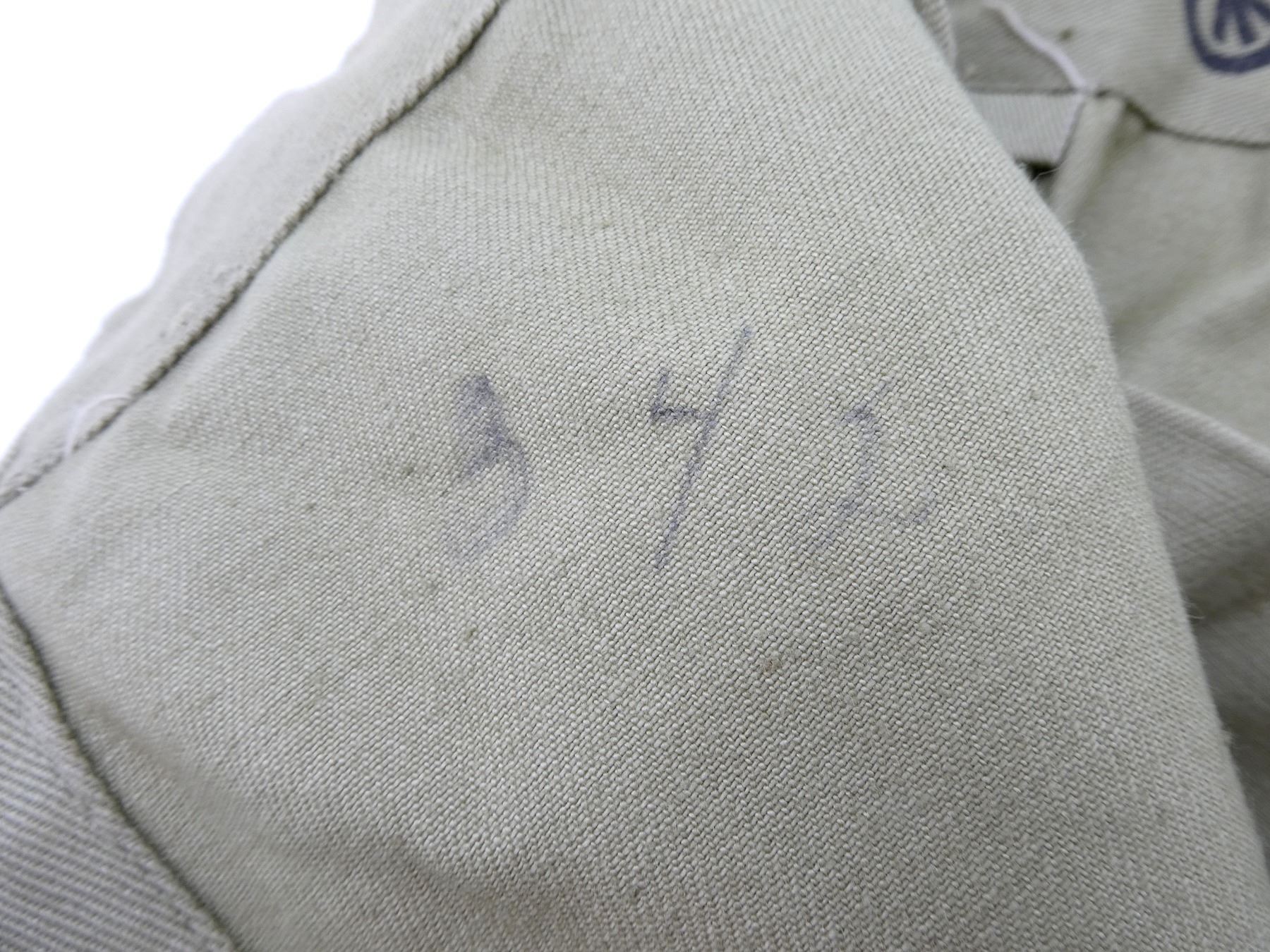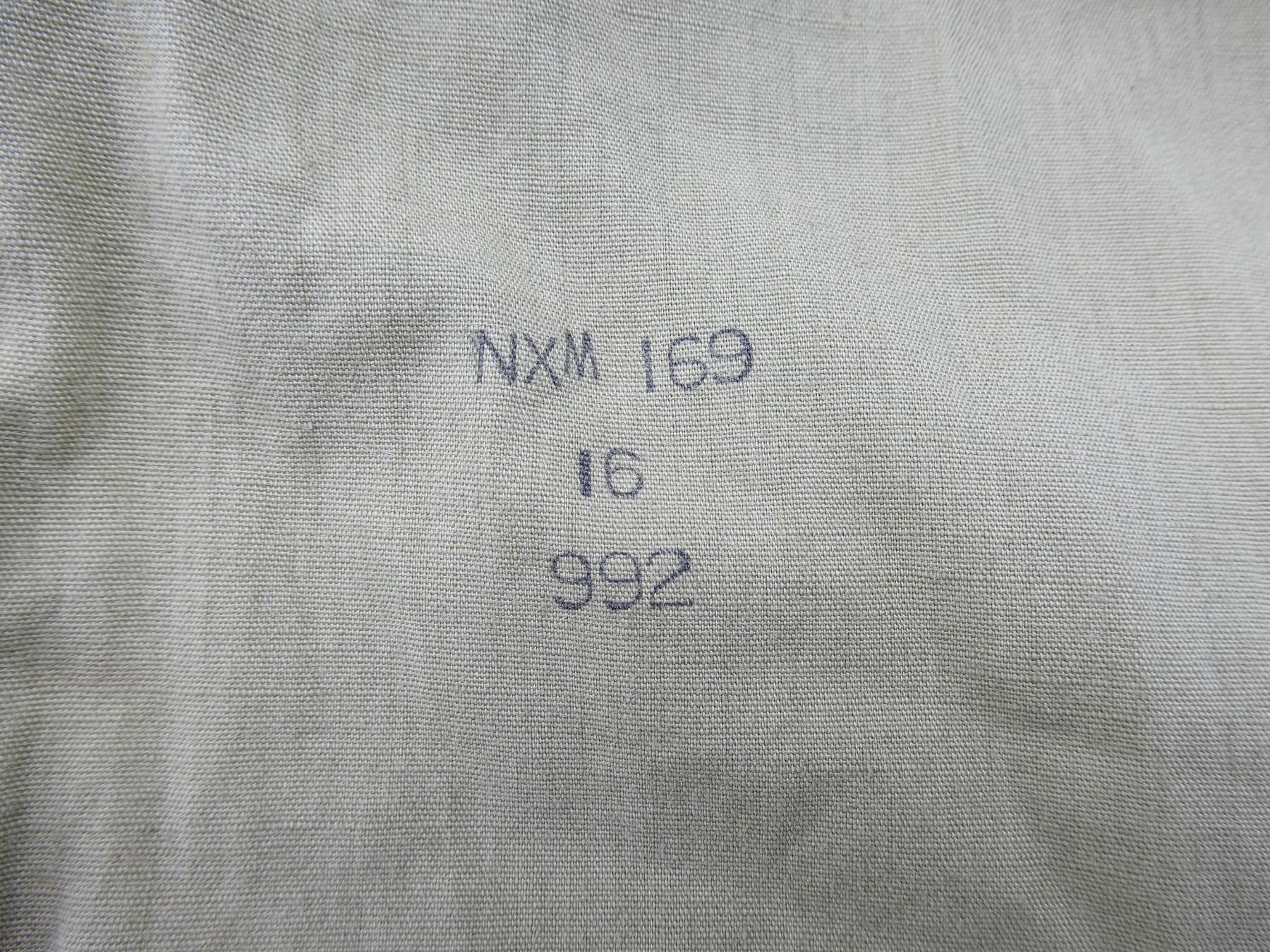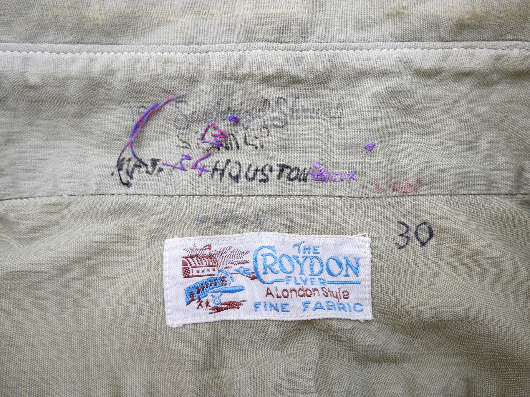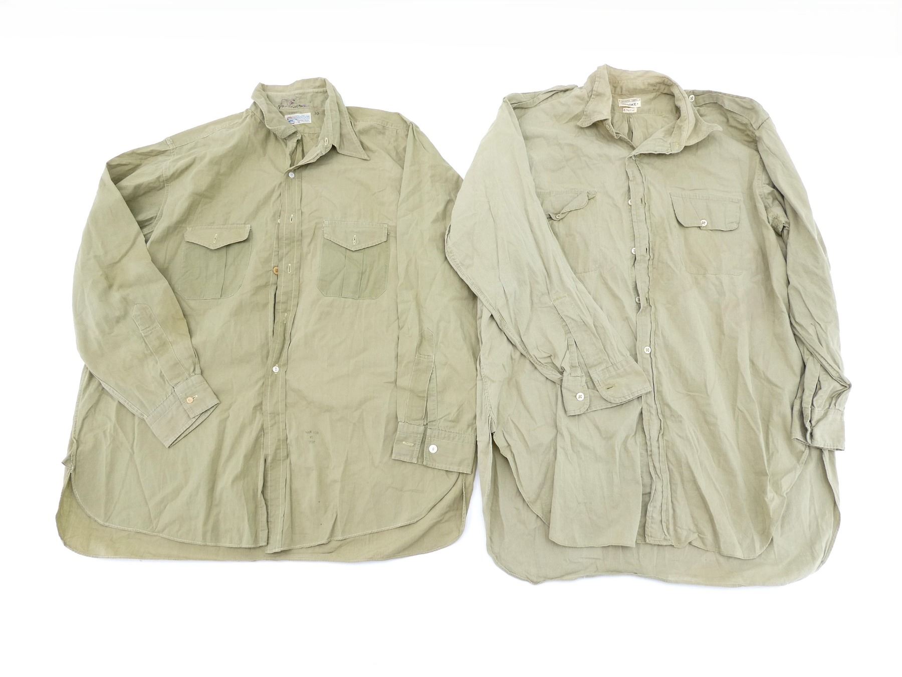 LOT INCLUDES; (1) PAIR OF GREEN CANVAS PANTS, MARKED: "SIZE-26, 5FT. 11-6-0, W 33-34, L 35, S.S. HOLDEN LTD., 1941" WITH C-BROAD ARROW, BUTTON-FLY, (3) GREEN COTTON / LINEN LONG-SLEEVED SHIRTS, NAMED TO: "S. HOUSTON", VARIOUS MARKINGS ALONG COLLARS, VARIOUS LABELS, BUTTON FRONTS, SHOWS AGE / WEAR, SHOULDER WIDTHS APPROX. 17.5", (1) PAIR OF GREEN WOOL PUTTEES, NO VISIBLE MARKINGS, APPROX. 4" WIDE & (2) TIES, GREEN / TAN, ONE MARKED: "ALL SILK, MADE IN ENGLAND" WITH VARIOUS OTHER MARKINGS, NO VISIBLE MARKINGS ON OTHER. SEE PHOTOS.