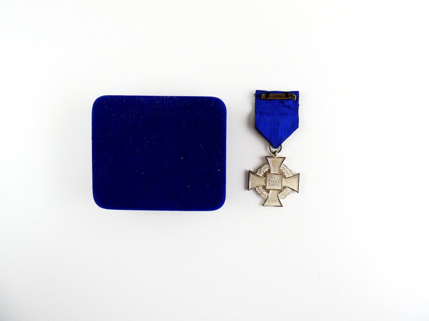 (1) 2ND CLASS 25 YEARS OF FAITHFUL SERVICE MEDAL WITH RIBBON, SILVER CROSS WITH SILVER WREATH, BLACK ENAMELED SWASTIKA IN CENTER, PIN BACKING ON RIBBON INTACT, NO VISIBLE MARKER'S MARK ON RIBBON LOOP. SEE PHOTOS.