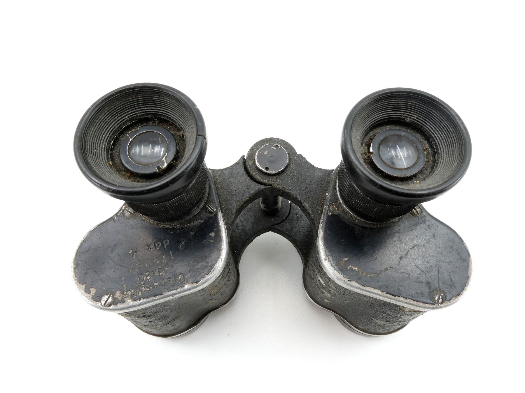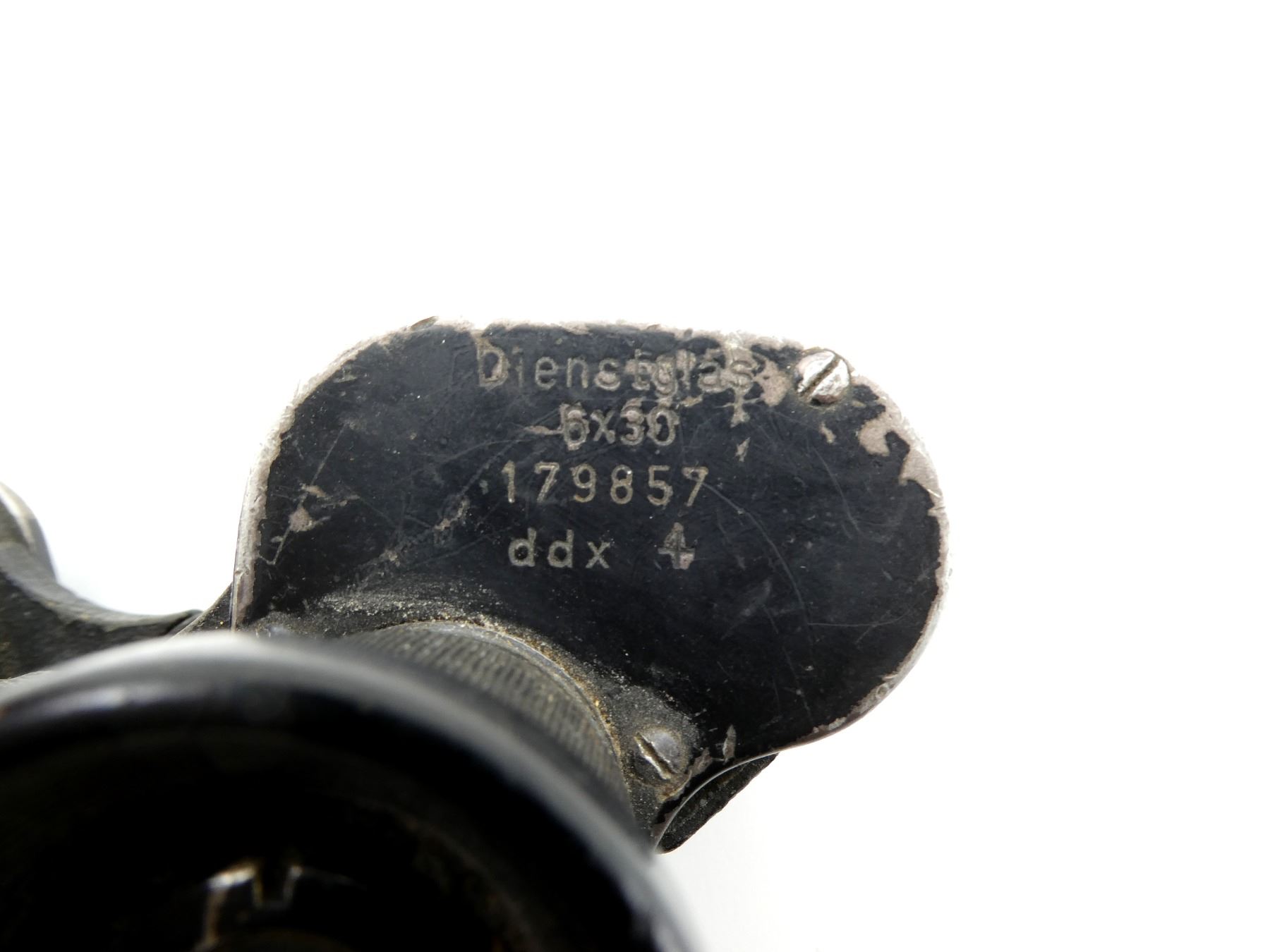 (1) SET OF BINOCULARS, SLIGHT DUST OTHER-WISE CLEAR OPTICS, LENSES INTACT, MAGNIFICATION RINGS ON LENSES TURN / WORK, BINOCULARS MARKED: "DIENSTGLAS, 6X30, 179857, DDX, +", SHOWS AGE / WEAR. SEE PHOTOS.