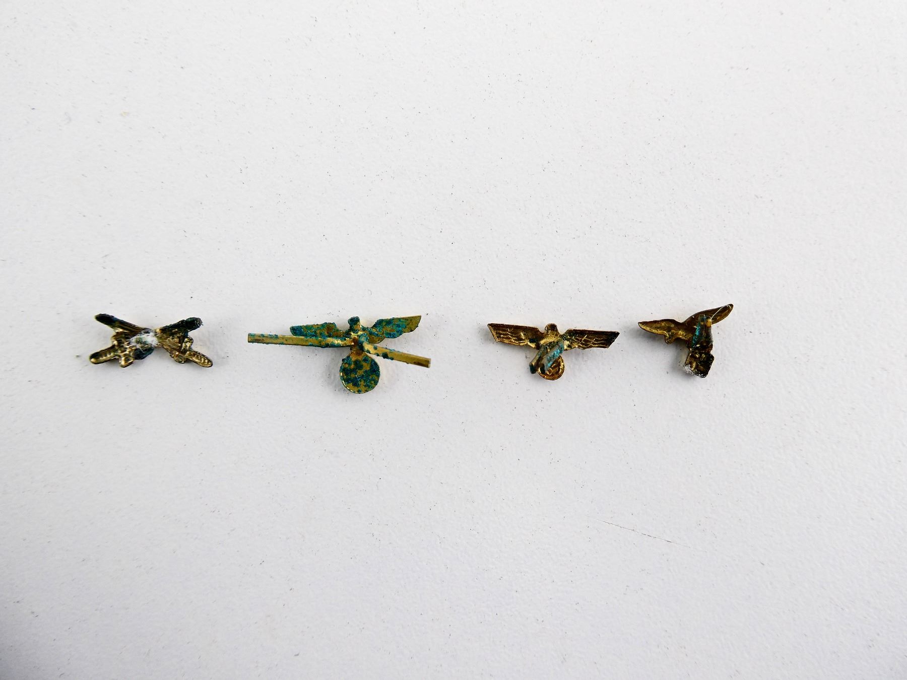 LOT INCLUDES; (2) BRASS / METAL EAGLE HOLDING SWASTIKA PINS, ONE IS MAGNETIC, ONE IS NOT, SHOWS AGE (SOME CORROSION), (1) BRASS / METAL LUFTWAFFE EAGLE PIN, MAGNETIC, SHOWS AGE (SOME CORROSION) & (1) BRASS / METAL CROSSED SWORDS PIN, MAGNETIC, SHOWS AGE (SOME CORROSION / PINS POSSIBLY PARTIALLY BROKEN). SEE PHOTOS.