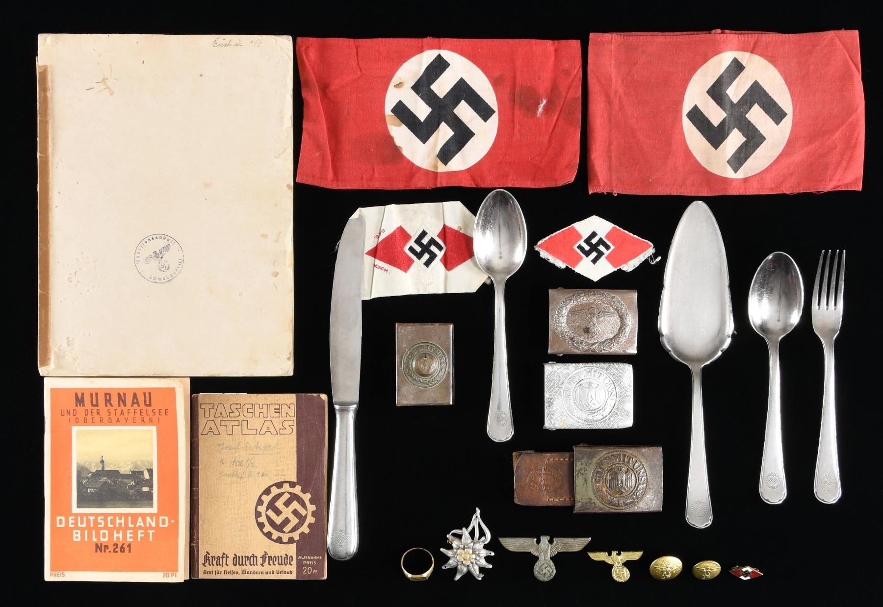 AND MORE. This varied lot includes 1 flatware group that includes 2 tablespoon, 1 folk, 1 knife, and 1 pie server. The back of the flatware is marked "BSF 90" & "HOTELBETRIEBS ges. m. b. H.". / 2 party armbands. / 1 steel Army belt buckle with leather tab. / 1 aluminum Army belt buckle. / 1 steel Teno belt buckle. / 1 DAF pocket atlas. / 1 booklet titled "MURNAU". / 2 HJ bevo weave sleeve diamonds. / 2 political leader buttons. / 1 sew-on edelweiss. / 1 WWI match safe. / 1 enamel HJ diamond. / 1 eagle from a political leader's collar tab. / 1 police cap eagle. / 1 brass souvenir ring with German helmets on the side that reads "WEST WALL 1939/40". / 1 book, missing it's covers, titled "HITLER wie ihn keiner kennt". CONDITION: items generally show light wear unless otherwise noted. Belt buckles do show oxidation. Armbands have staining. (02-24045/BF). $600-800.