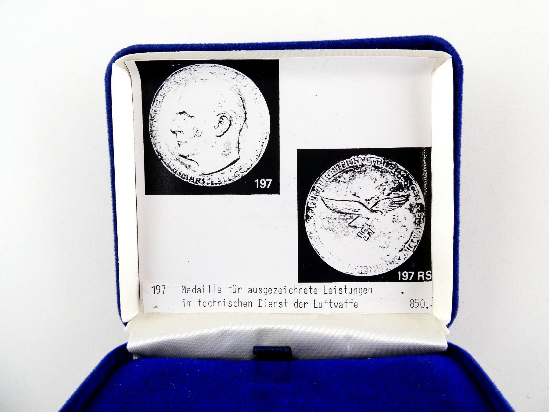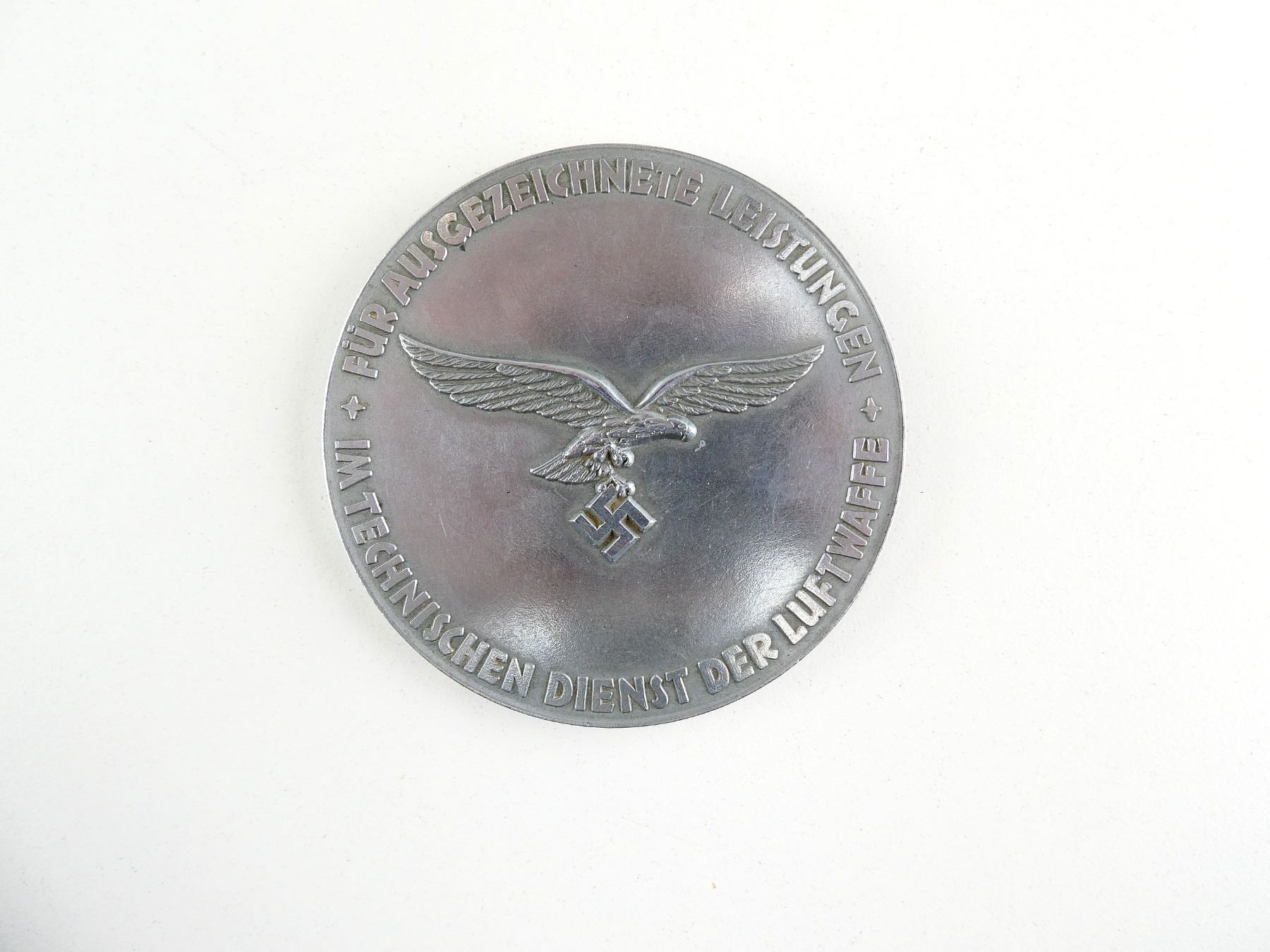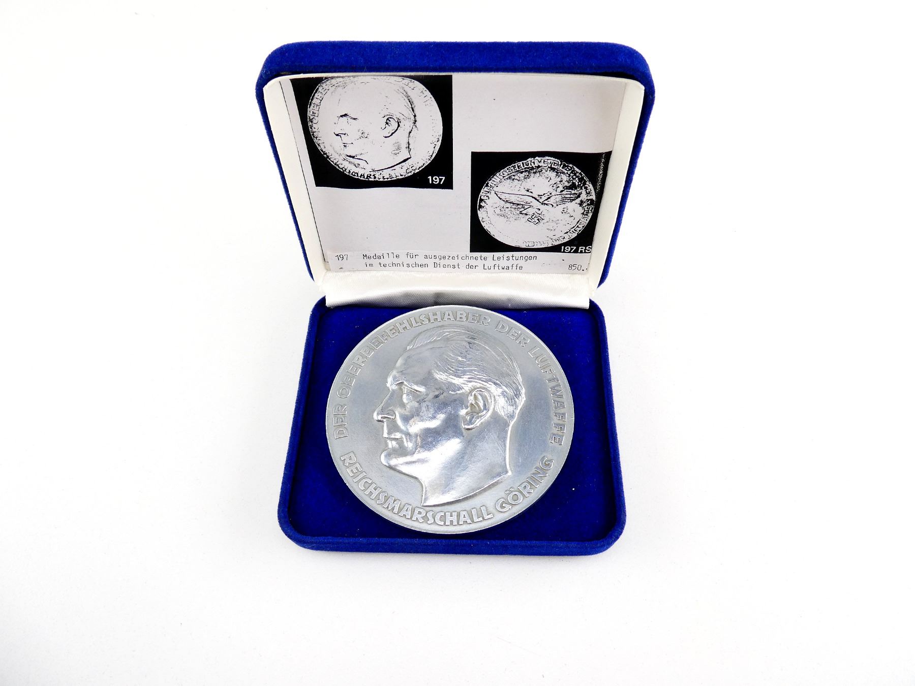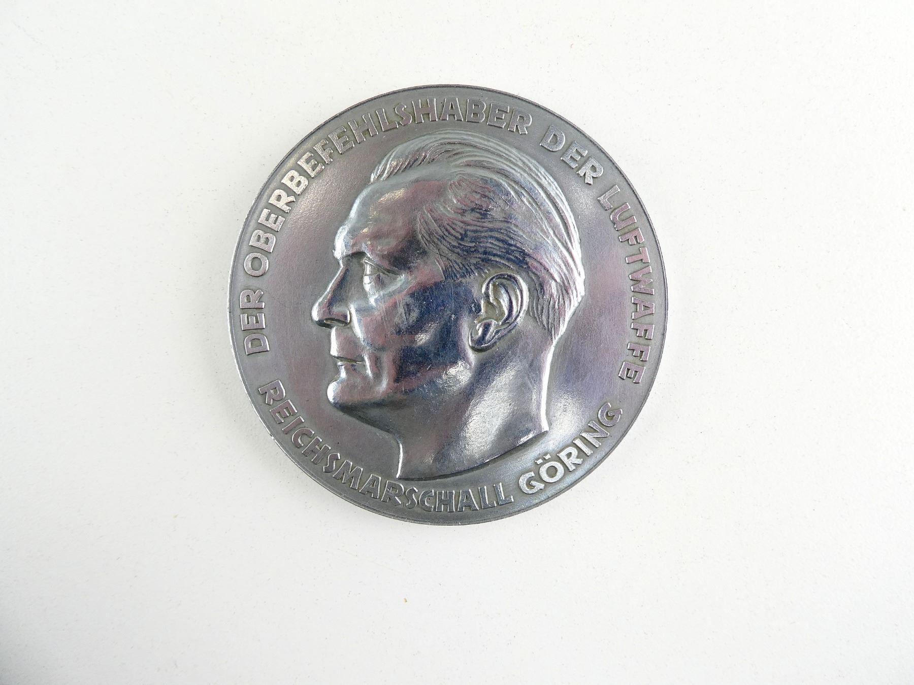 (1) HERMAN GORING LUFTWAFFE MEDAL, NON-MAGNETIC, SILVER FINISH, FRONT MARKED: "DER OBERBEFEHLSHABER DER LUFTWAFFE, REICHSMARSCHALL GORING" WITH GORING'S PROFILE, BACK MARKED: "FUR AUSGEZEICHNETE LEISTUNGEN, IM TECHNISCHEN DIENST DER LUFTWAFFE" WITH FLYING EAGLE HOLDING SWASTIKA, NO OTHER VISIBLE MARKINGS, IN BLUE VELVET CASE, MEDAL APPROX. 75MM DIA. & APPROX. 3.1MM THICK. SEE PHOTOS.