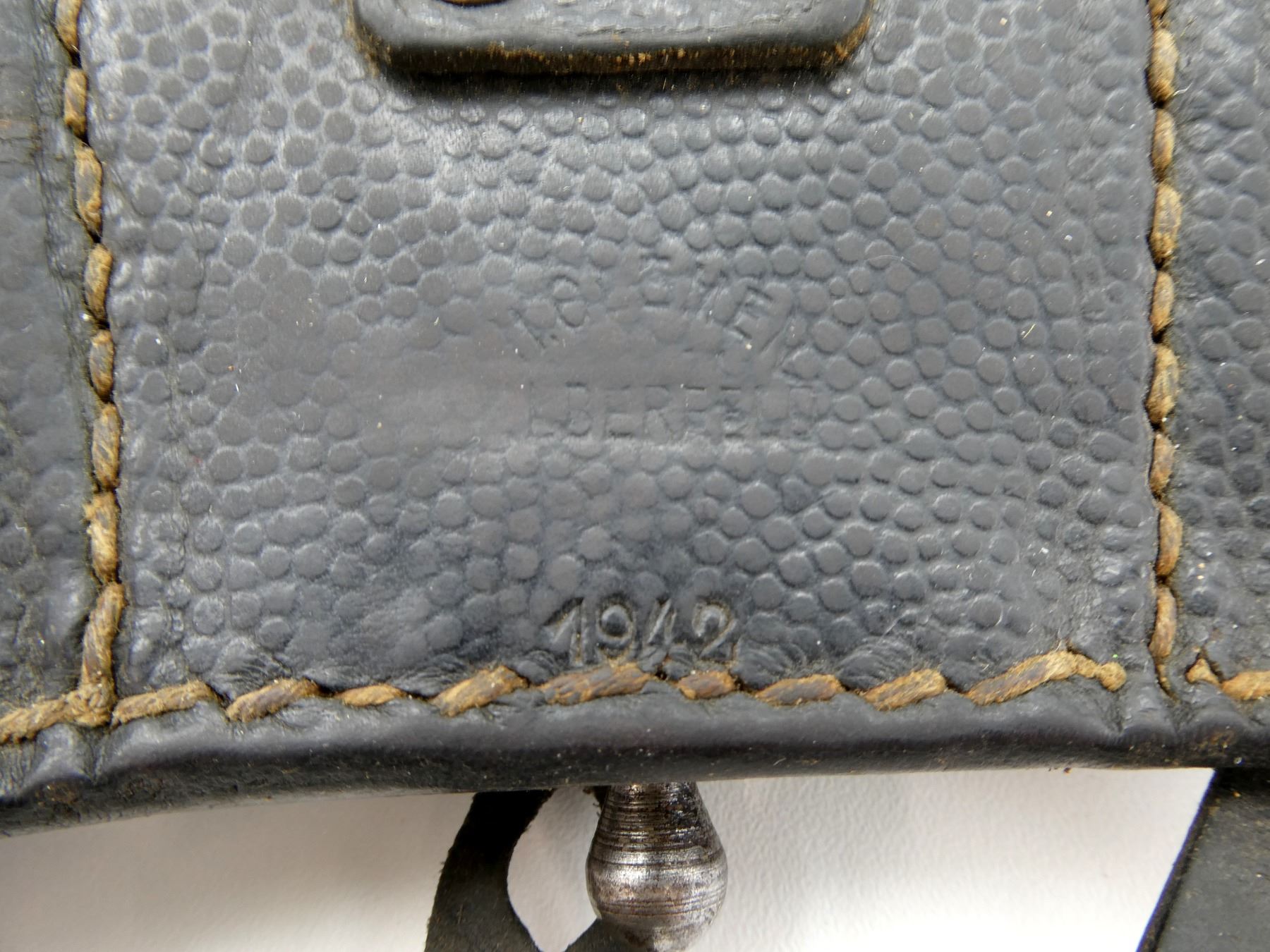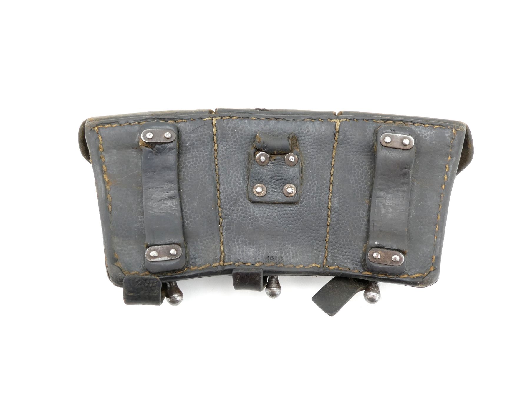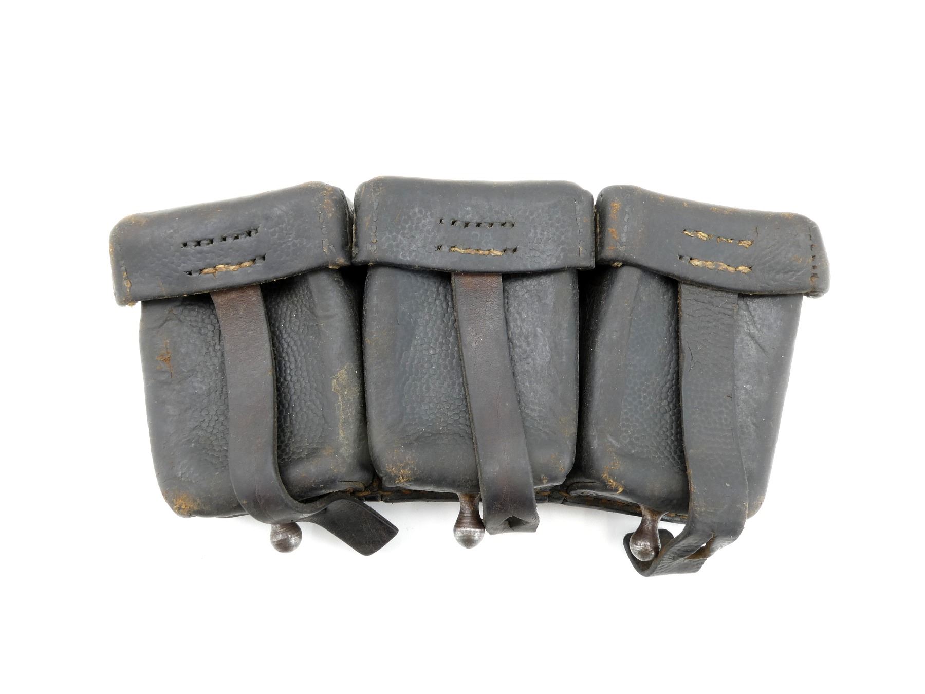 (1) FITS 8MM MAUSER ON STRIPPER CLIPS, PEBBLED BLACK / BROWN LEATHER 3-POCKET AMMO POUCH, MARKED: "H.CLEMEN, .LBERFELD, 1942", TWO BELT LOOPS, MISSING METAL RING ON BACK, SHOWS AGE / WEAR / TEAR. SEE PHOTOS.