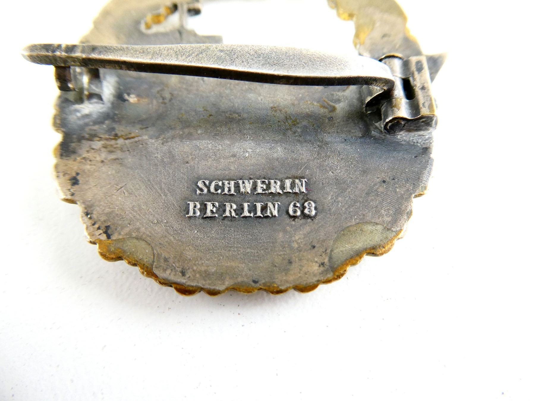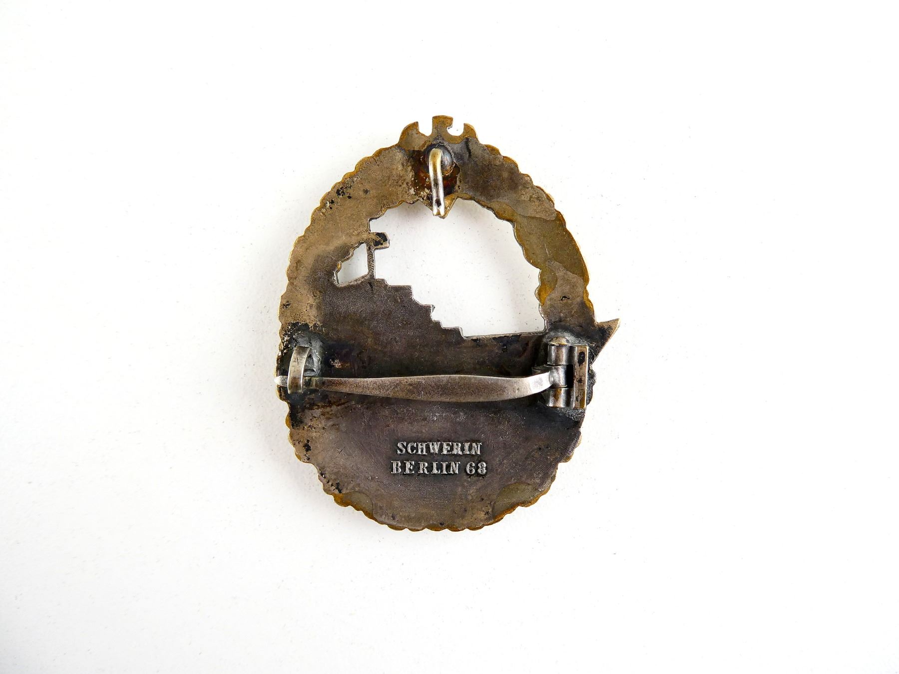 (1) NON-MAGNETIC METAL BADGE, WREATH HAS GOLD FINISH, REMNANTS OF GOLD FINISH ON DESTROYER, INTACT FLAT TAPERED PIN BACKING, BACK MARKED: "SCHWERIN, BERLIN 68". SEE PHOTOS.