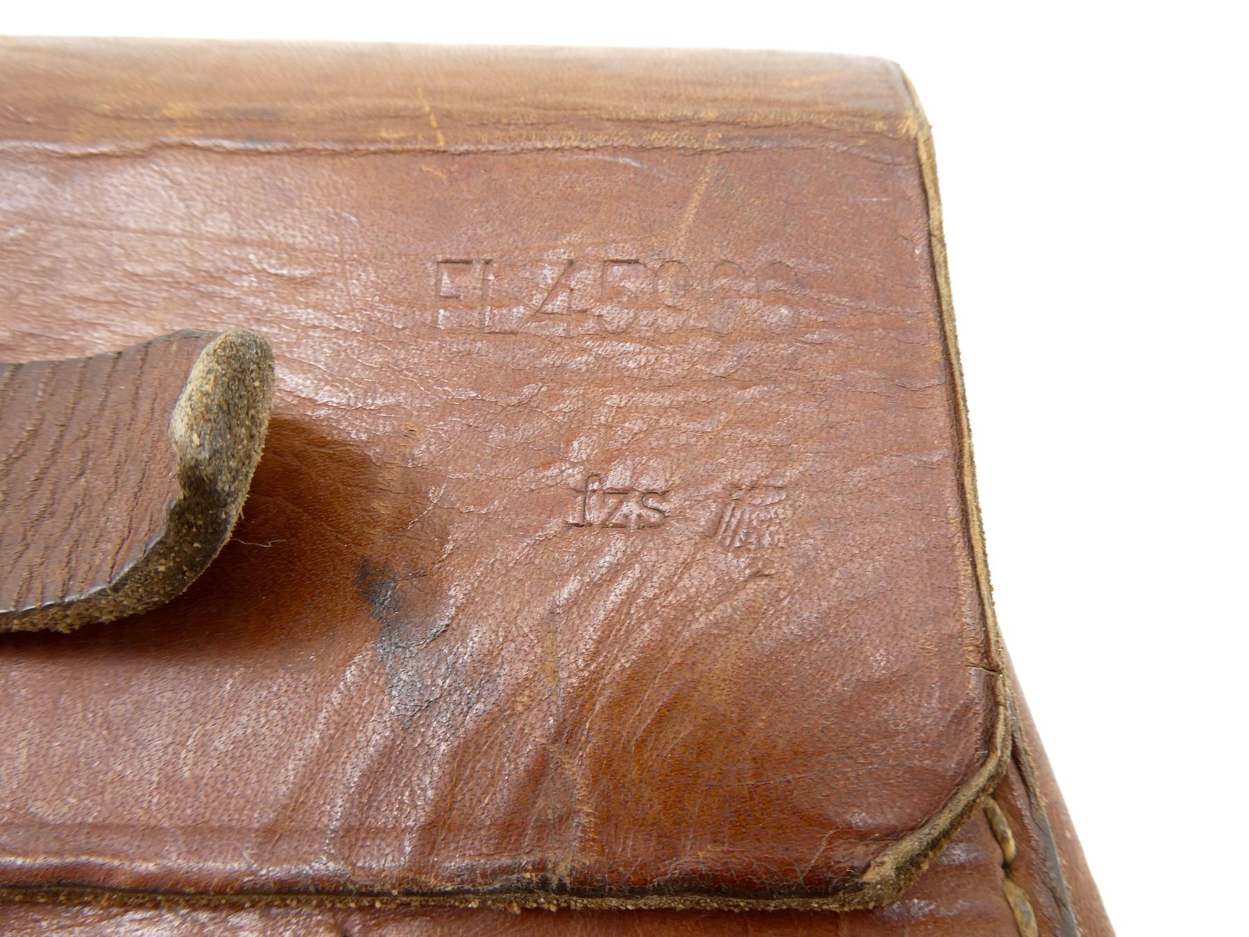(1) BROWN LEATHER GUNNERS POUCH FOR THE MG15 GROUND MOUNT, MISSING INNER DIVIDERS / POCKETS, FLAP MARKED: "FL45966", "FZS (KRIEGHOFF WEAPONS FACTORY-HENRICH KREIGHOFF WAFFEN FABRIK SUHL)", EAGLE SYMBOL OVER "2" (INSPECTION STAMP), LEATHER STRAP CLOSURE, TWO BELT LOOPS. SEE PHOTOS.