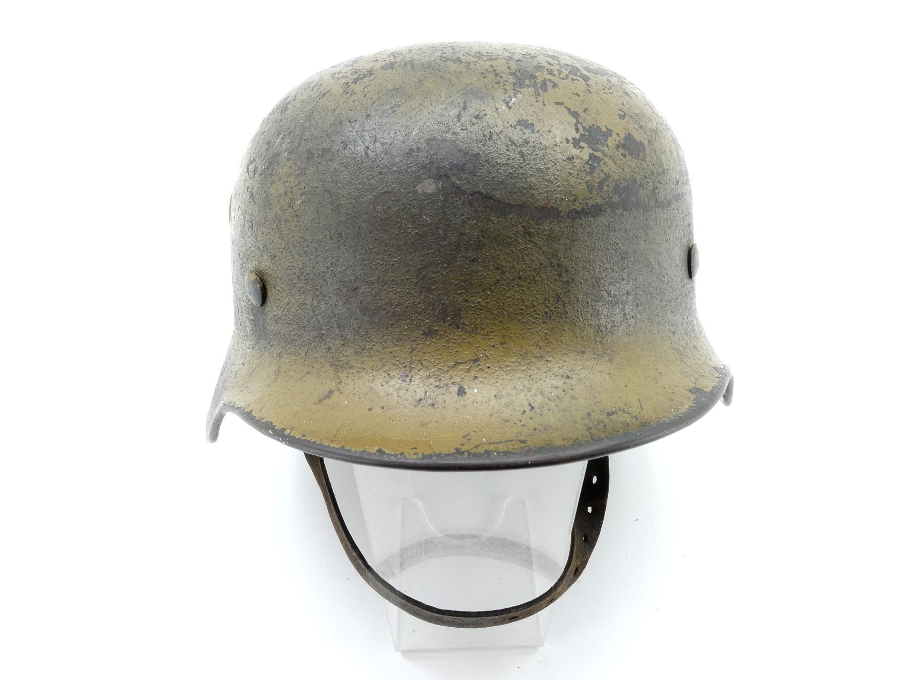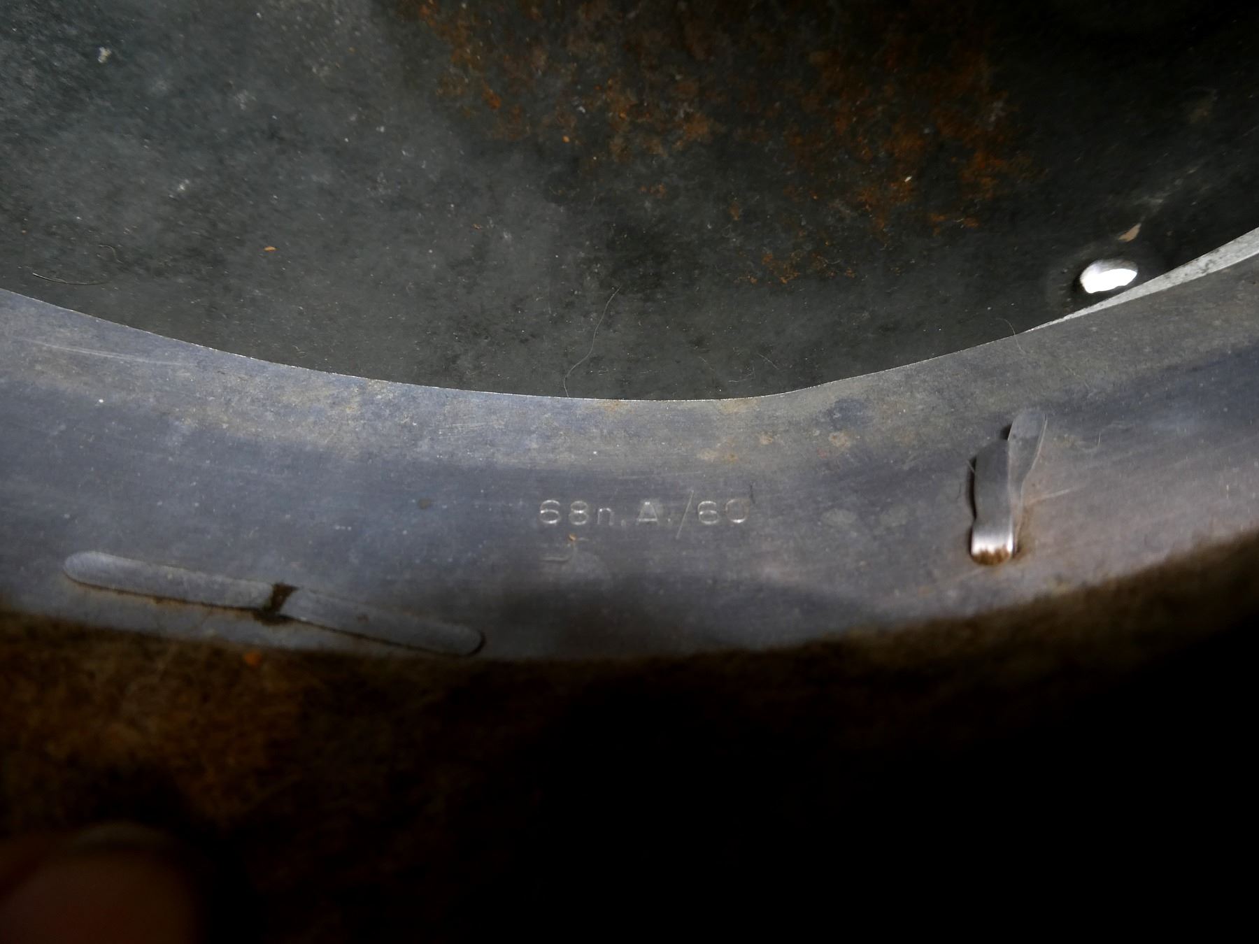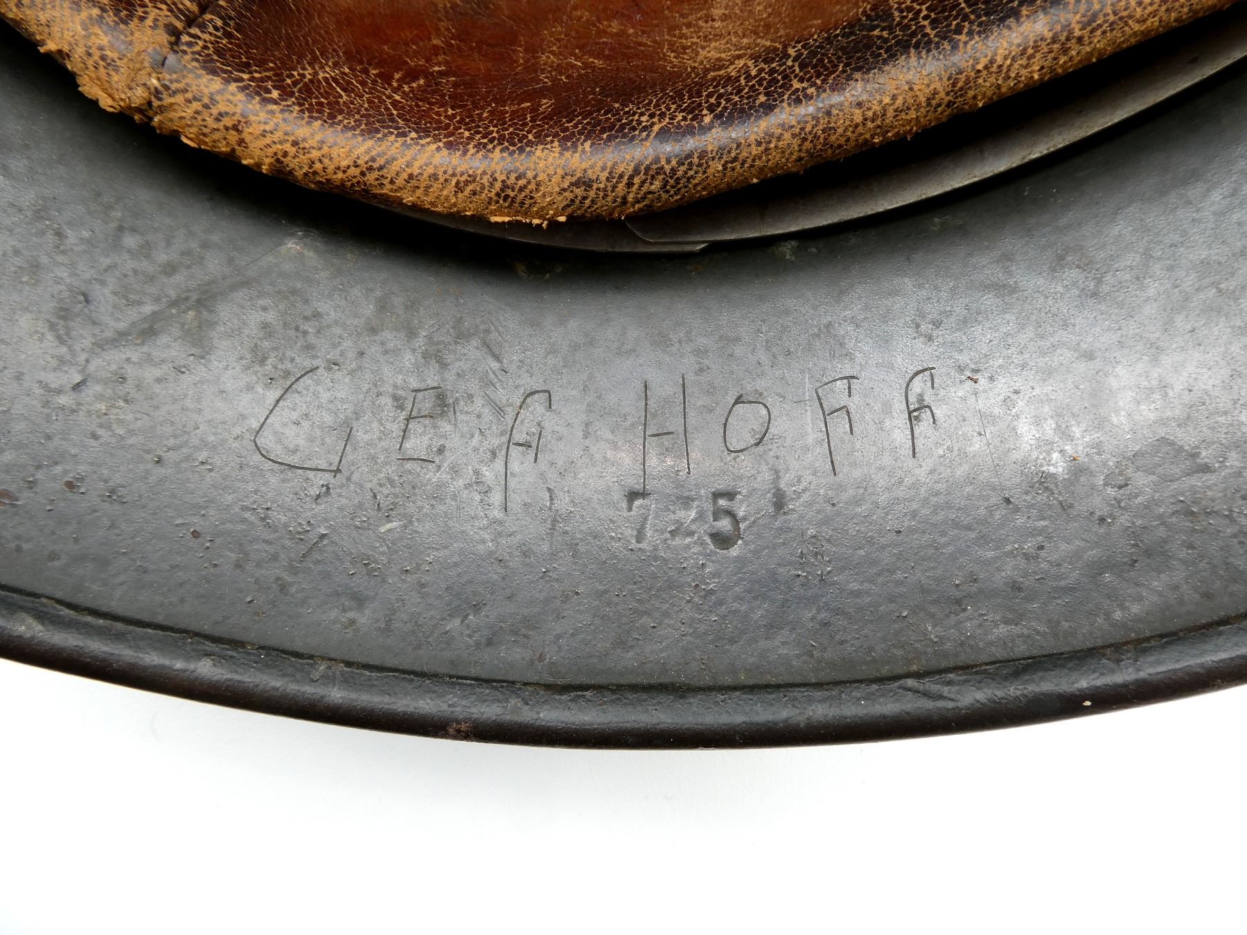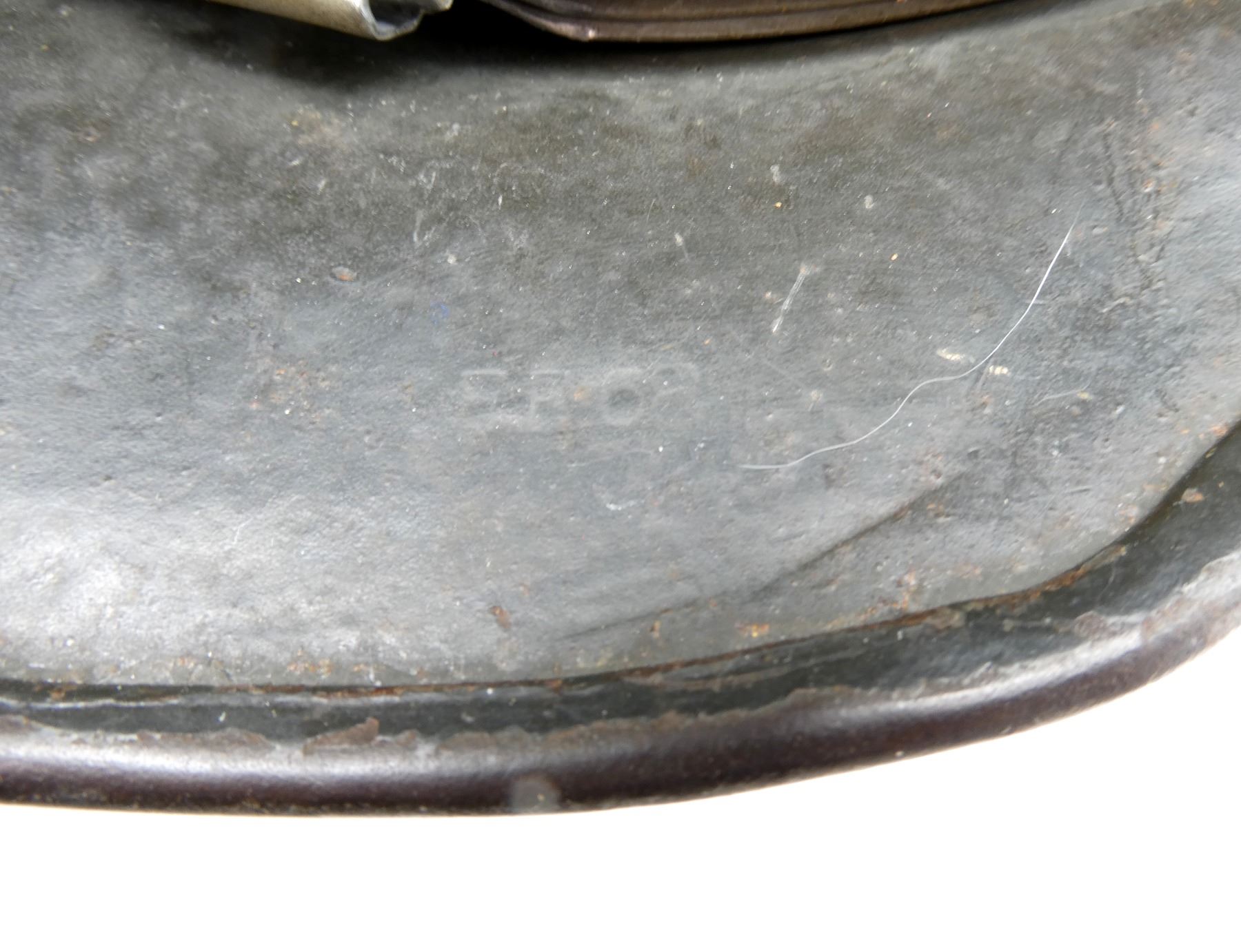 (1) GREEN / BROWN PAINTED HELMET WITH ONE DECAL, DECAL APPEARS SMOOTH, PRESSED RIVETS, ROLLED RIM, SIDE OF HELMET MARKED: "E.F.68", BACK OF HELMET MARKED: "75" WITH HAND-WRITTEN ETCHING ABOVE, ALUMINUM HEAD BAND, BAND MARKED: "68N. A./60", FELT AROUND ALUMINUM BAND, LEATHER HEAD LINER, LEATHER IS SOFT, NO VISIBLE MARKINGS, LEATHER CHIN STRAP MARKED: "REHRFARDT, P? SSNECK, 1942". SEE PHOTOS.