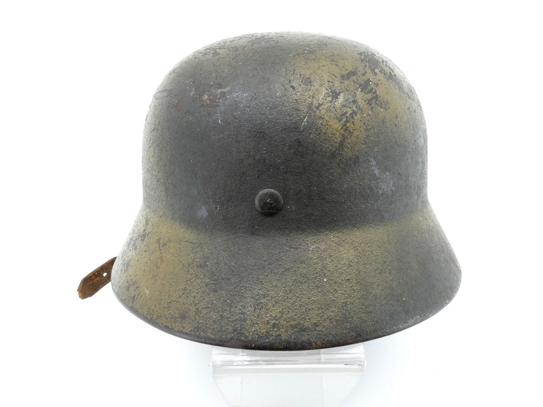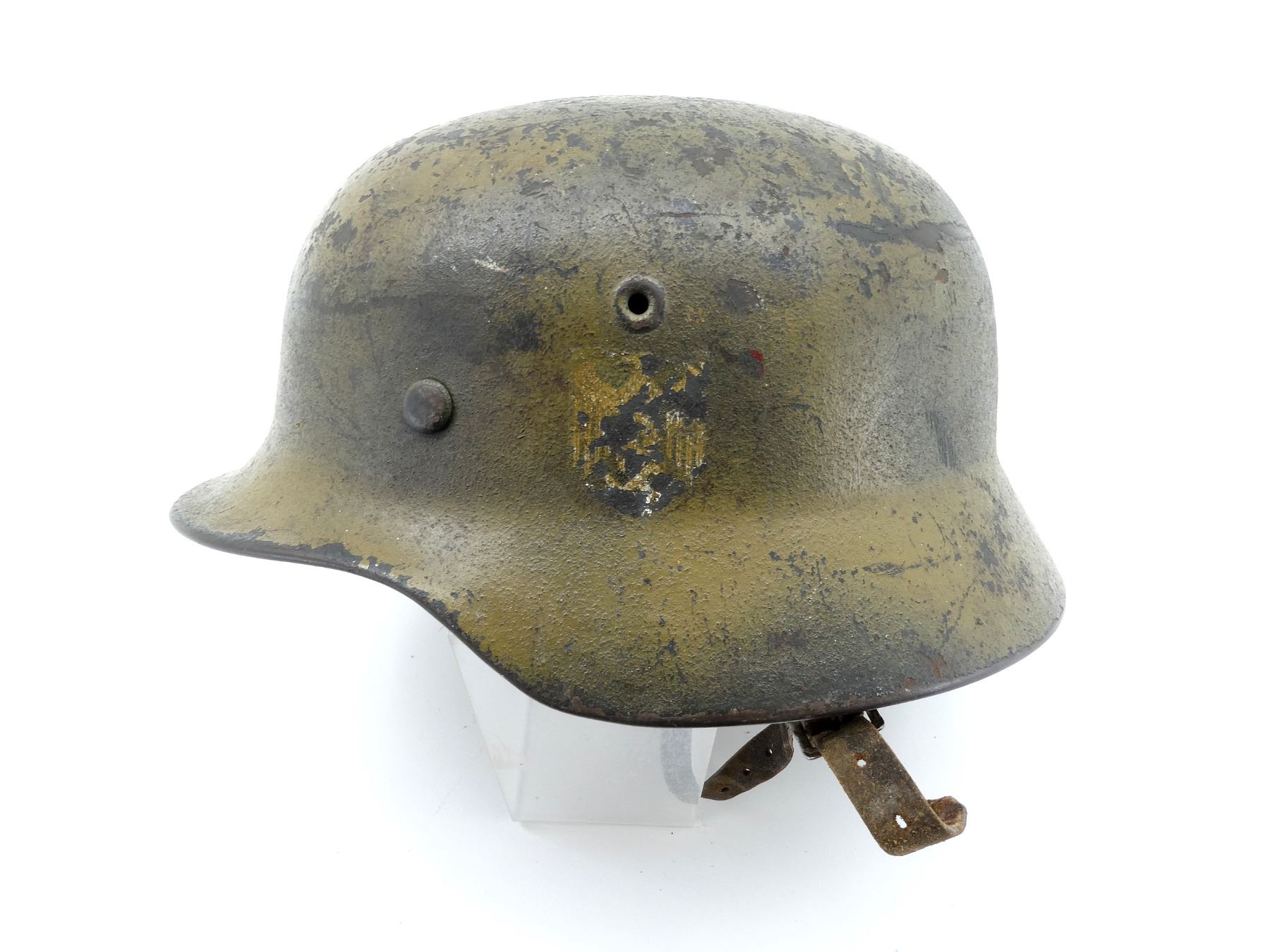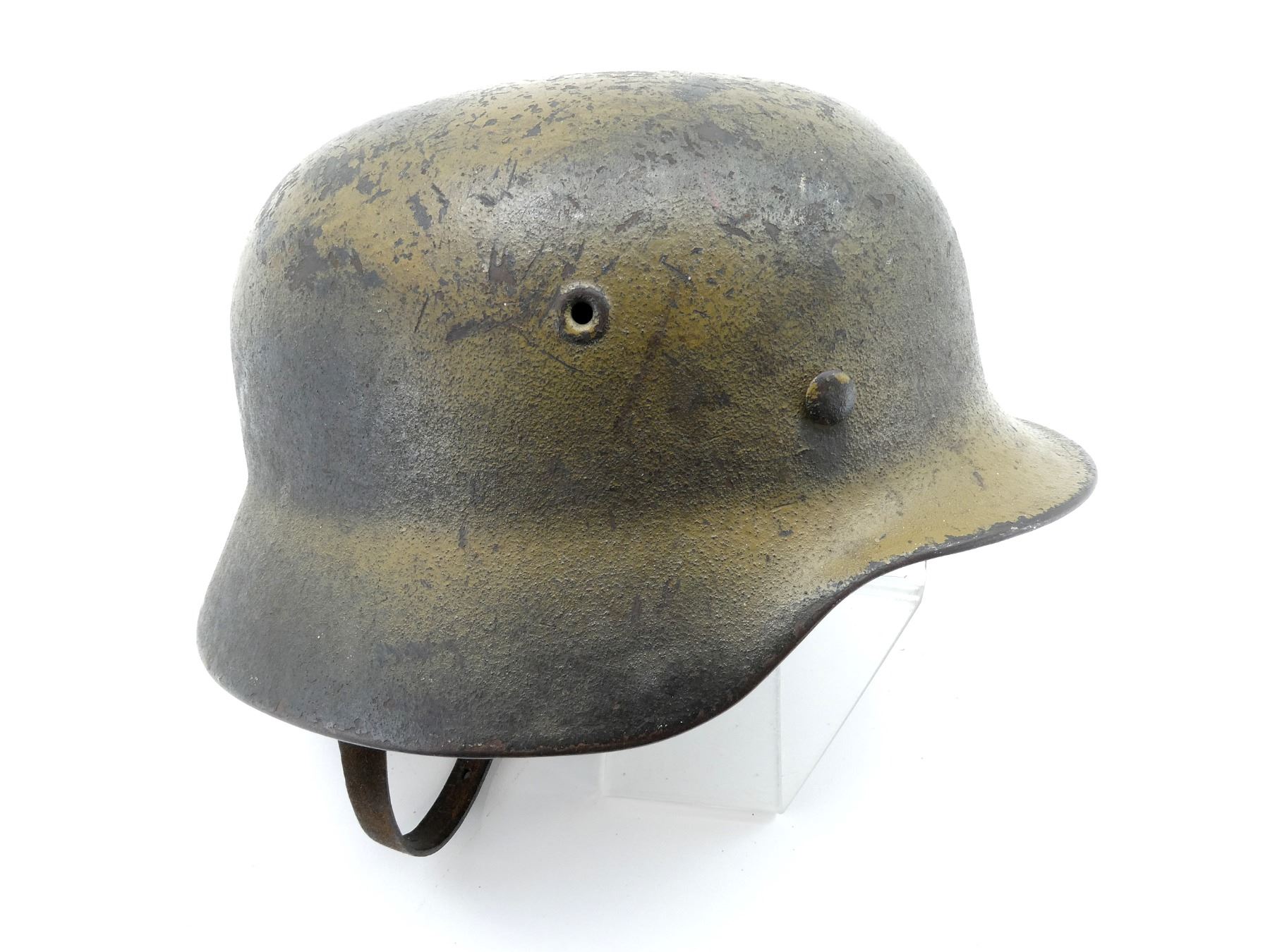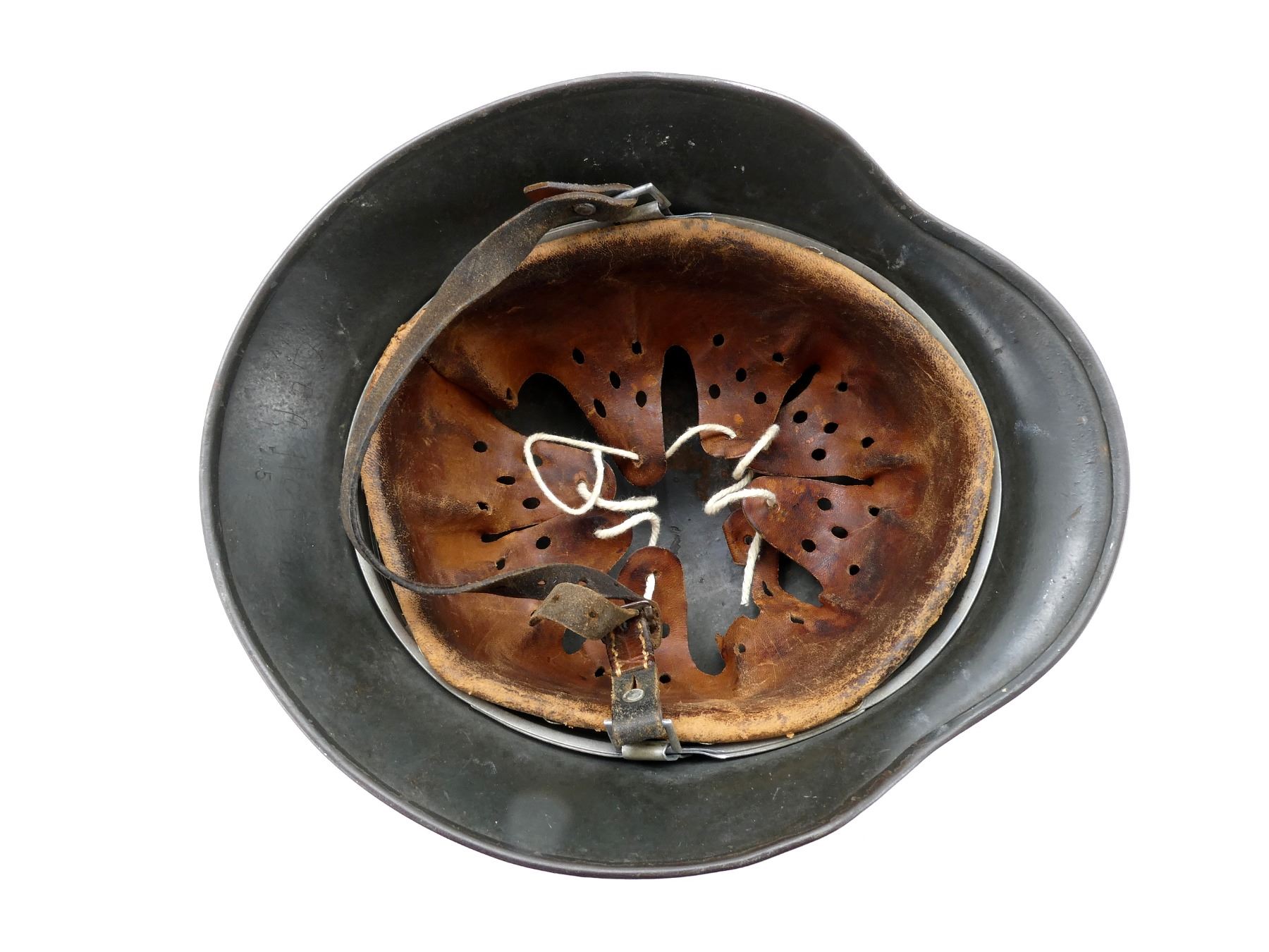 (1) GREEN / BROWN PAINTED HELMET WITH ONE DECAL, DECAL APPEARS SMOOTH, PRESSED RIVETS, ROLLED RIM, SIDE OF HELMET MARKED: "E.F.68", BACK OF HELMET MARKED: "75" WITH HAND-WRITTEN ETCHING ABOVE, ALUMINUM HEAD BAND, BAND MARKED: "68N. A./60", FELT AROUND ALUMINUM BAND, LEATHER HEAD LINER, LEATHER IS SOFT, NO VISIBLE MARKINGS, LEATHER CHIN STRAP MARKED: "REHRFARDT, P? SSNECK, 1942". SEE PHOTOS.