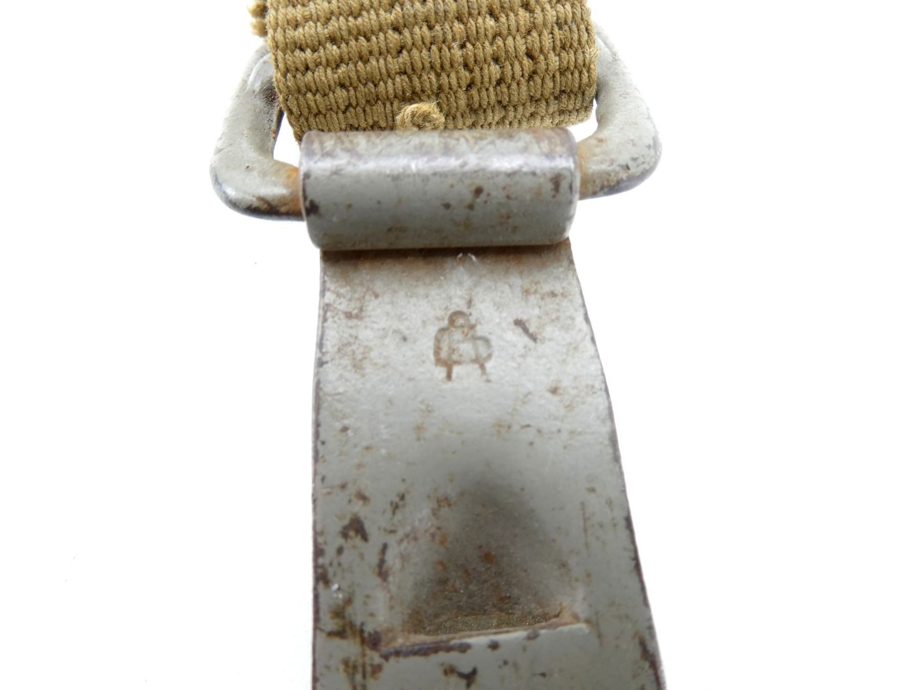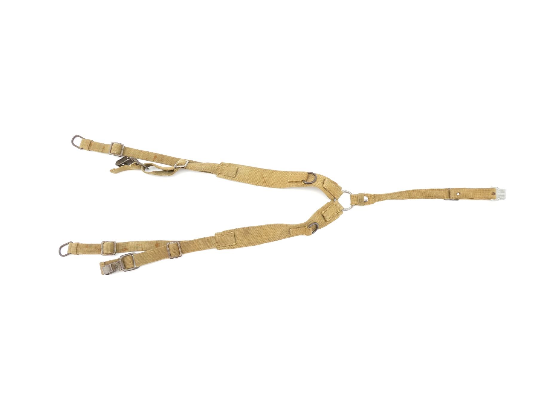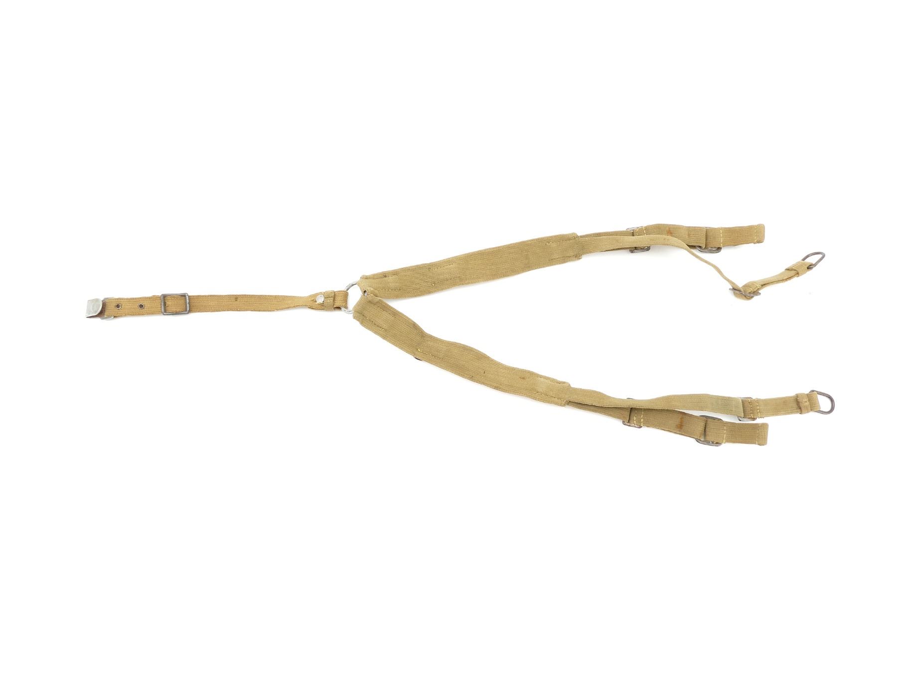 (1) SET OF TAN CANVAS Y-STRAPS, MAKER'S MARKS (POSSIBLY ASSMANN & SOHNE) ON METAL HOOKS, METAL FITTINGS, NO VISIBLE MARKINGS ON STRAPPING, OVERALL LENGTH APPROX. 49", ADJUSTABLE. SEE PHOTOS.
