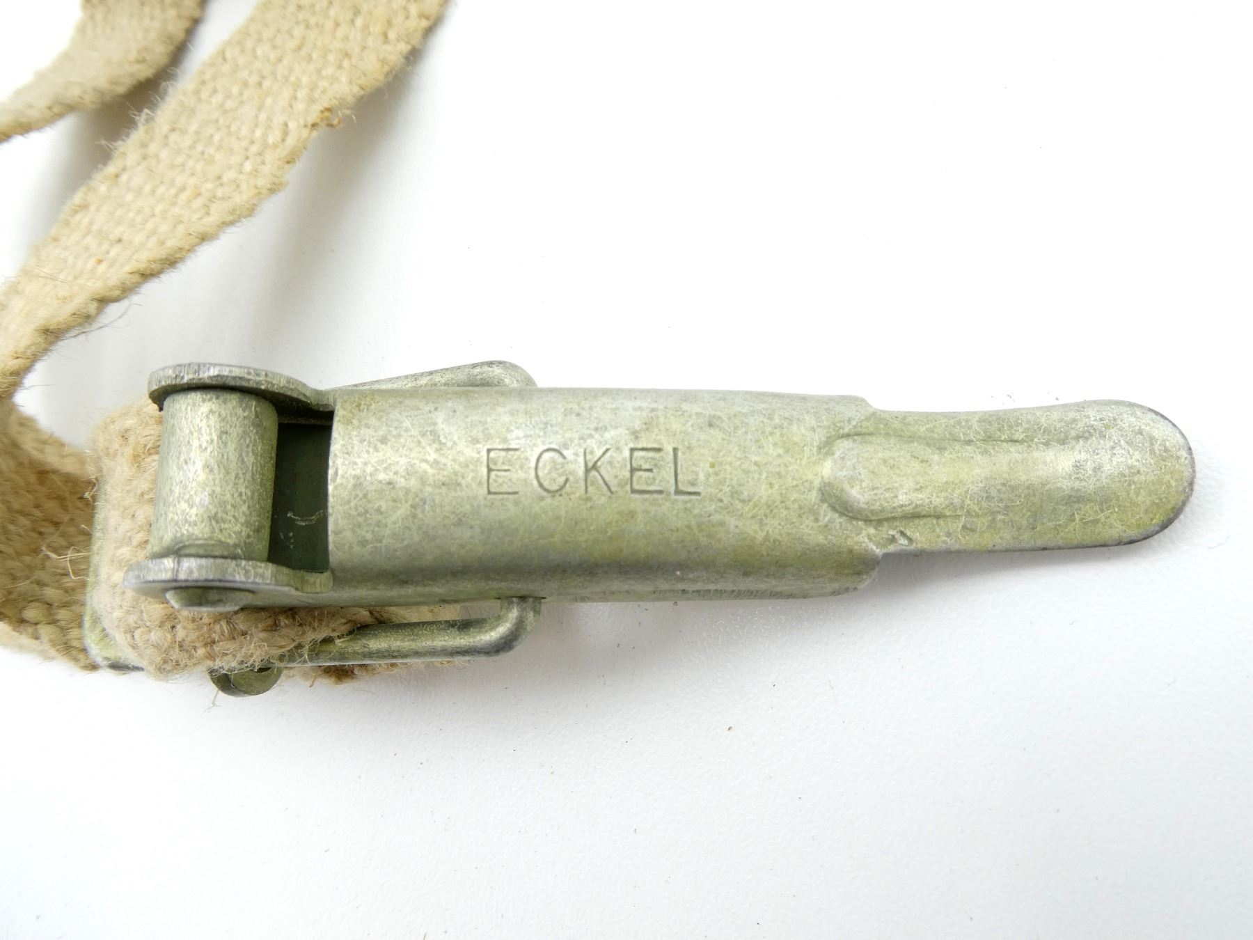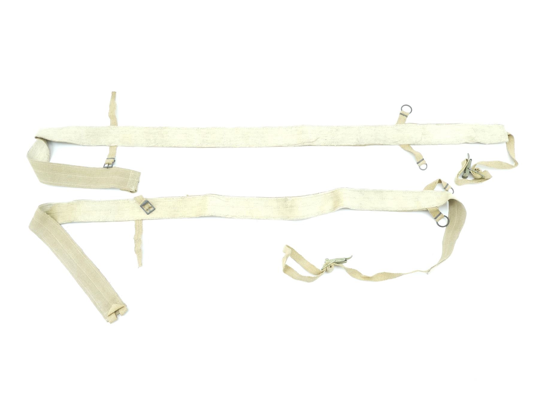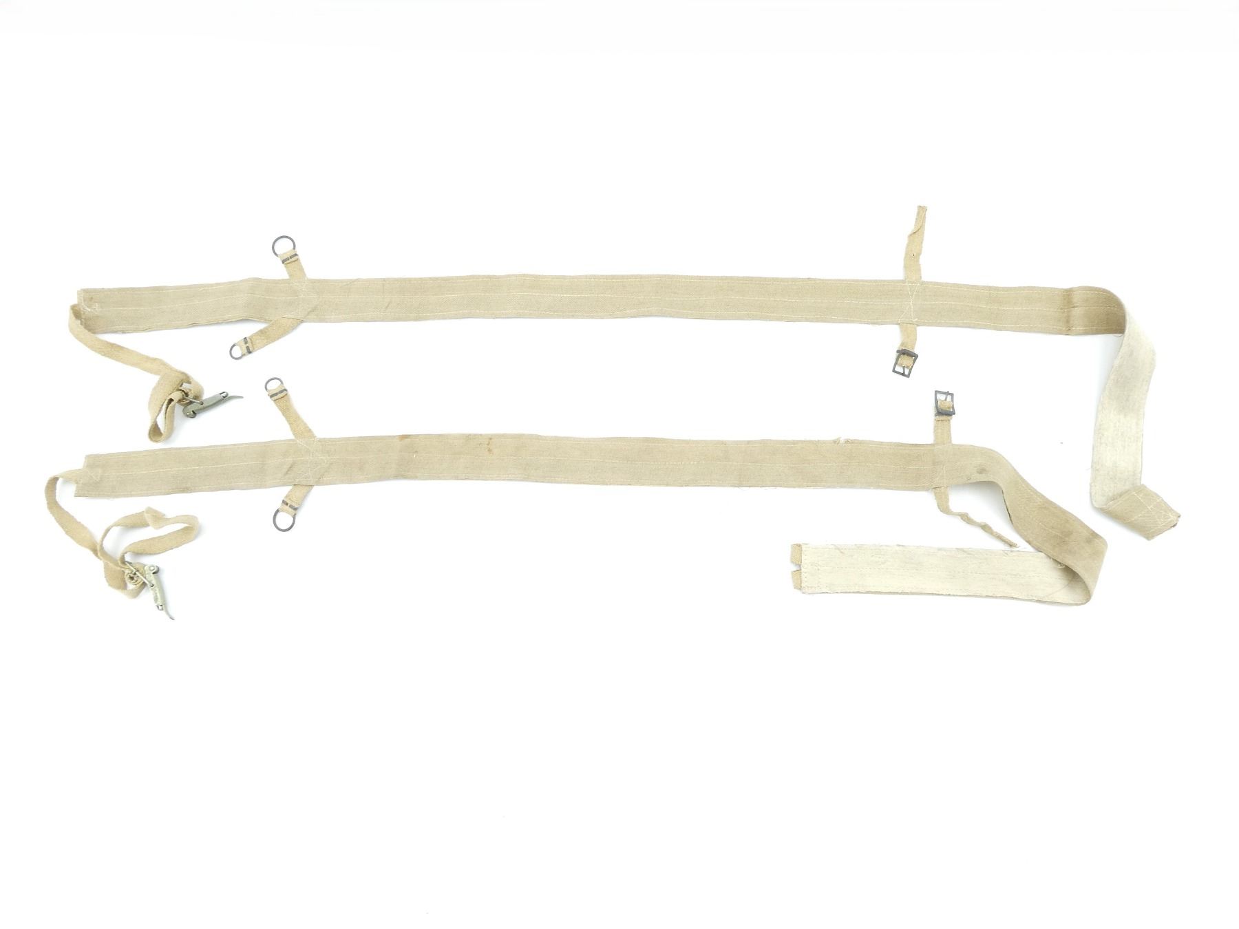 (1) PAIR OF TAN CANVAS / FUR SKI COVERS, METAL BUCKLES MARKED: "ECKEL", NO OTHER VISIBLE MARKINGS, FUR APPEARS TO GLOW UNDER BLACK LIGHT, THREADING DOES NOT, APPROX. 2 3/8" WIDTH, OVERALL LENGTH APPROX. 67". SEE PHOTOS.
