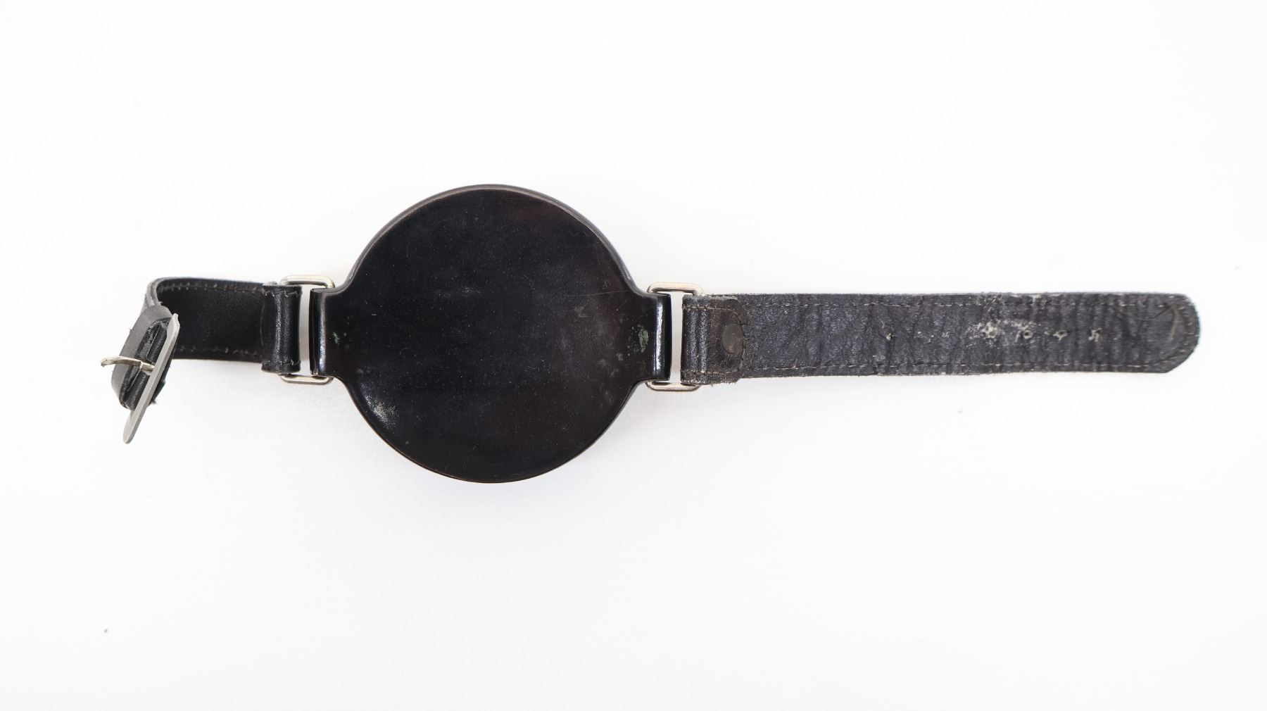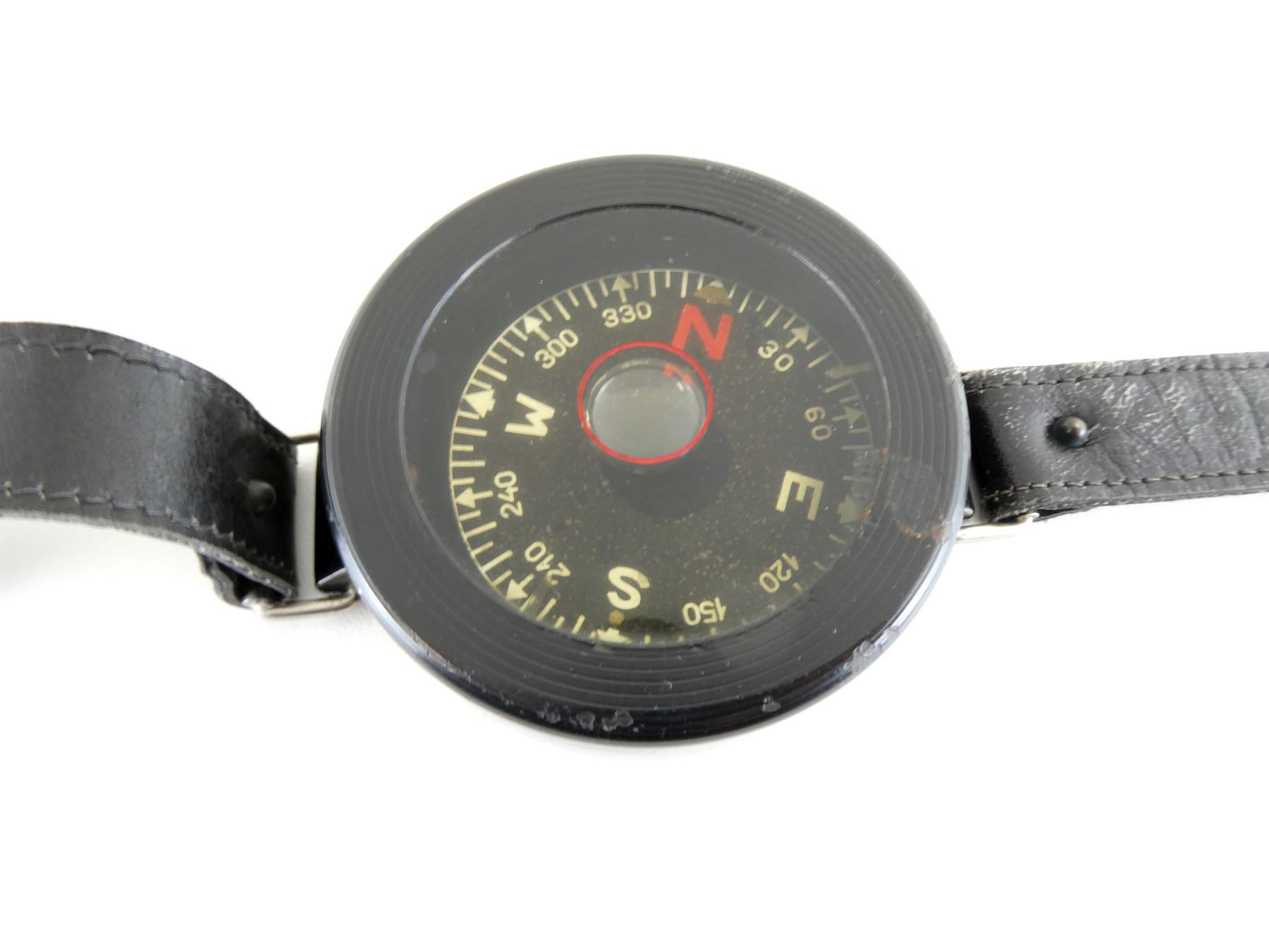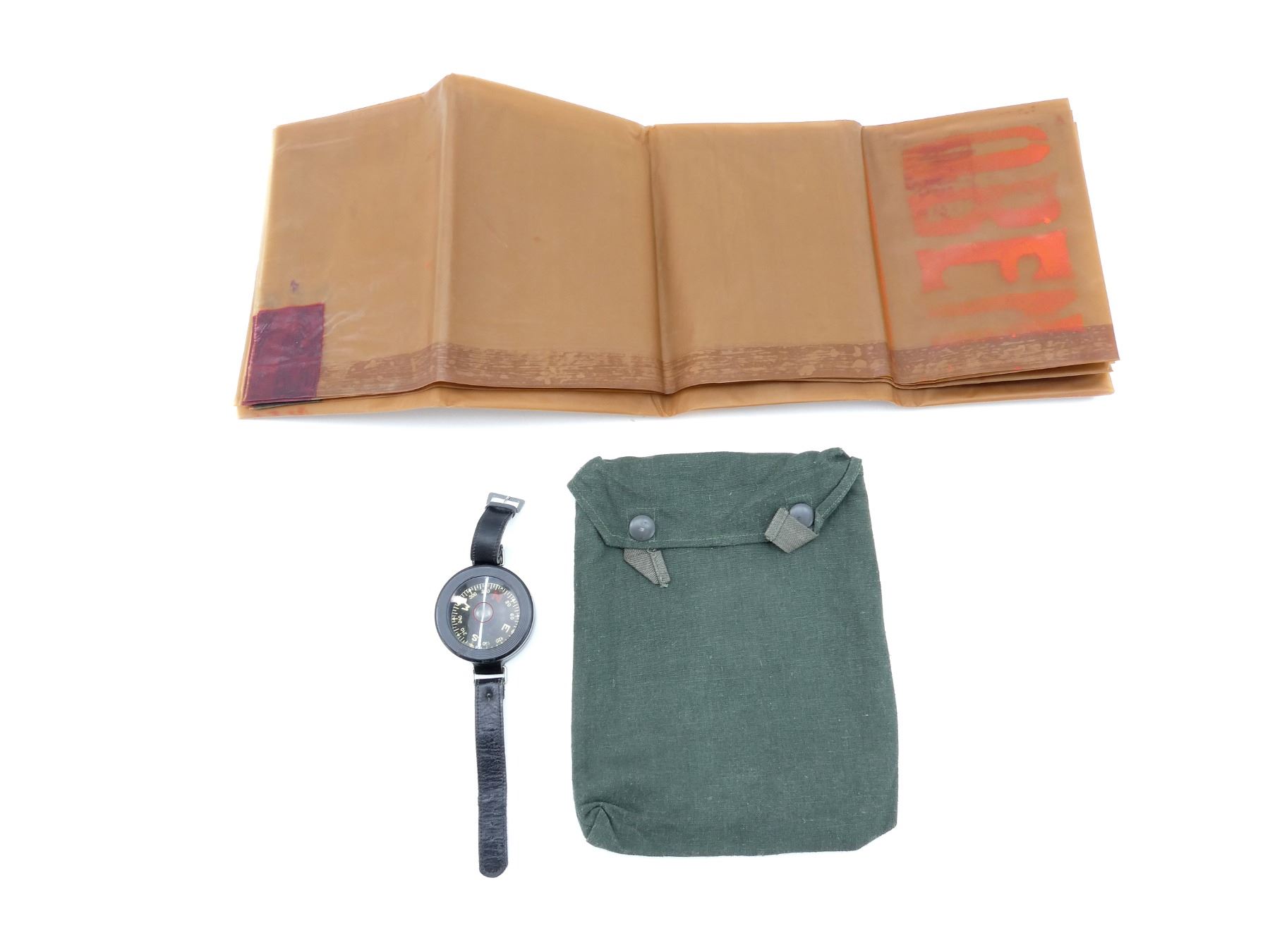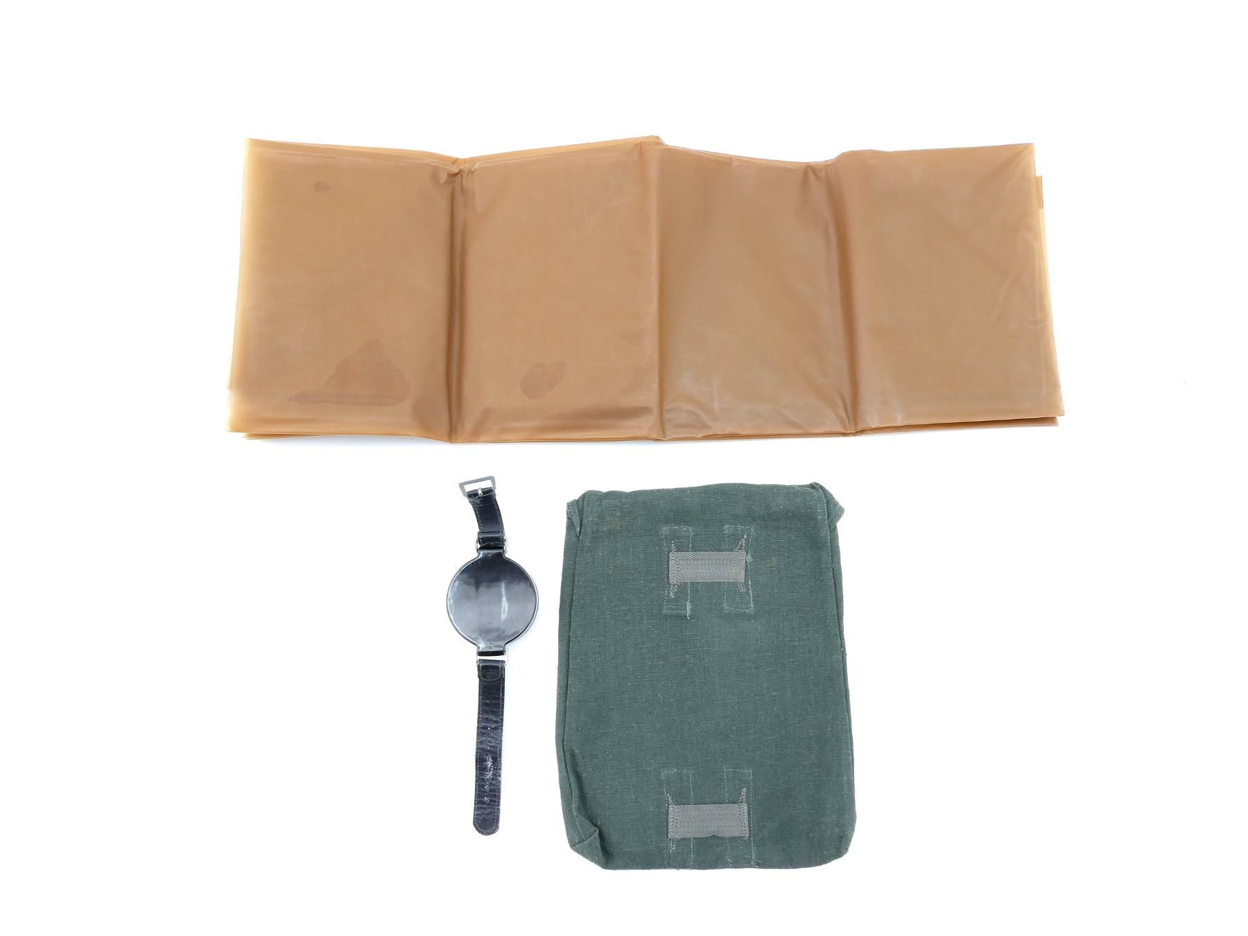 LOT INCLUDES; (1) WWII GERMAN STYLE GAS SHEET WITH CARRIER BAG, THIN BROWN RUBBER AND/OR PLASTIC GAS SHEET, MARKED: "OBEN", APPROX. 75.5" X 48", GREENISH GREY CLOTH CARRIER BAG, FAINT / UN-CLEAR INK STAMP MARKING ON FLAP, SNAP CLOSURE, TWO CLOTH BELT LOOPS ON BACK & (1) WWII GERMAN LUFTWAFFE AK-39 STYLE WRIST COMPASS, LEATHER WRIST STRAP, BLACK PLASTIC CONSTRUCTION, UN-TESTED, DIAL APPEARS TO STICK, SHOWS AGE / WEAR / TEAR. SEE PHOTOS.