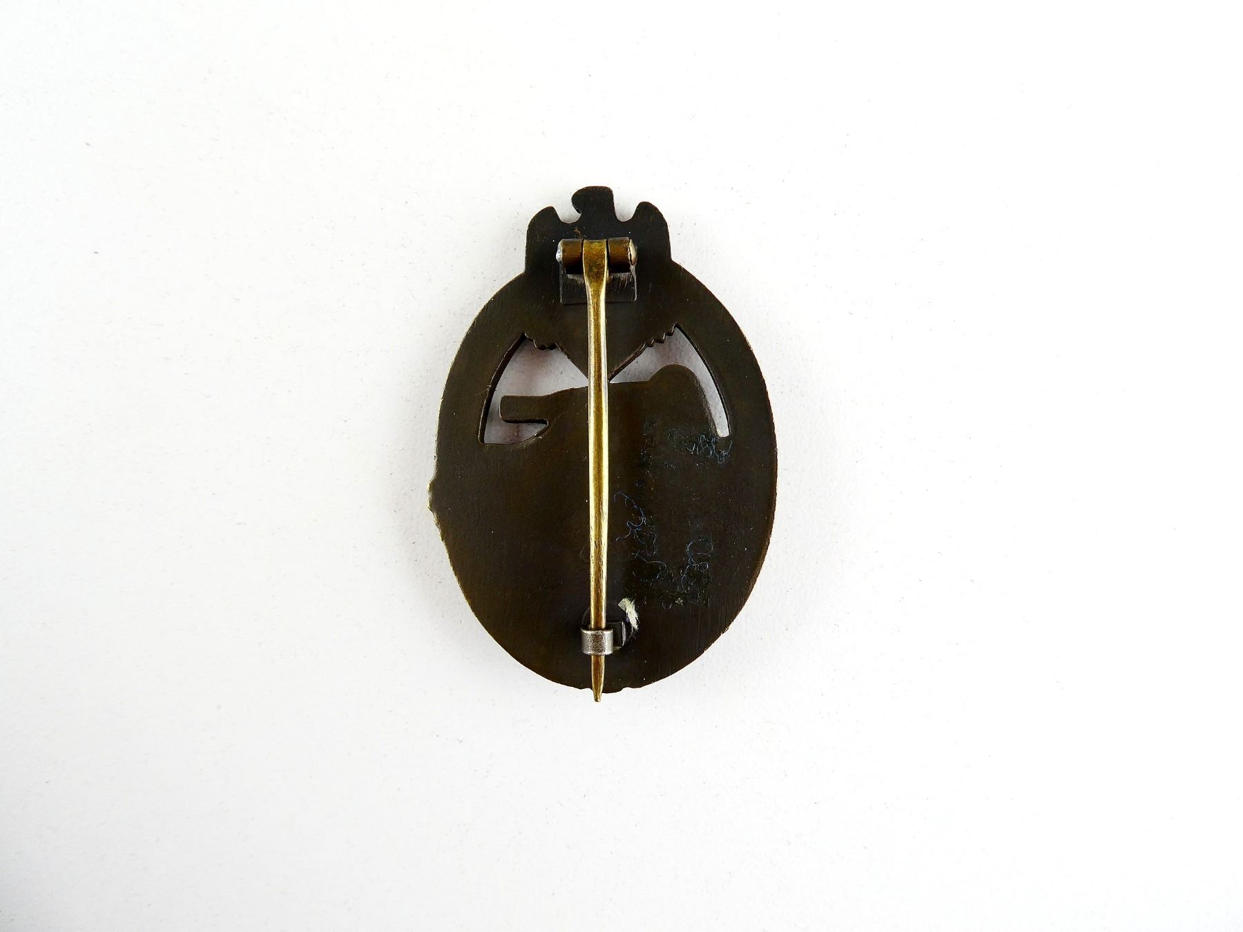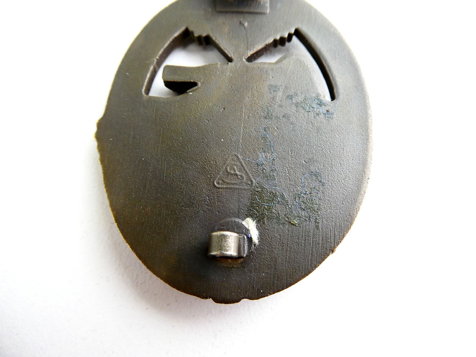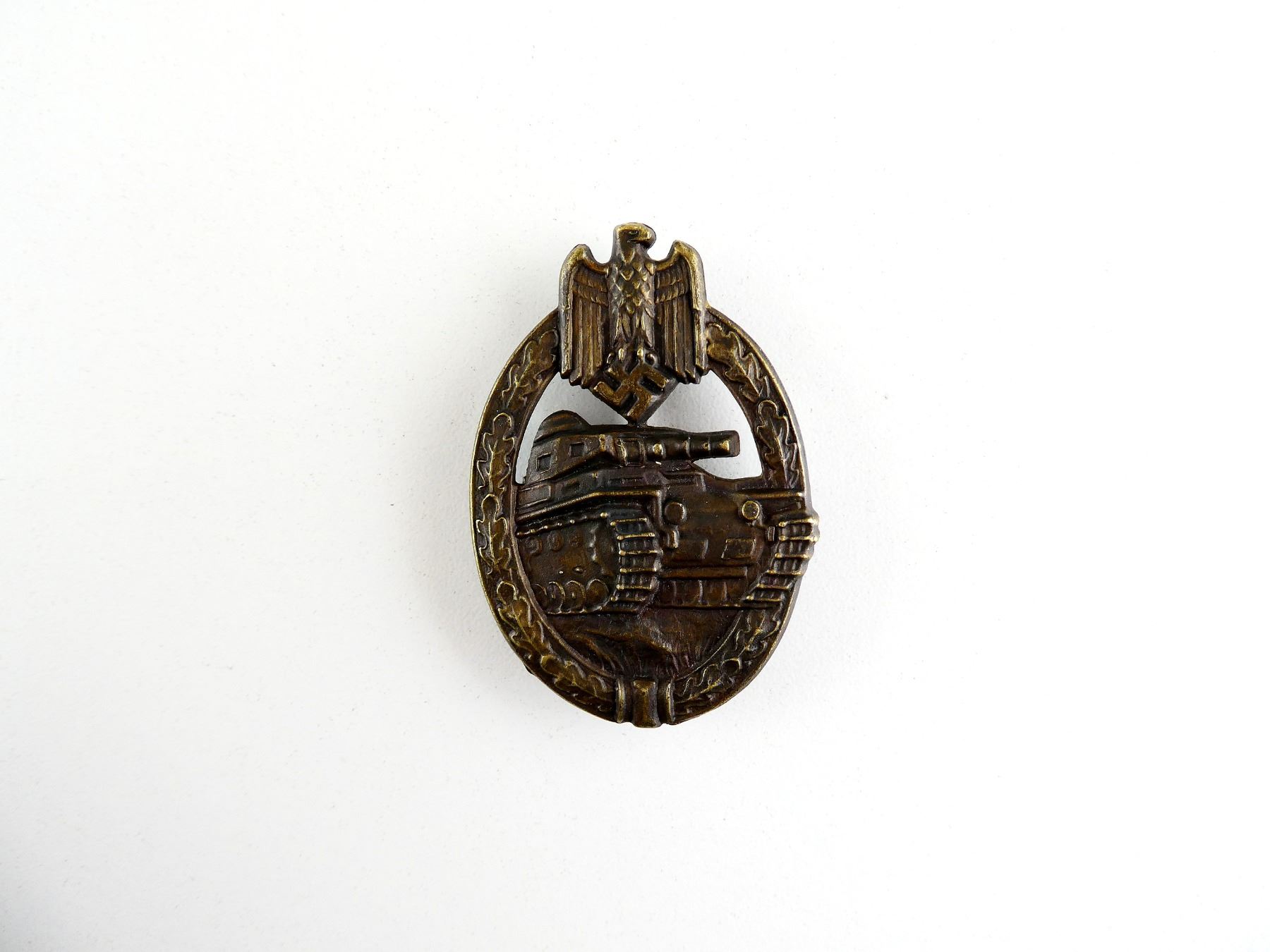 (1) BRONZE PANZER ASSAULT BADGE, INTACT ROUND PIN BACKING, BACK MARKED WITH MAKER'S MARK (ADOLF SCHWERDT). SEE PHOTOS.