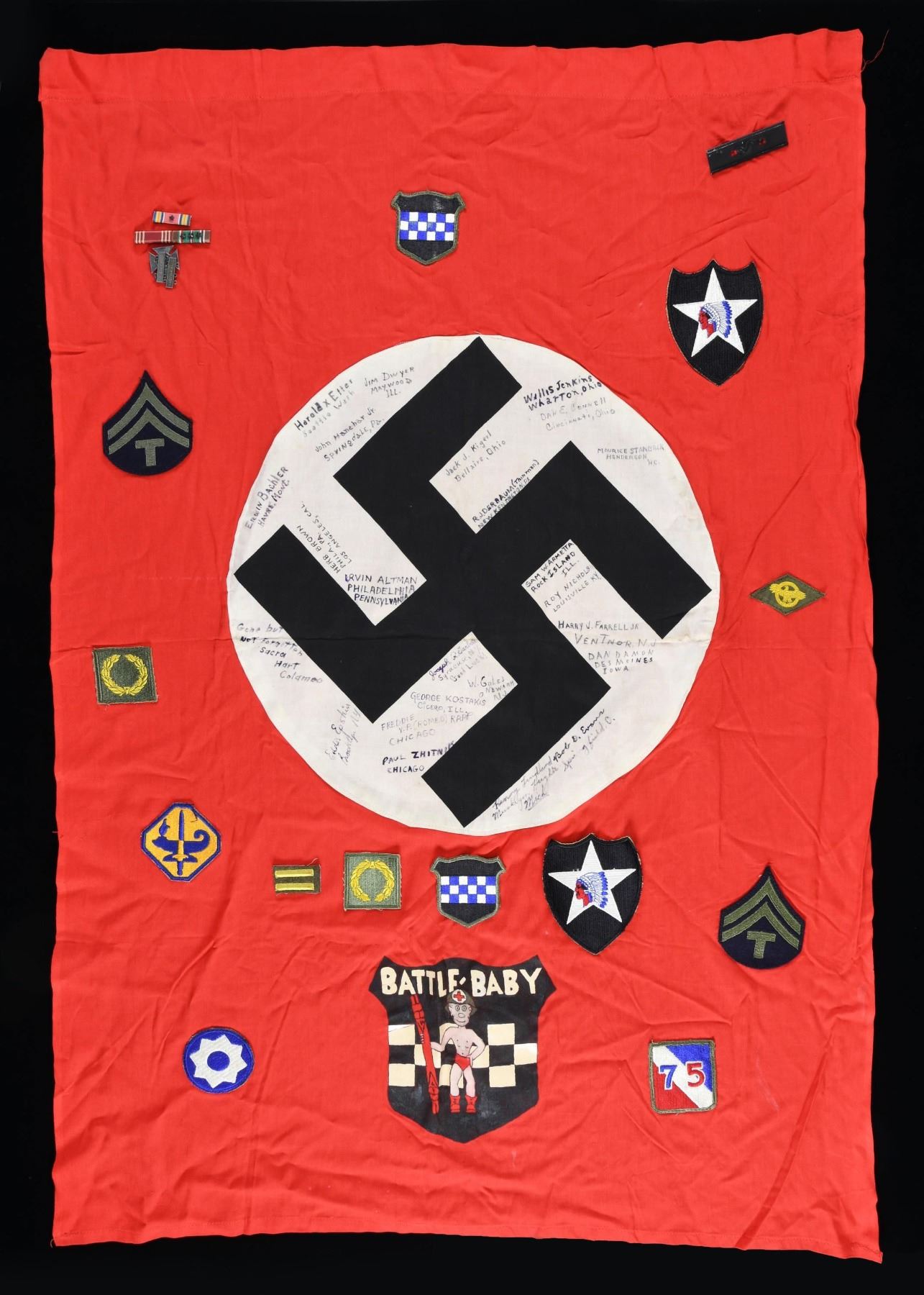 SIGNATURES AND INSIGNIA. This standard WWI German Party flag measures approx. 46" x 32". It has a black printed Party symbol on a sewn white circular disk, all on a red field. Several soldiers, likely from the same unit, signed their name and hometown throughout the white disk. There is a painted shield below the disk that reads "BATTLE BABY" with an Army medic below wearing a helmet, red underwear, and red boots. There are several Army patches and cloth insignia sewn to the flag, as well as a rifle/hand grenade qualification badge, and three ribbon bars. Also included with the flag are 4 separate Army rank insignia and unit patches. CONDITION: all items generally show light wear with no notable damage. (02-24046/BF). $300-500.