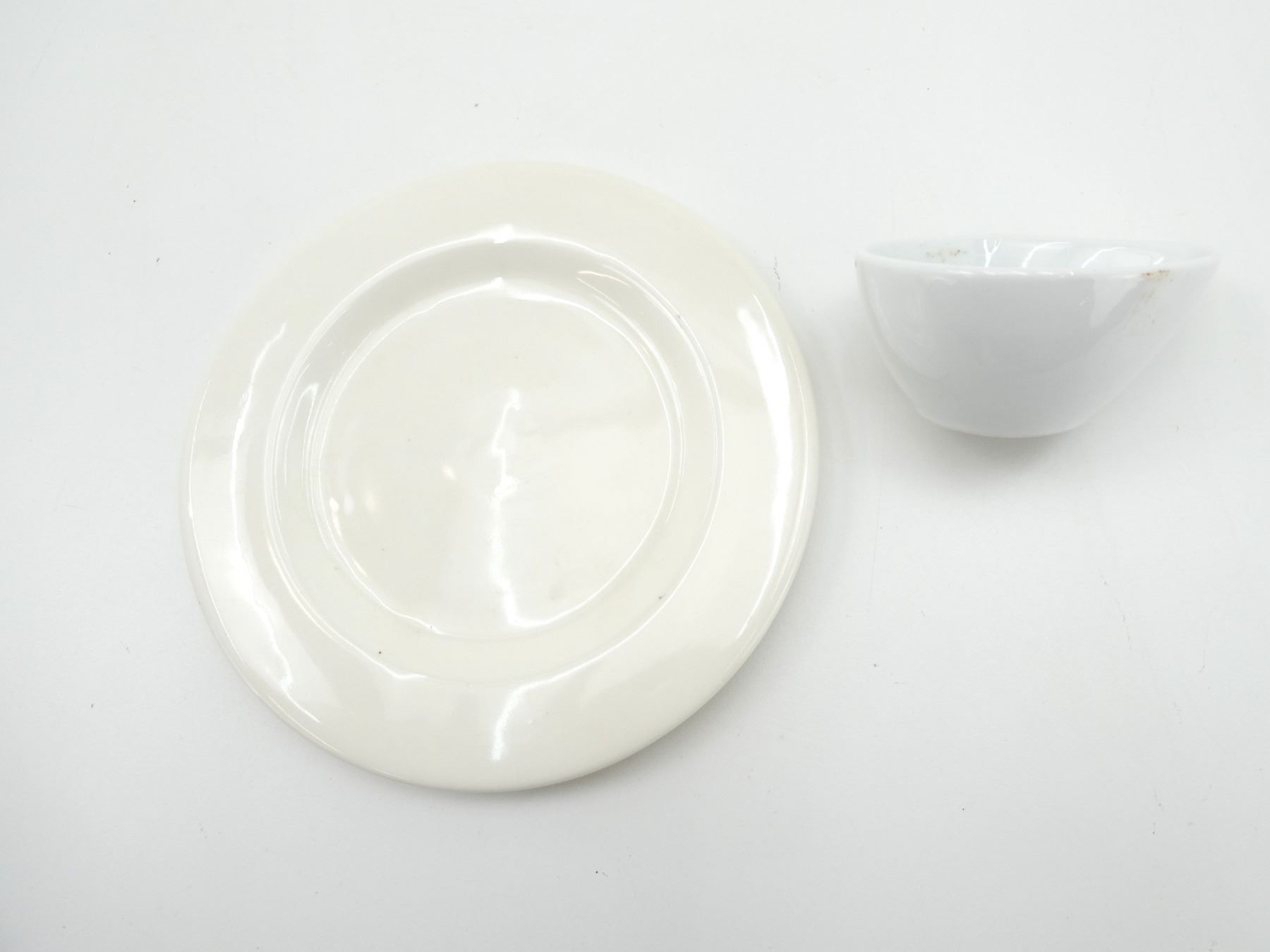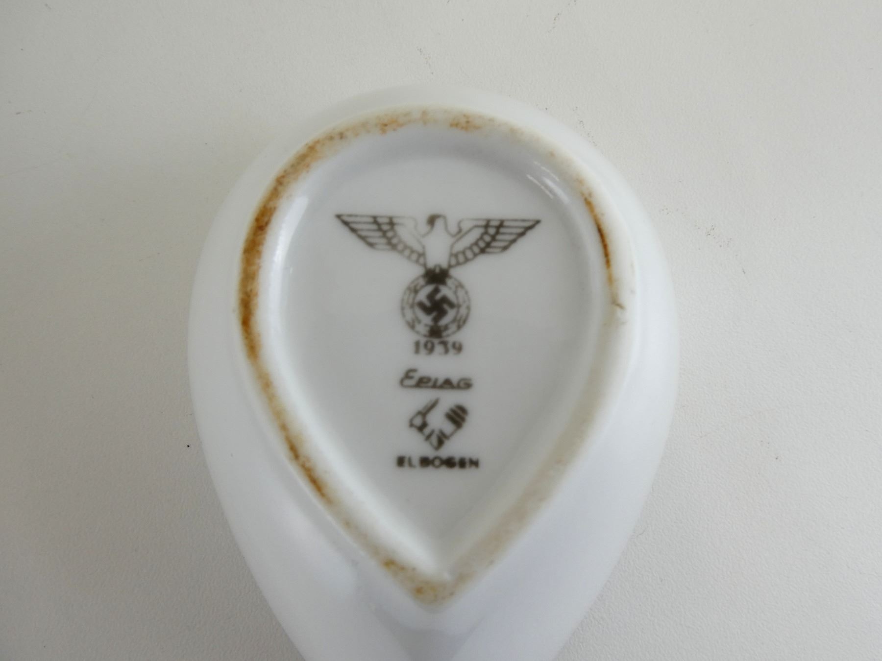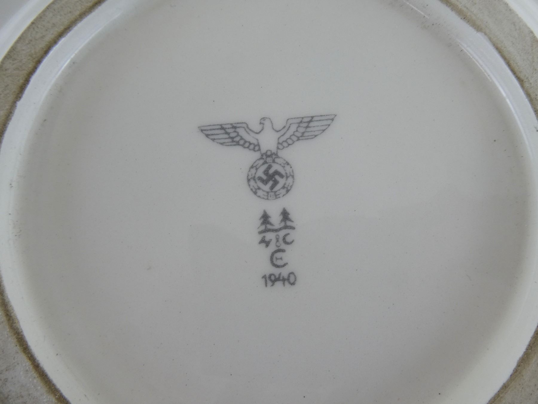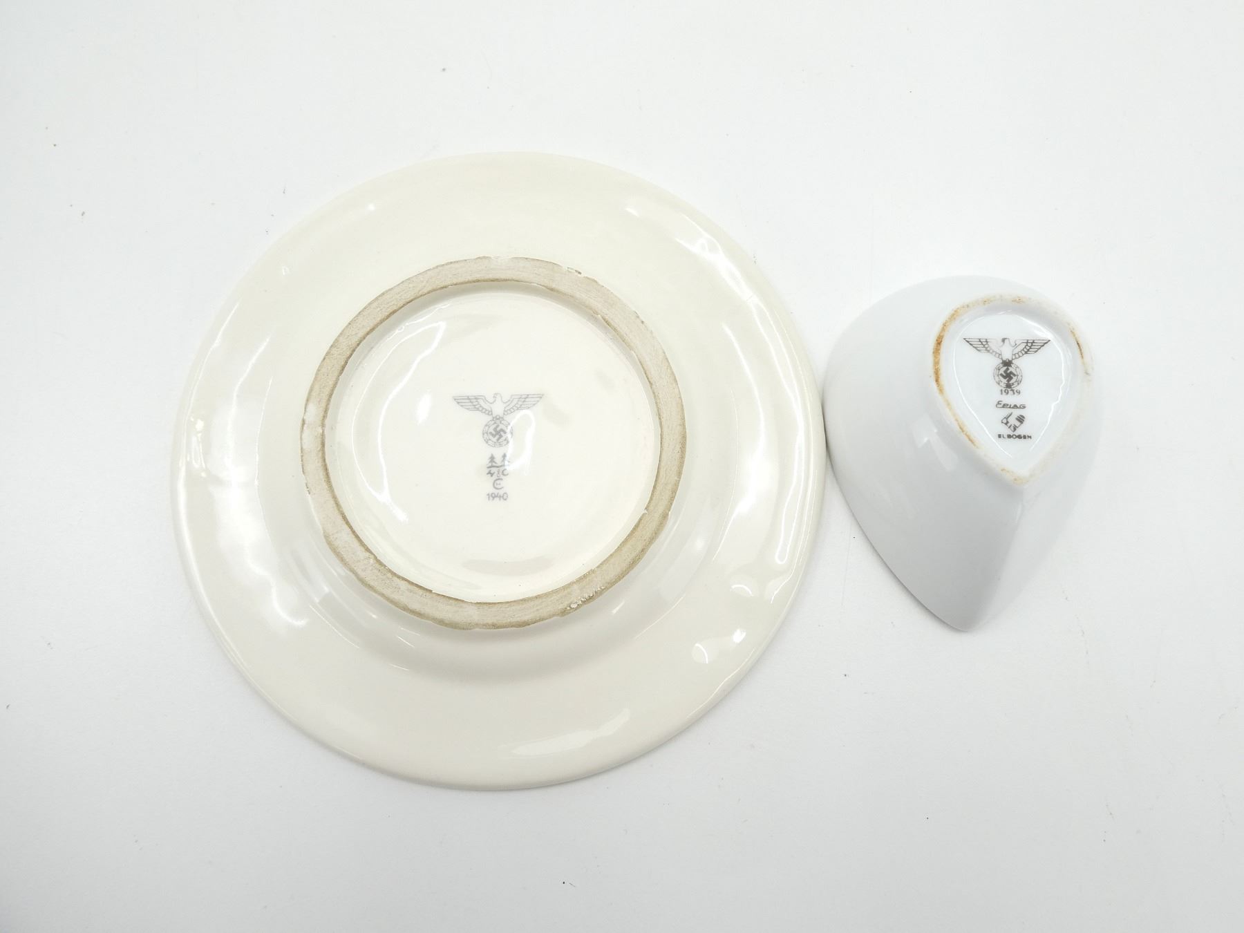LOT INCLUDES; (1) WWII GERMAN CERAMIC / PORCELAIN BOWL, BOTTOM MARKED: EAGLE HOLDING SWASTIKA OVER "1939" OVER "EPIAG", OVER MAKER'S MARK OVER "ELBOGEN", OVERALL LENGTH APPROX. 4" & (1) POSSIBLY REPRODUCTION GERMAN CERAMIC / PORCELAIN PLATE, BOTTOM MARKED: EAGLE HOLDING SWASTIKA OVER TWO TREES OVER "H&C" OVER "CH" OVER "1940", APPROX. 7 3/8" DIA. SEE PHOTOS.