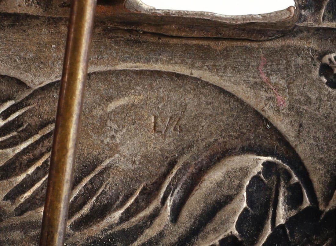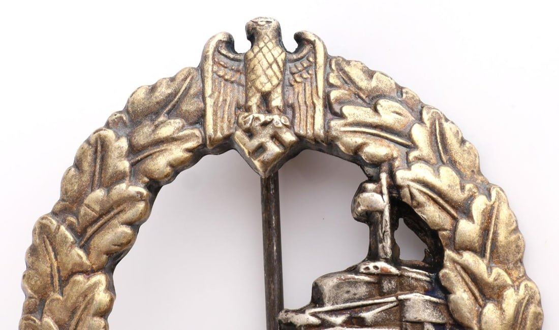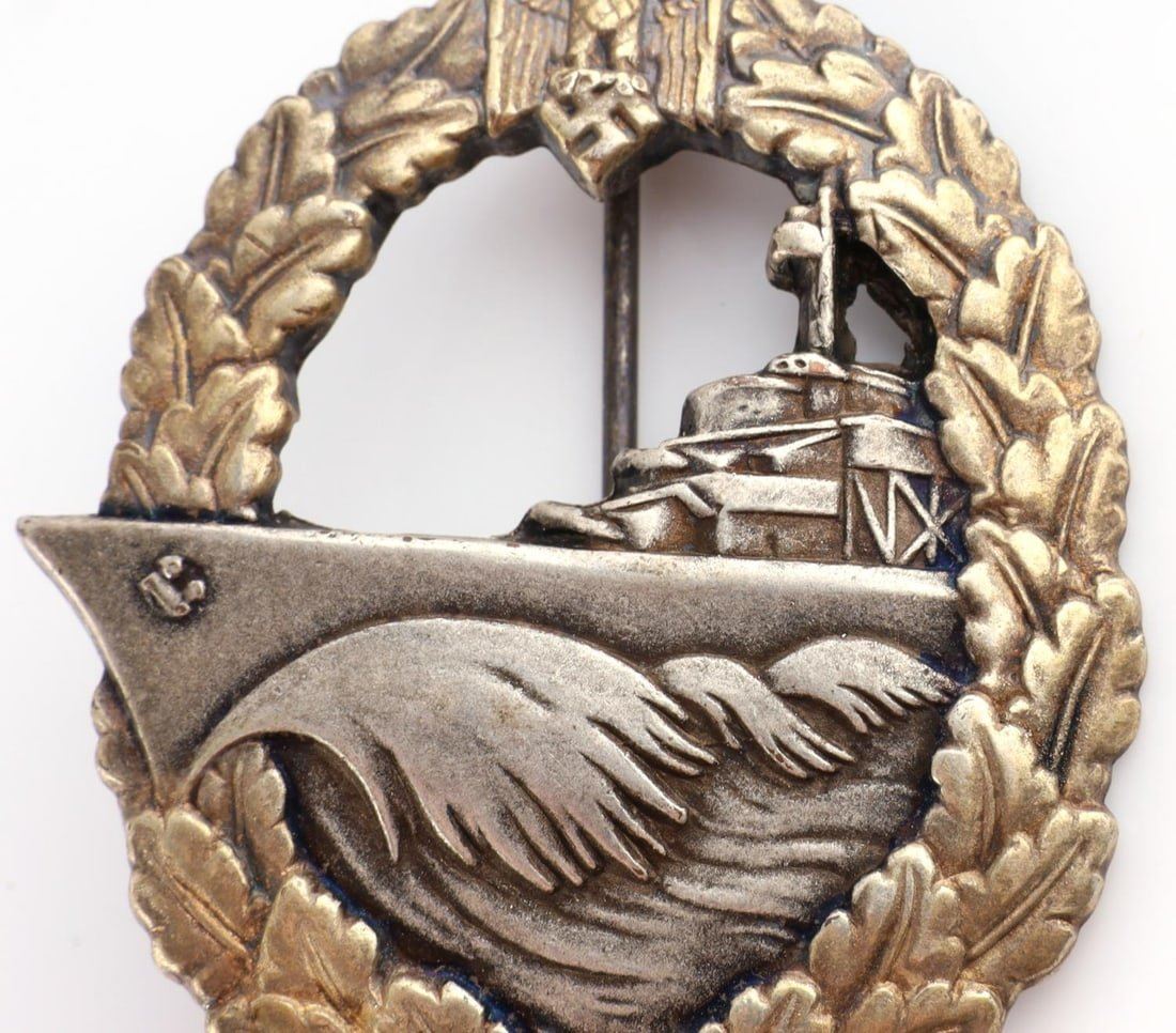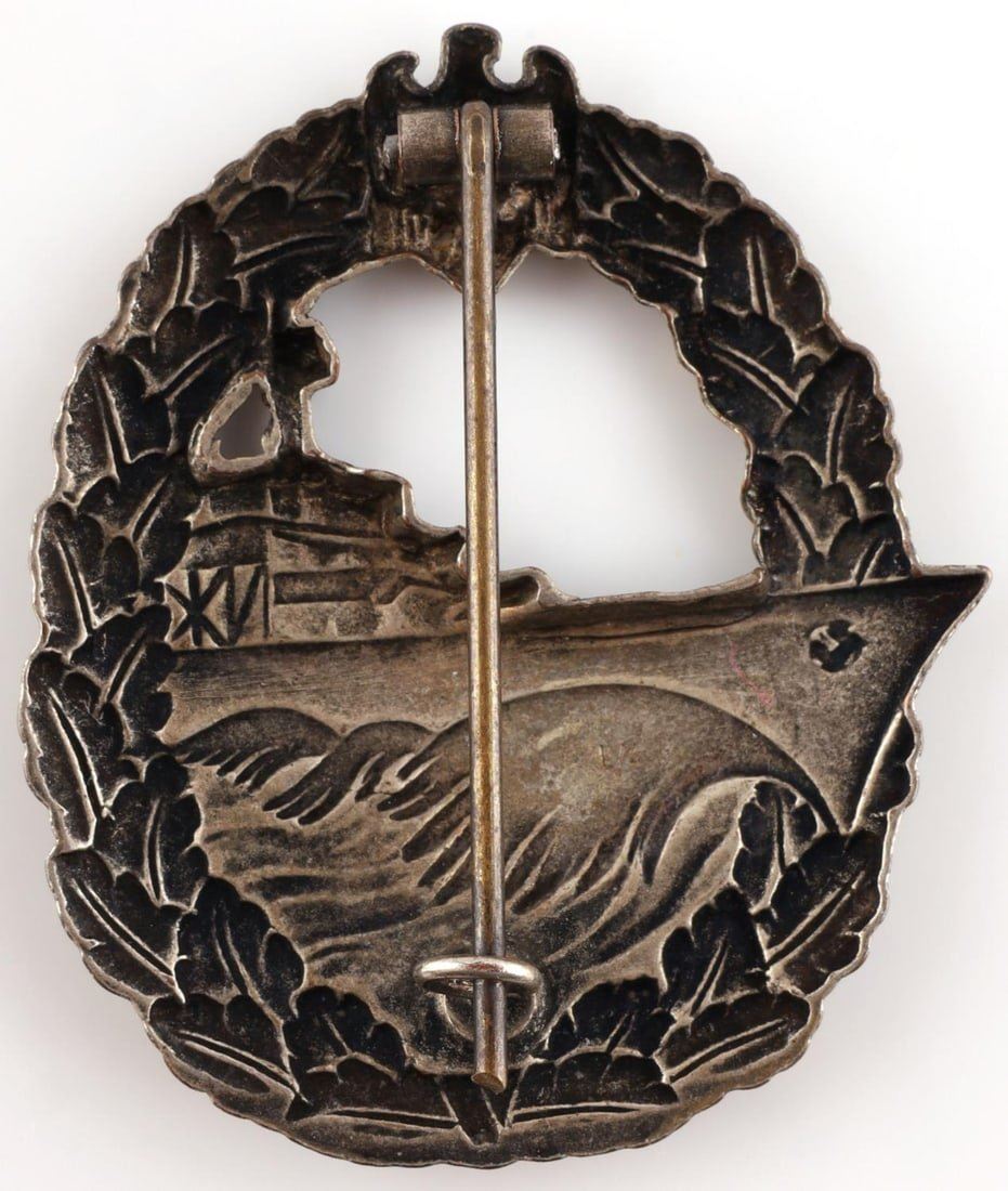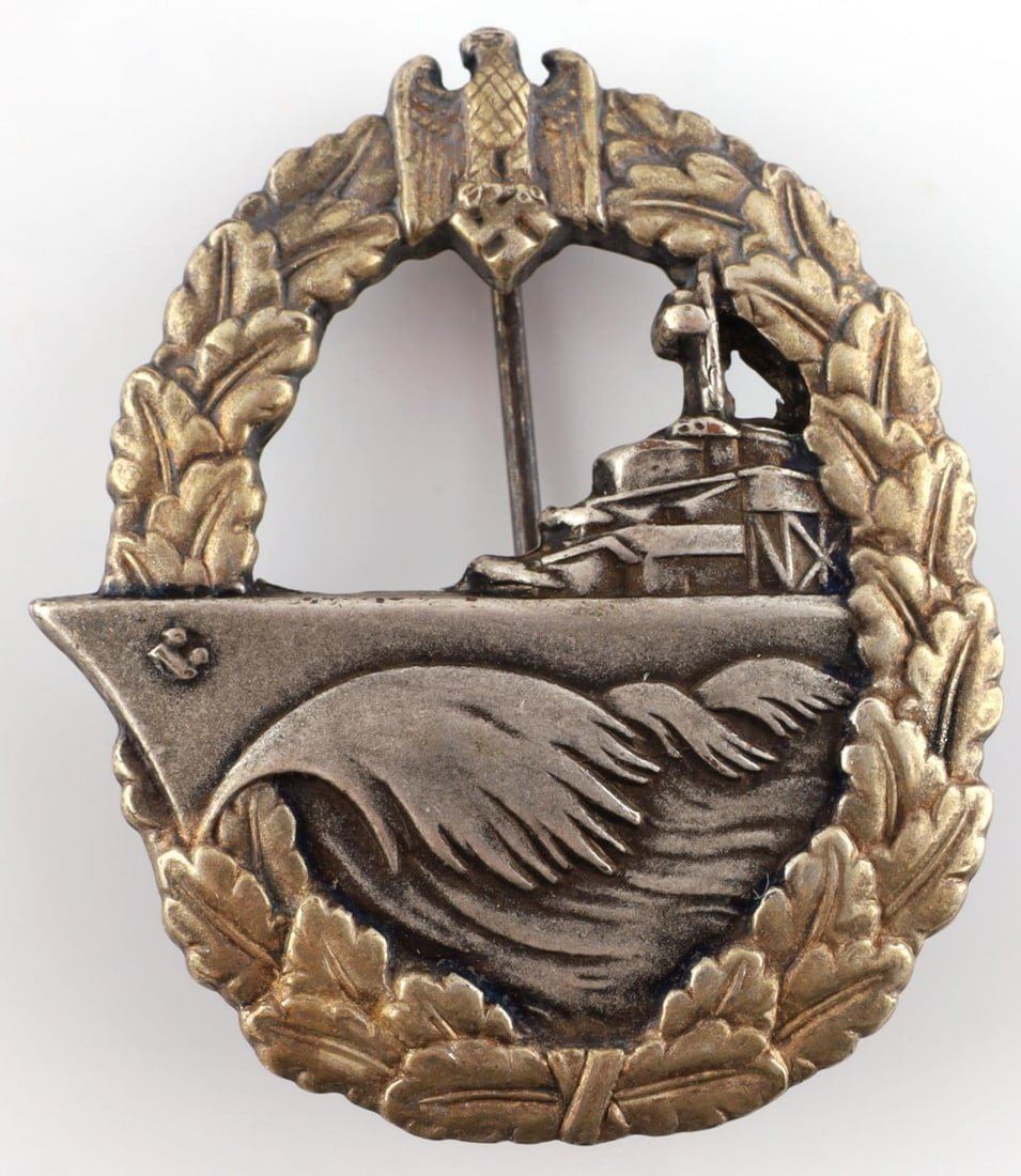 WWII German Reich Kriegsmarine Destroyer War badge. Badge has no markings on backside. Pin back stops at ninety-degree angle. Badge size approx. 2 inches. Good condition.