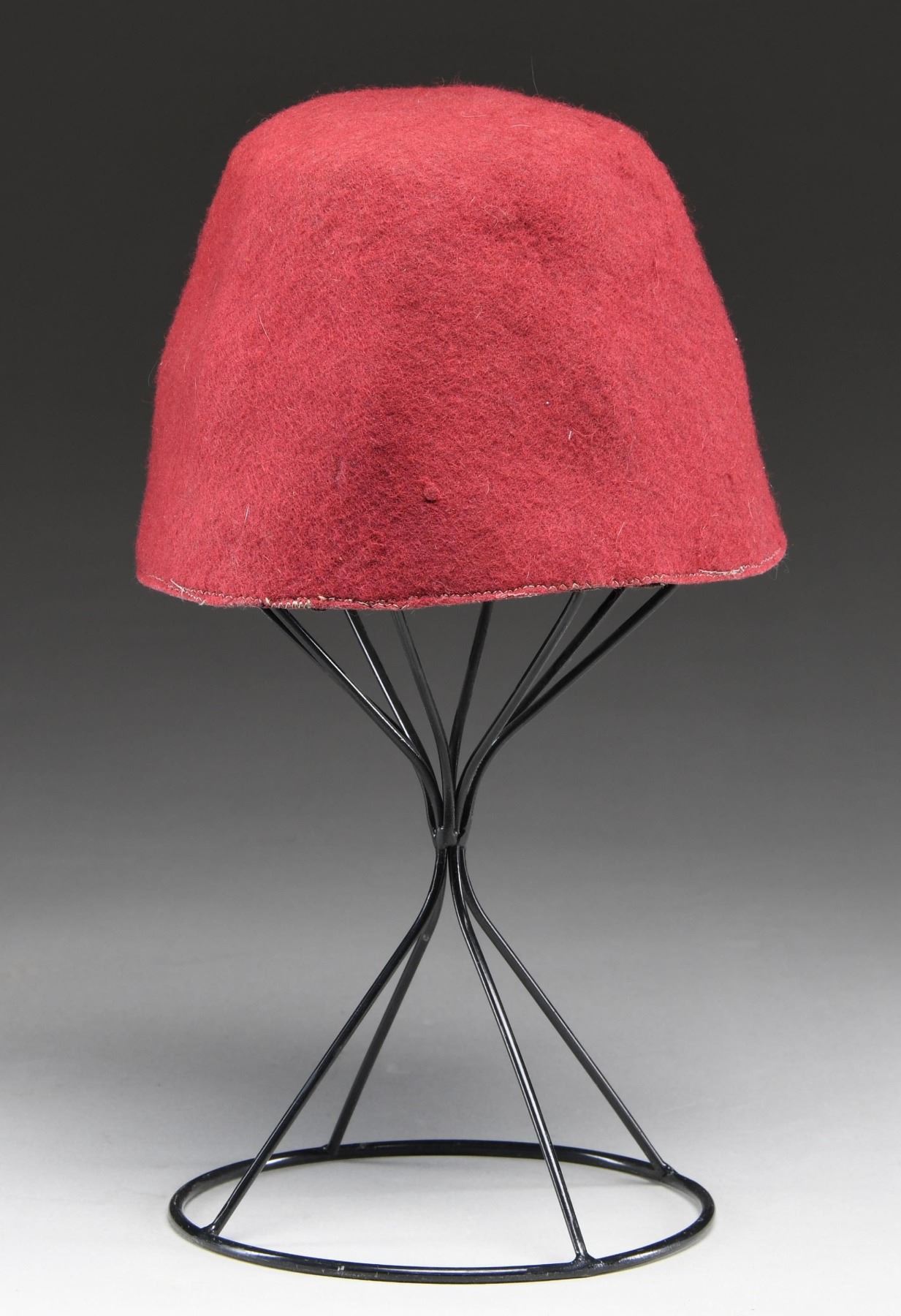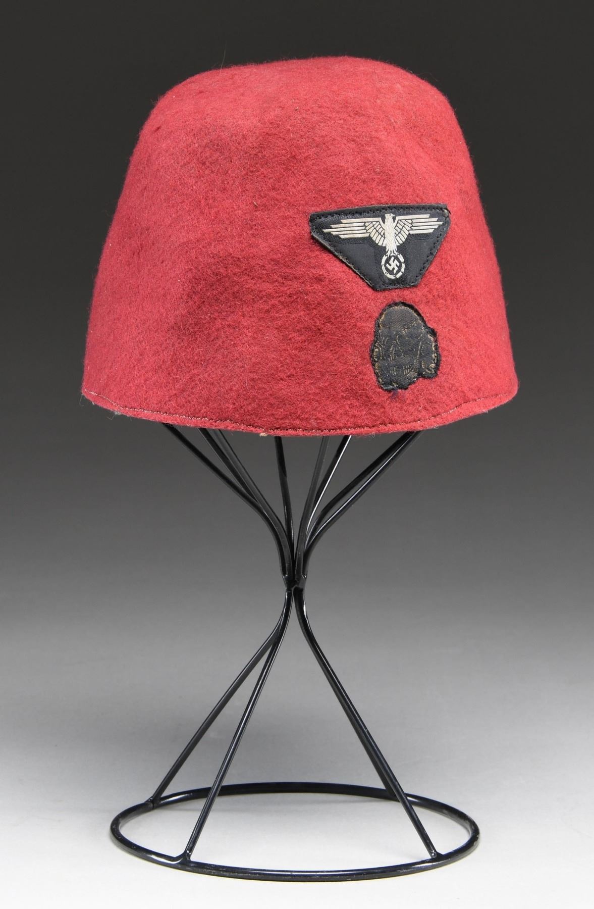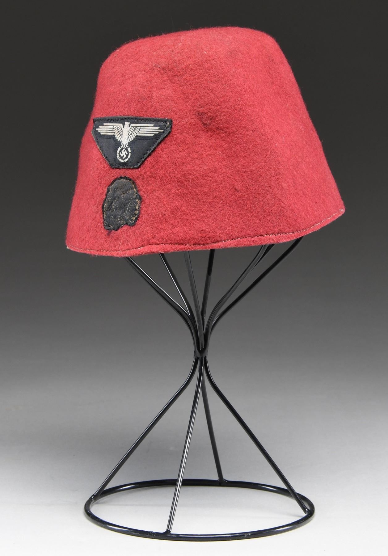 This red wool fez, in our opinion, is a post-war production and should be considered a reproduction. It does show wear and insect damage, nonetheless, we feel it is not of the period. The body of the fez is a medium red wool with a cloth SS eagle and death's head insignia on the front. Brown leather sweatband with no interior markings. CONDITION: hat shows light to moderate wear throughout with traces of insect damage. The sweatband is sewn but shows glue residue on the reverse. There is also an area of rodent damage. (02-23639/BF). $150-300.