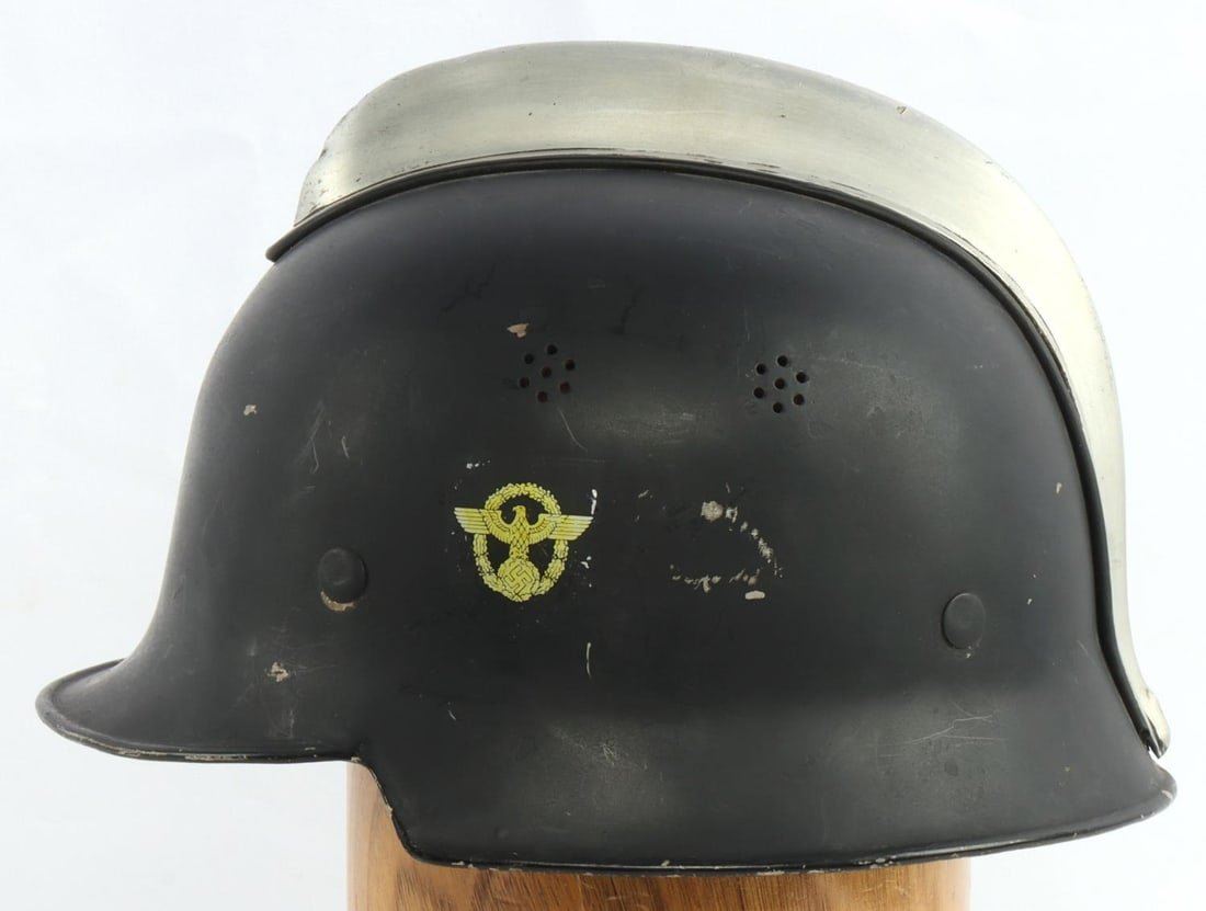 Fire police helmet with decals on both sides. 8 finger leather liner on interior. Leop. Giegle stamp on back interior. Right interior marked Vorsch Leichime. Measures 11 inches from rim front to reverse. This lot has a reserve.