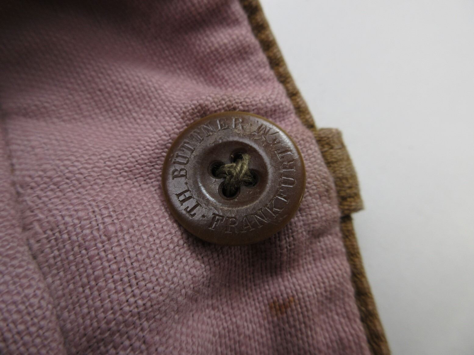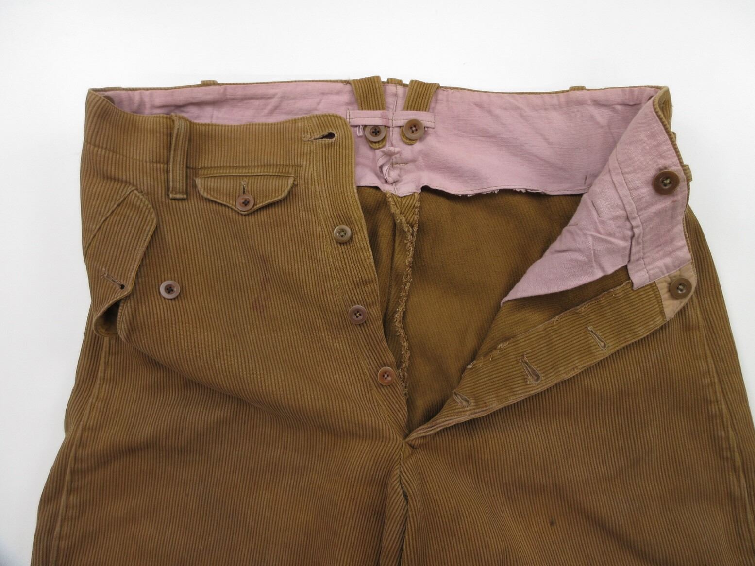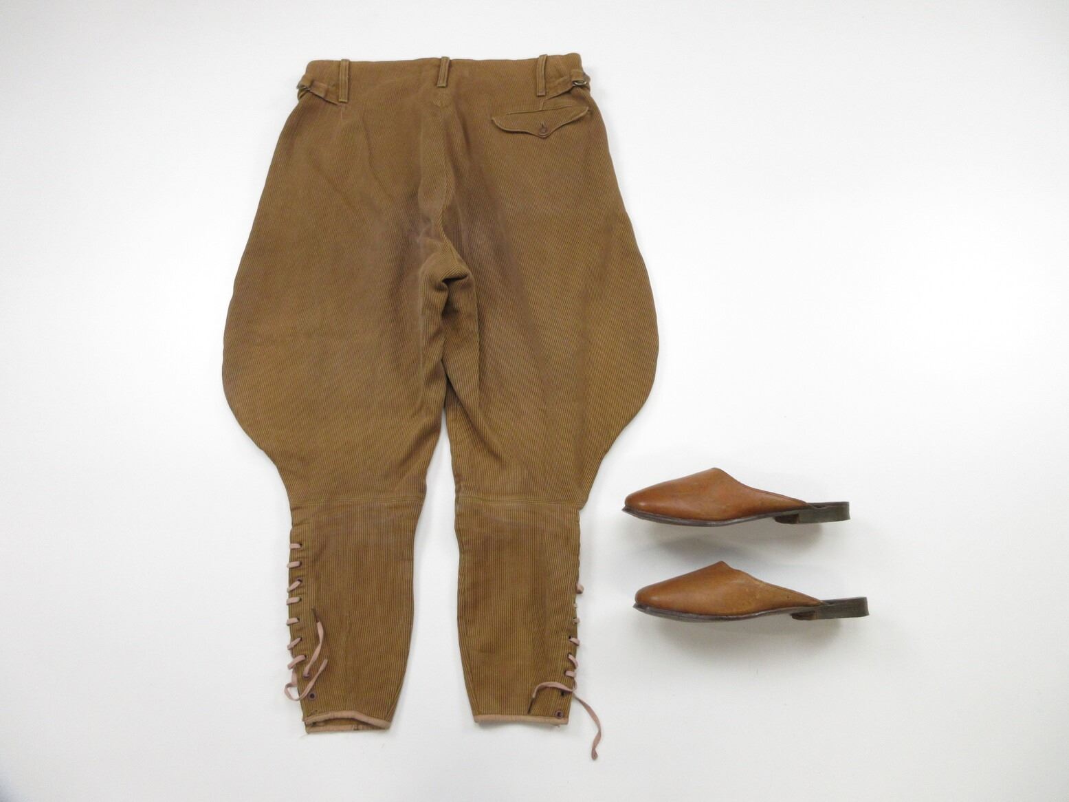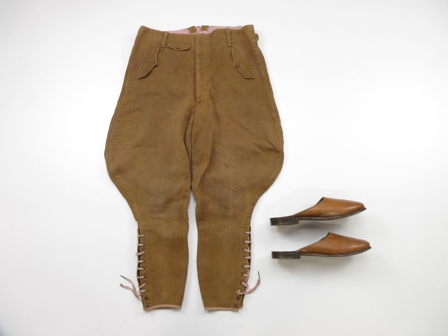 WWII GERMAN TYPE NSDAP JODHPUR PANTS AND SLIPPERS LOT. LOT INCLUDES; (1) PAIR OF BROWN CORDUROY PANTS WITH PINK COTTON LINING & LEG CUFF LACES, FLY-FRONTED, BROWN POLYMER BUTTONS, SOME MARKED: "FRANKFURT AM, TH. BUTTNER.", TWO SLANTED FRONT POCKETS & ONE SMALL WATCH POCKET, ONE REAR POCKET, POSSIBLY PRIVATE PURCHASE, NO VISIBLE MARKINGS, NO VISIBLE THREADS GLOW, WAIST APPROX. 33" & (1) PAIR OF BROWN LEATHER SLIPPERS, SOLES MARKED: "42", POSSIBLY PRIVATE PURCHASE OR CIVILIAN, UNSURE. SEE PHOTOS.