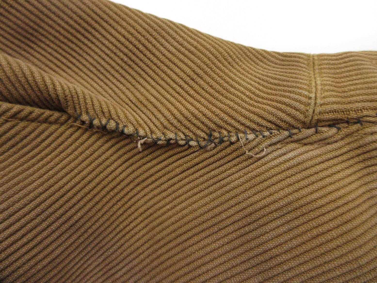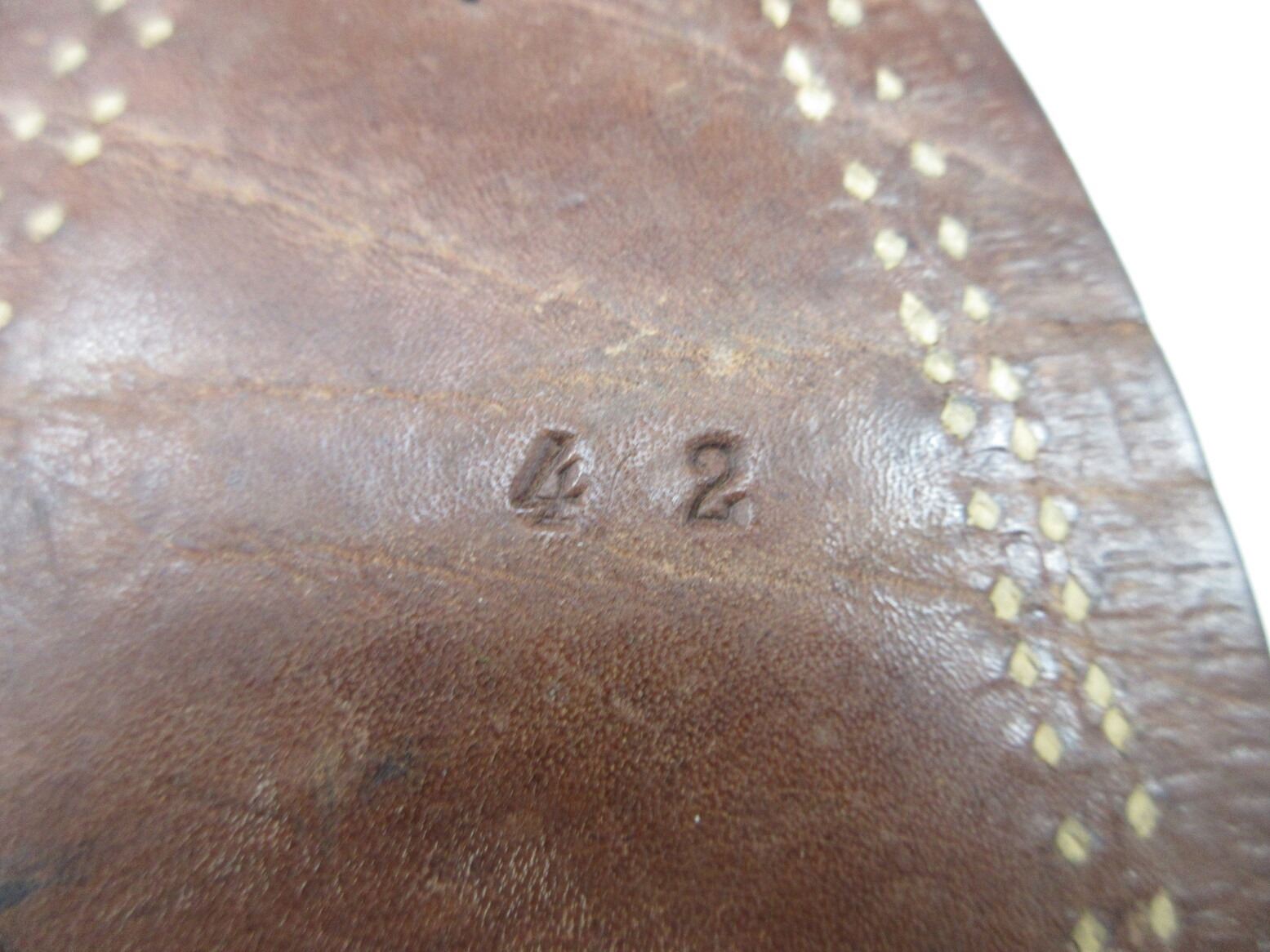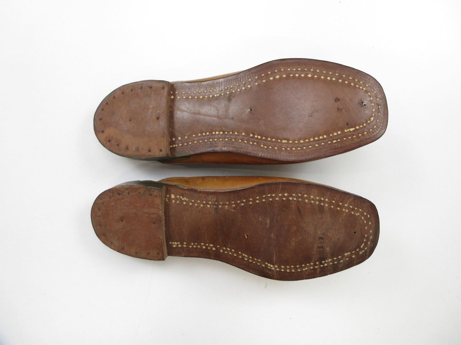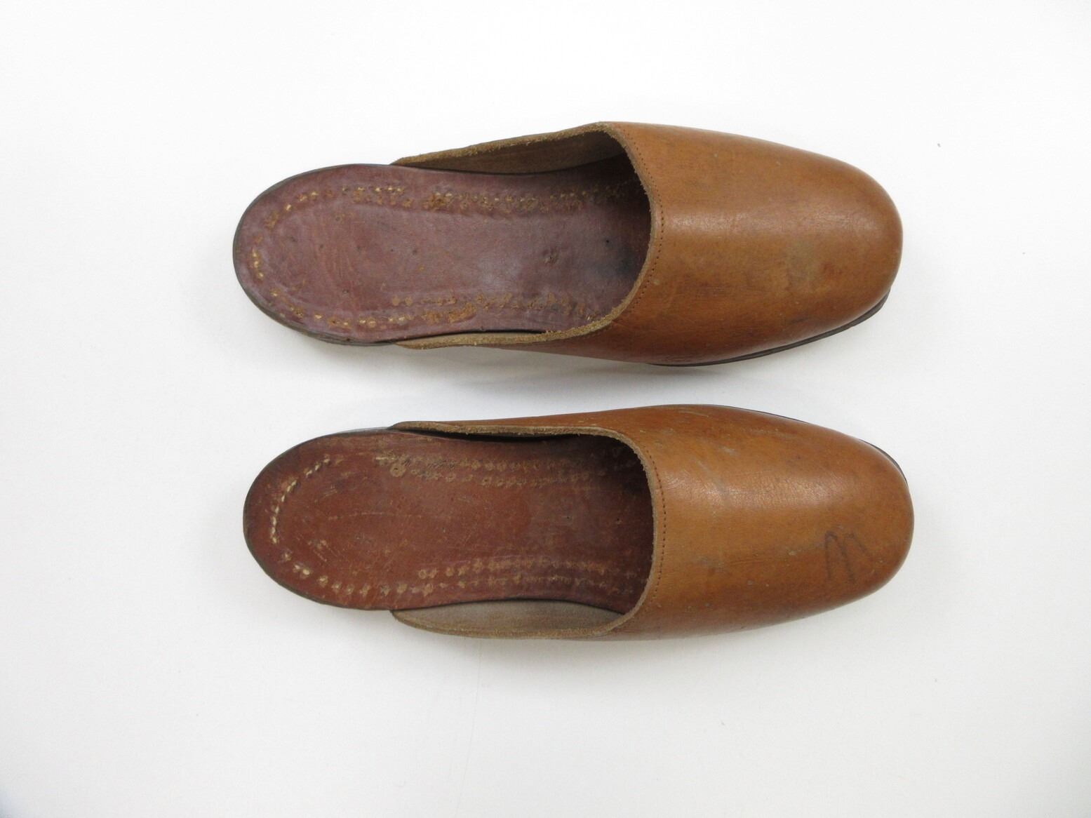 WWII GERMAN TYPE NSDAP JODHPUR PANTS AND SLIPPERS LOT. LOT INCLUDES; (1) PAIR OF BROWN CORDUROY PANTS WITH PINK COTTON LINING & LEG CUFF LACES, FLY-FRONTED, BROWN POLYMER BUTTONS, SOME MARKED: "FRANKFURT AM, TH. BUTTNER.", TWO SLANTED FRONT POCKETS & ONE SMALL WATCH POCKET, ONE REAR POCKET, POSSIBLY PRIVATE PURCHASE, NO VISIBLE MARKINGS, NO VISIBLE THREADS GLOW, WAIST APPROX. 33" & (1) PAIR OF BROWN LEATHER SLIPPERS, SOLES MARKED: "42", POSSIBLY PRIVATE PURCHASE OR CIVILIAN, UNSURE. SEE PHOTOS.