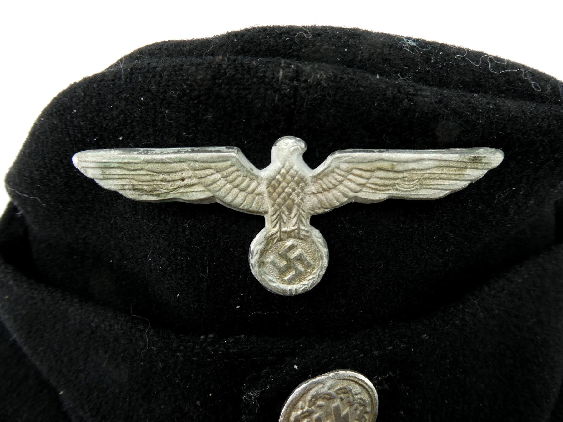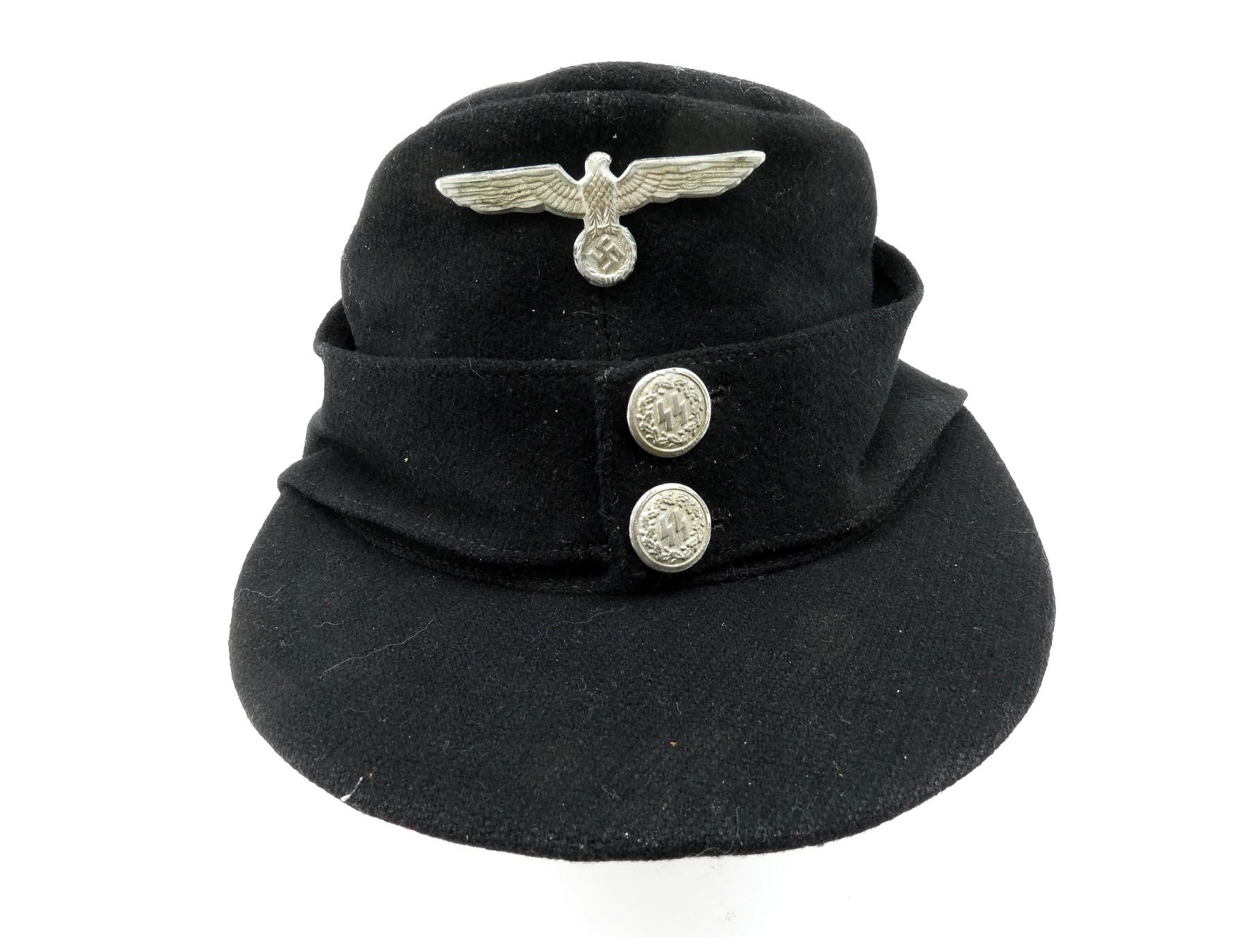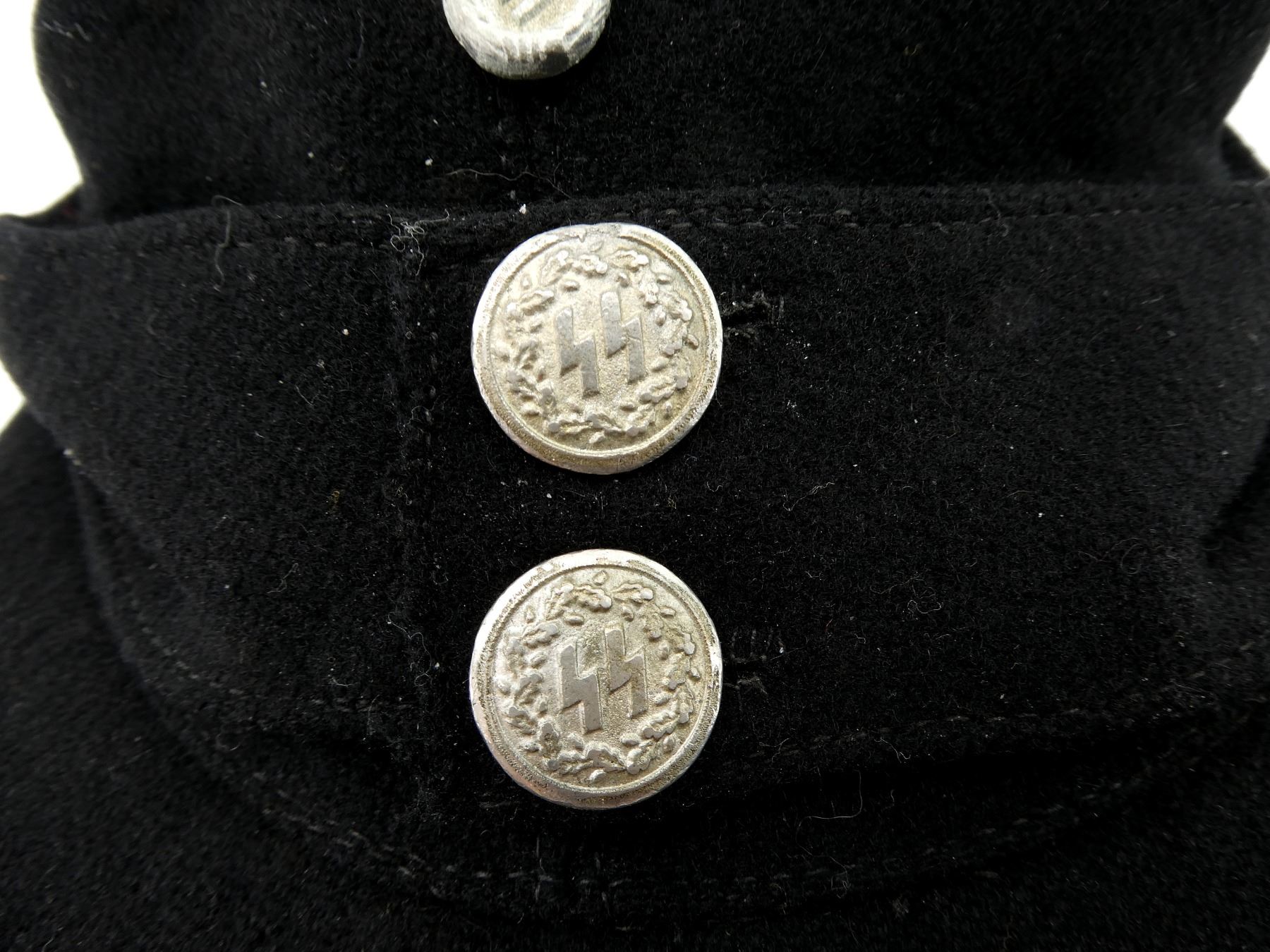 (1) BLACK WOOL FIELD CAP WITH EAGLE HOLDING SWASTIKA CAP BADGE, SILVER SS BUTTONS WITH OAK LEAF / ACORN DESIGN, BACK OF BUTTONS MARKED: "M5/8" (E W. ASSMANN & SOHNE, LUDENSCHEID), NO VISIBLE MARKINGS ON CAP, SOME SWEAT WEAR INSIDE, THREADING DOES NOT APPEAR TO GLOW. SEE PHOTOS.