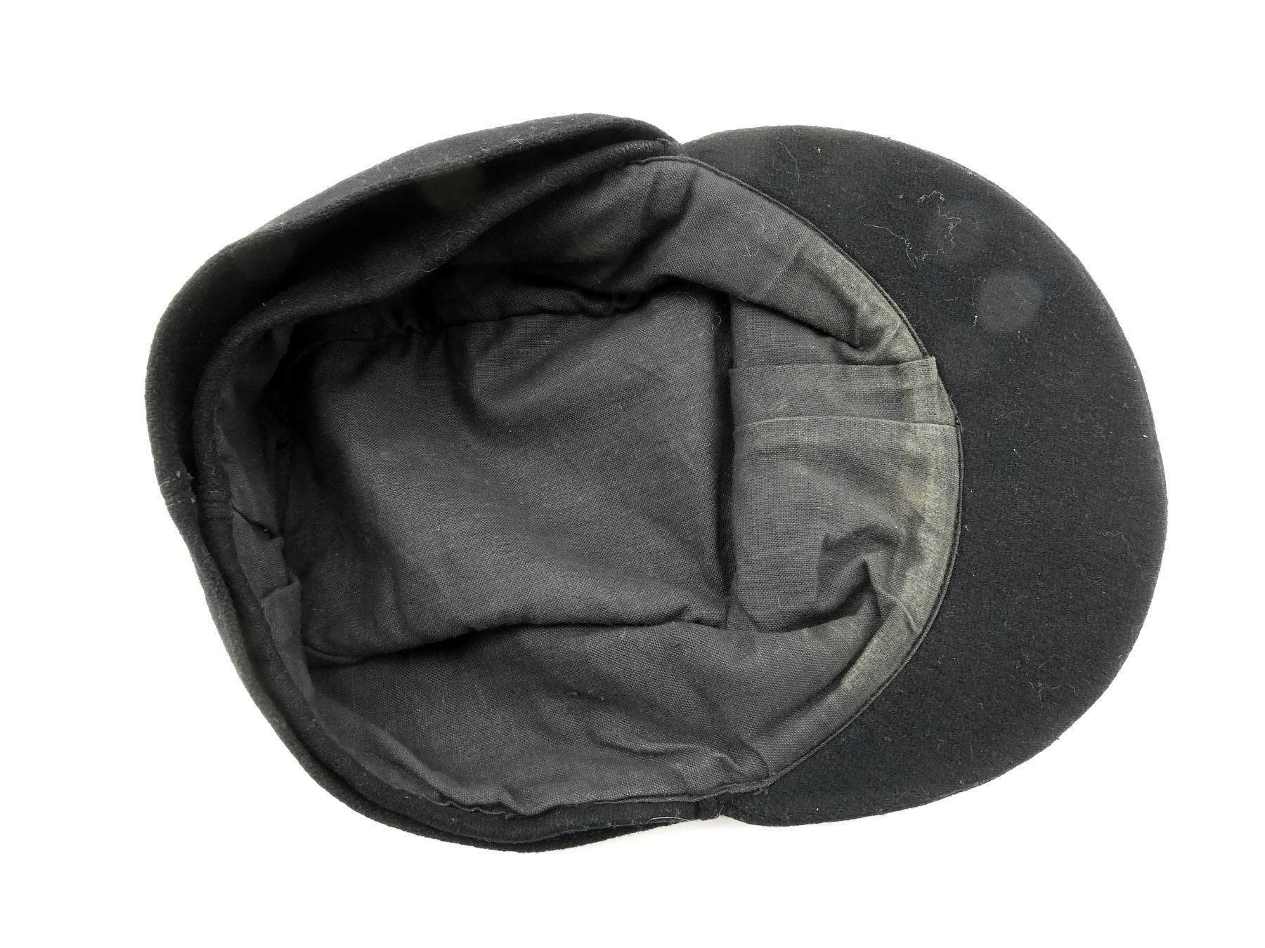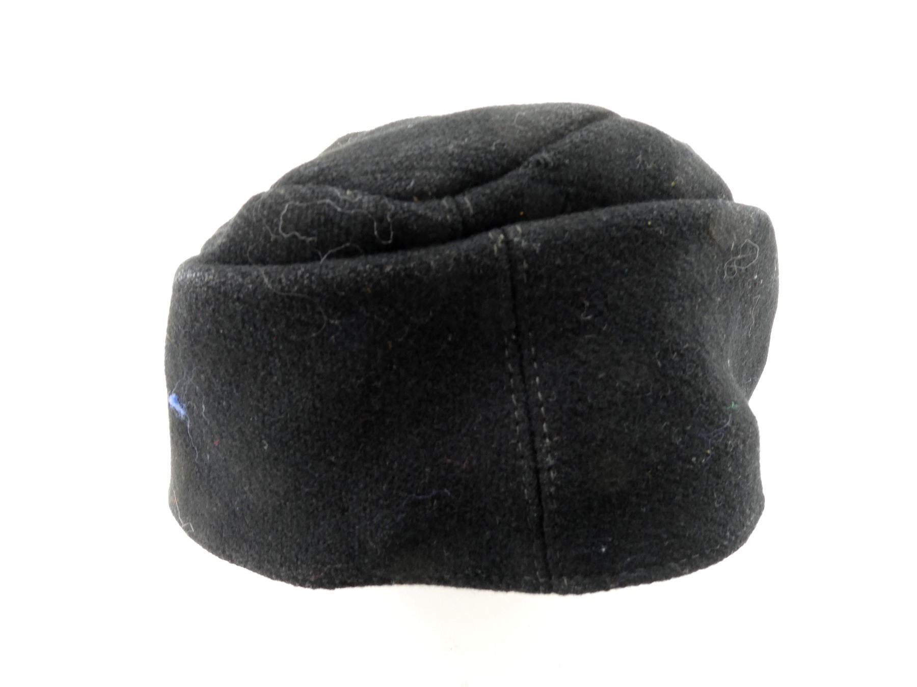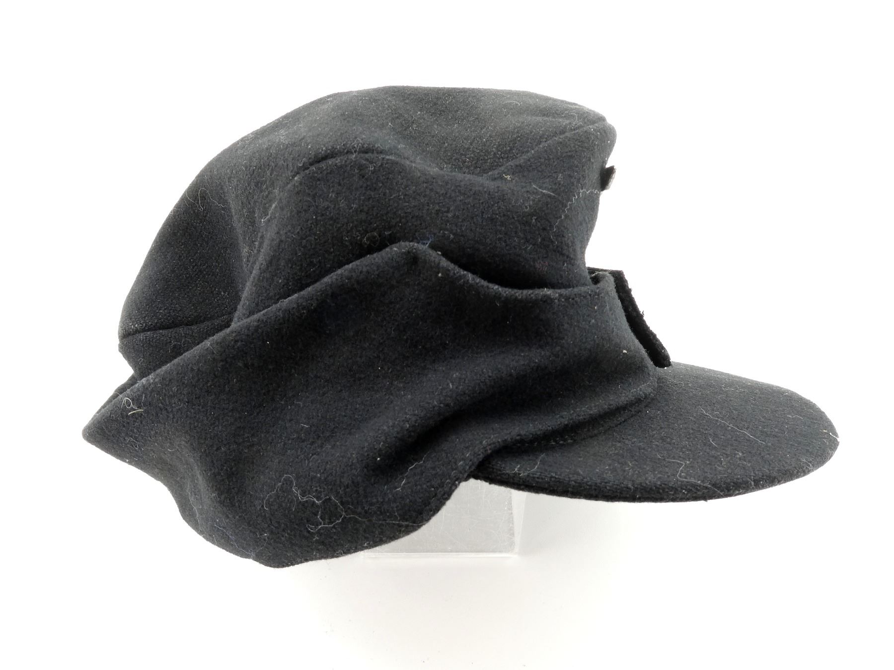 (1) BLACK WOOL FIELD CAP WITH EAGLE HOLDING SWASTIKA CAP BADGE, SILVER SS BUTTONS WITH OAK LEAF / ACORN DESIGN, BACK OF BUTTONS MARKED: "M5/8" (E W. ASSMANN & SOHNE, LUDENSCHEID), NO VISIBLE MARKINGS ON CAP, SOME SWEAT WEAR INSIDE, THREADING DOES NOT APPEAR TO GLOW. SEE PHOTOS.