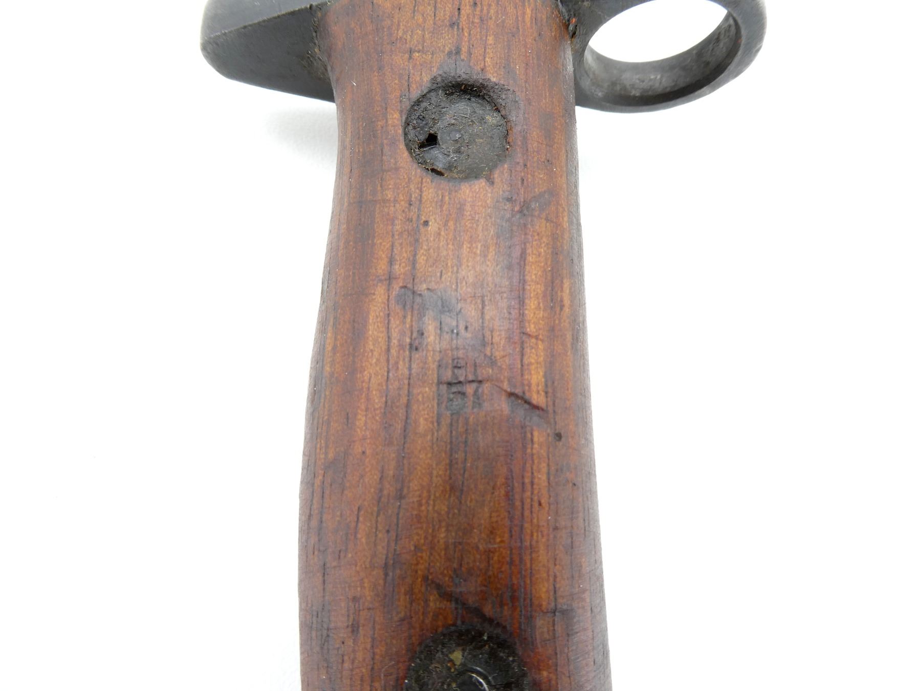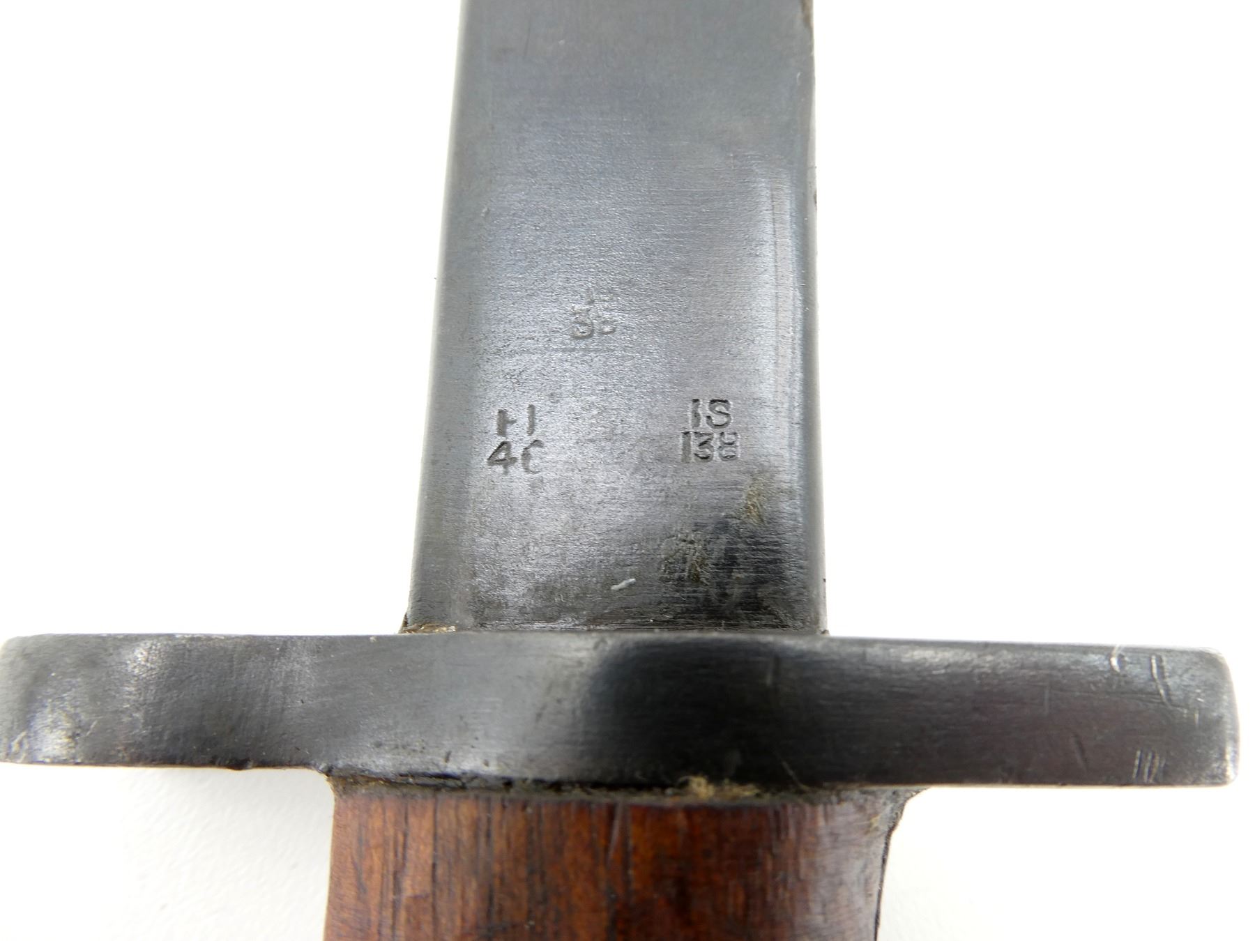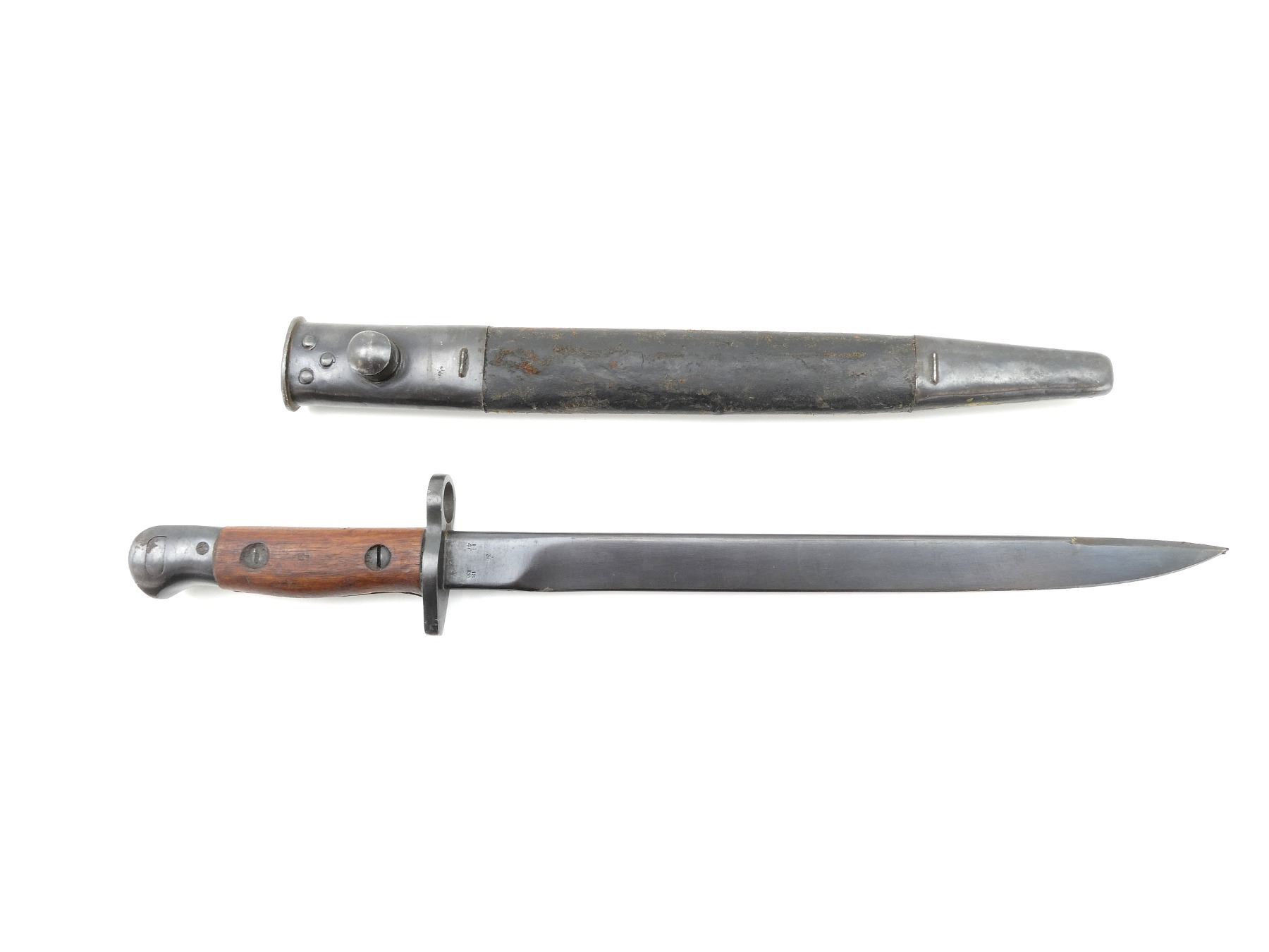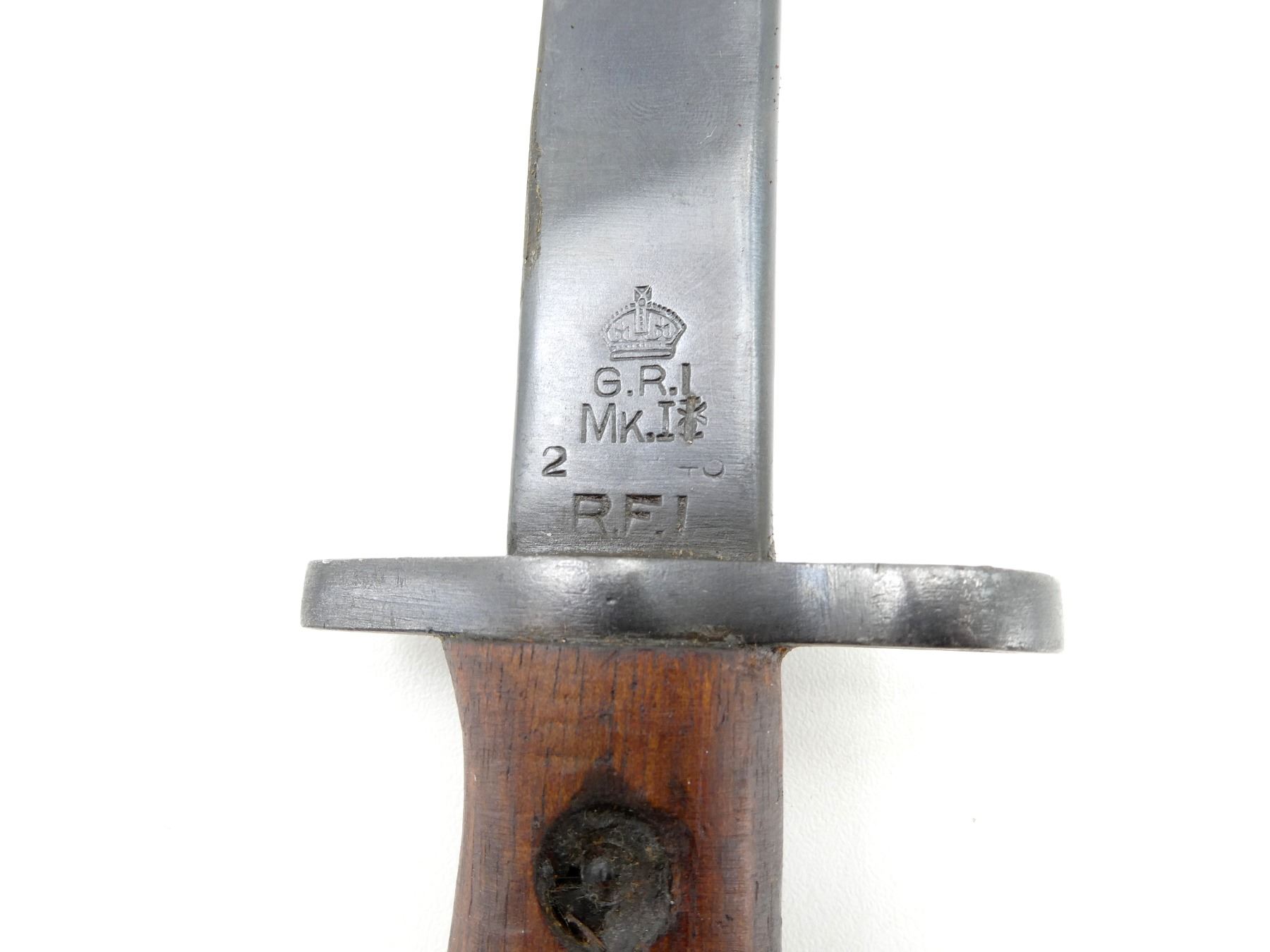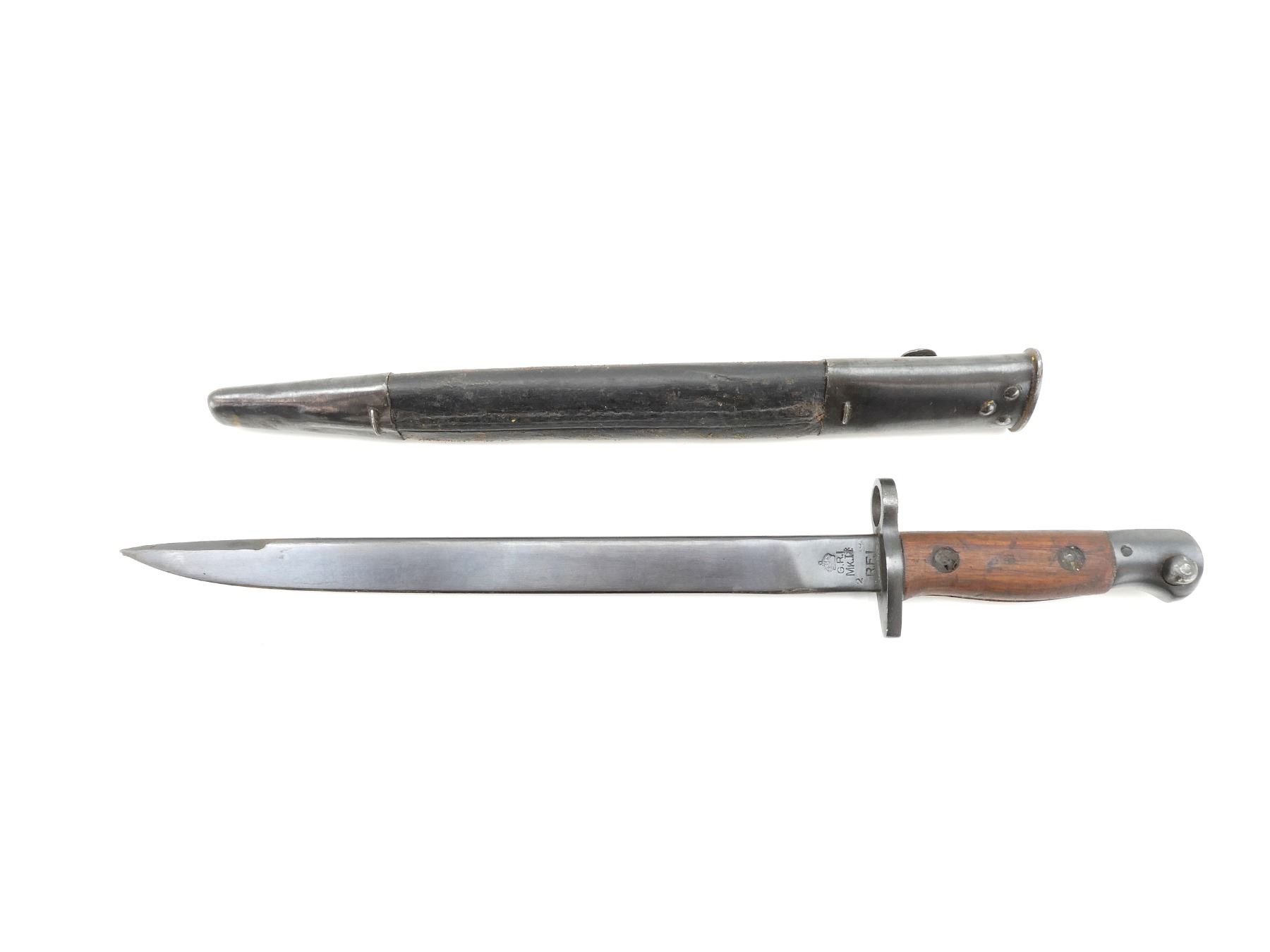 (1) FITS LEE ENFIELD NO.1 MKIII RIFLES, RICASSO MARKED: CROWN OVER "G.R.I" OVER "MK.II*" OVER "2 43" OVER "R.F.I", OTHER SIDE WITH VARIOUS PROOF MARKS, 2-PIECE WOODEN GRIP WITH FAINT PROOF MARK ON EITHER SIDE, METAL POMMEL, NO VISIBLE MARKINGS, LEATHER & METAL SCABBARD, NO VISIBLE MARKINGS, BLADE APPROX. 12" & OVERALL LENGTH APPROX. 16.75". SEE PHOTOS.