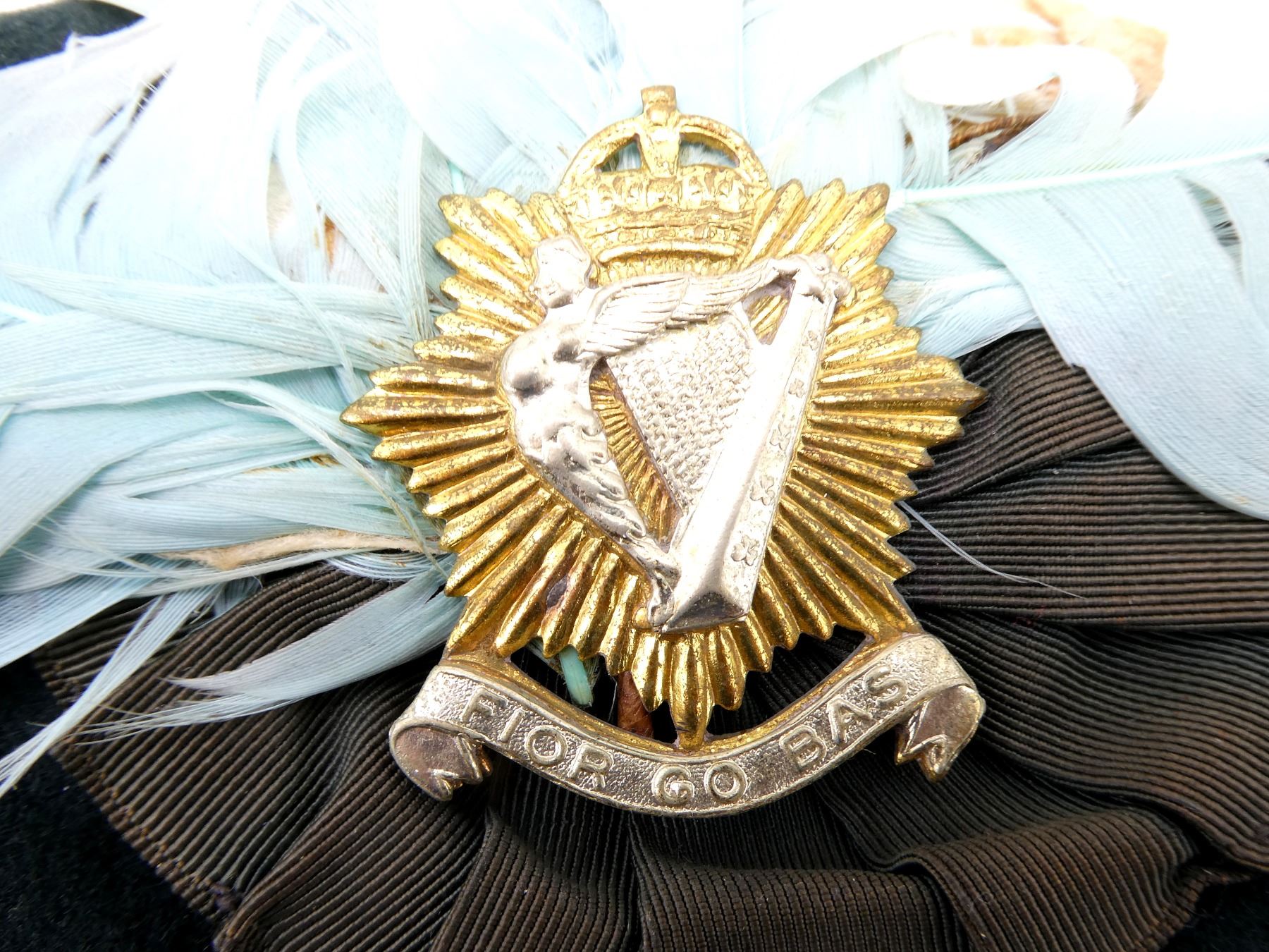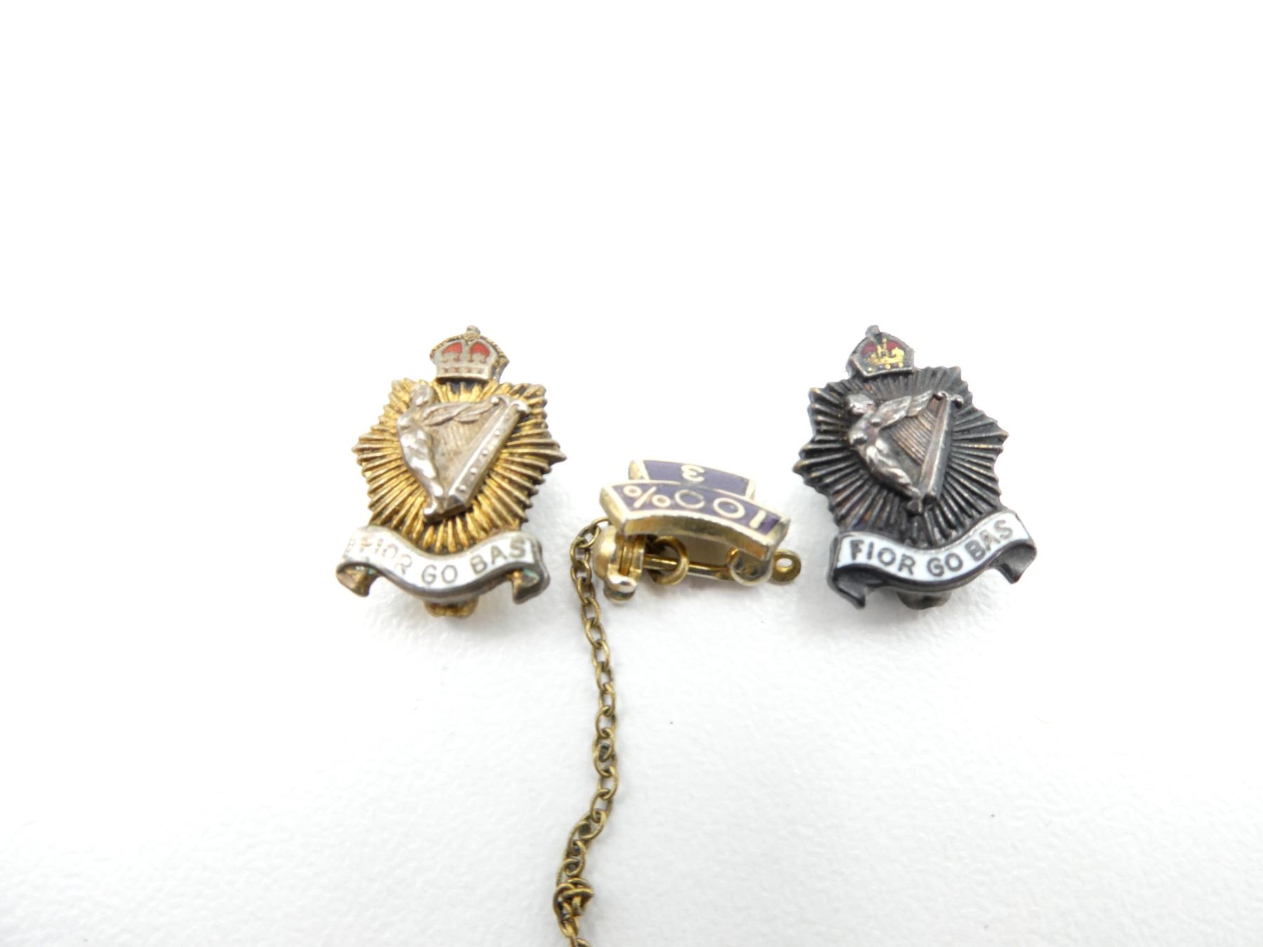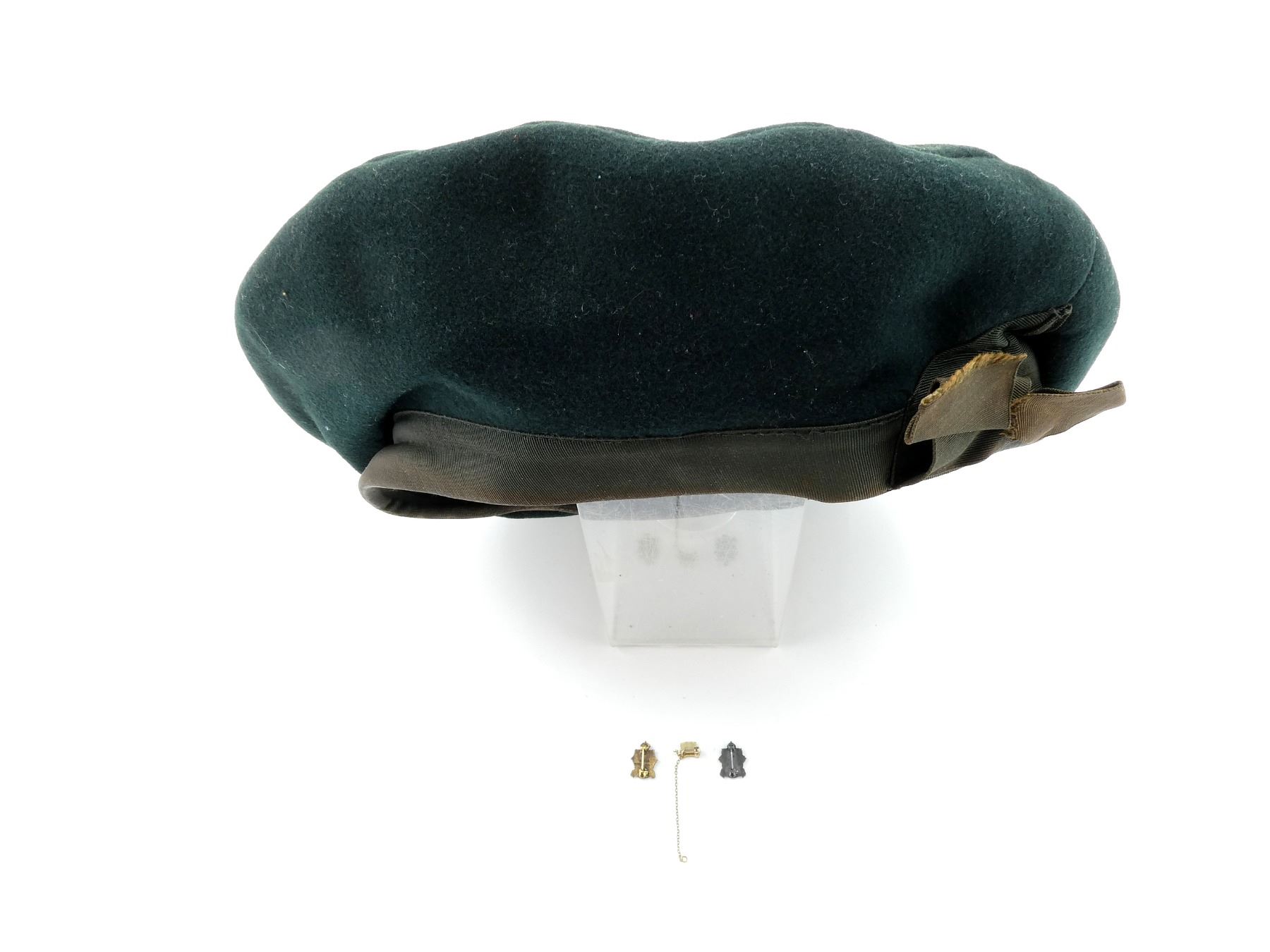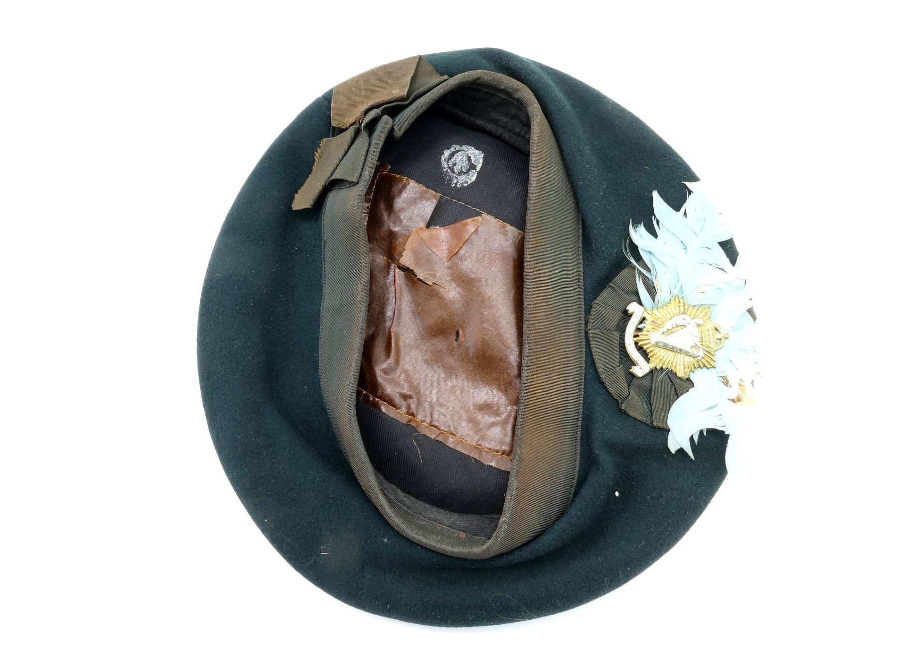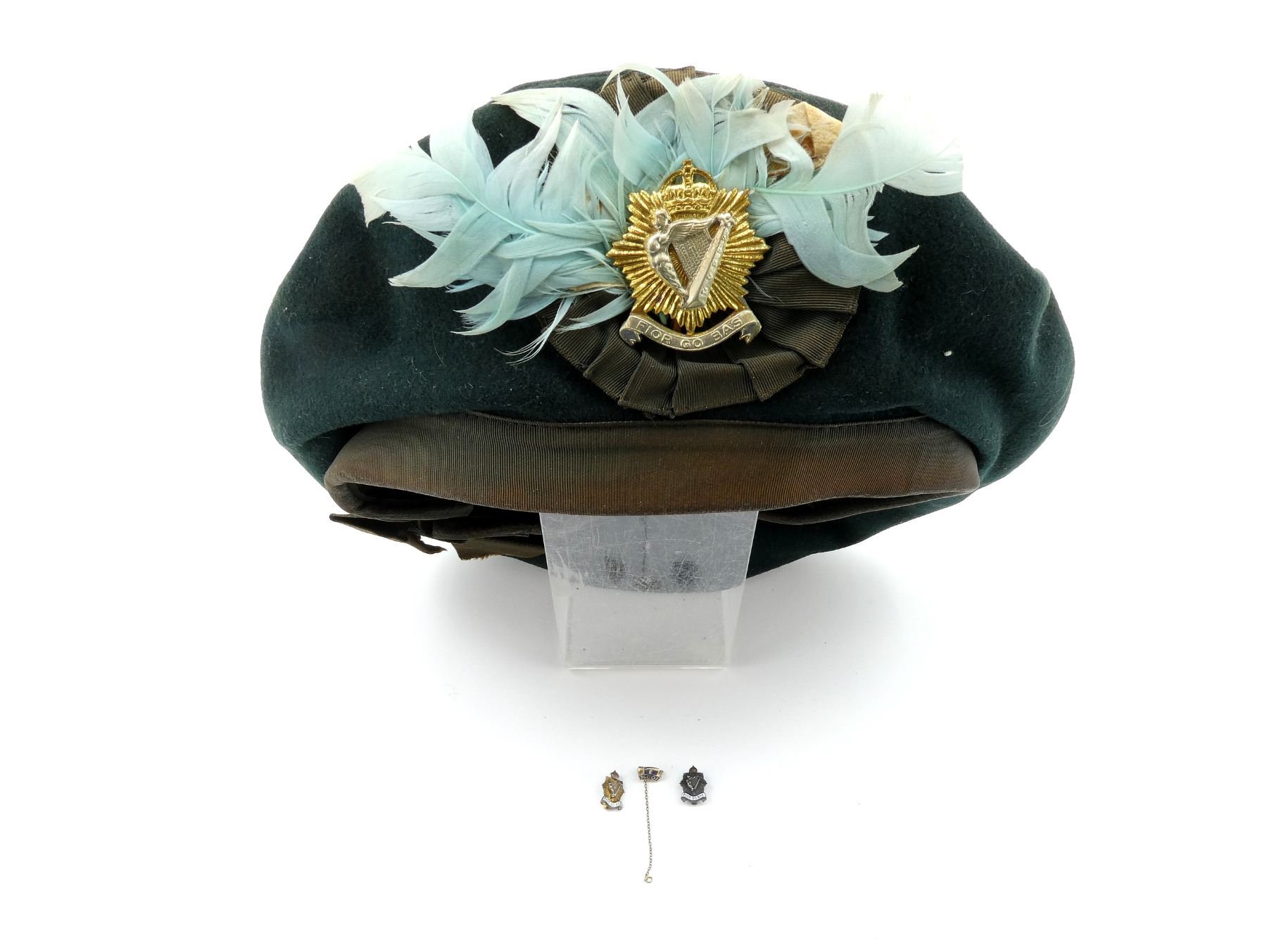 LOT INCLUDES; (1) GREEN WOOL BERET WITH FEATHERS PINNED TO BERET USING SILVER / GOLD COLOURED METAL IRISH REGIMENT CAP BADGE, BERET INK STAMPED WITH C-BROAD ARROW & 7 1/8 SIZING, SHOWS AGE / WEAR & (2) IRISH REGIMENT LAPEL PINS MARKED: "FIOR GO BAS". SEE PHOTOS.
