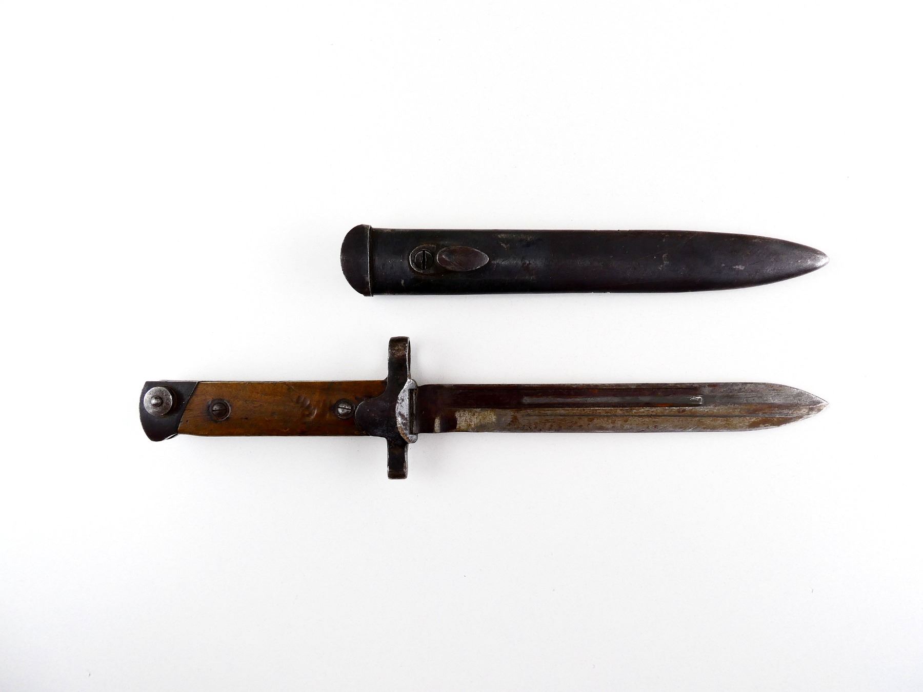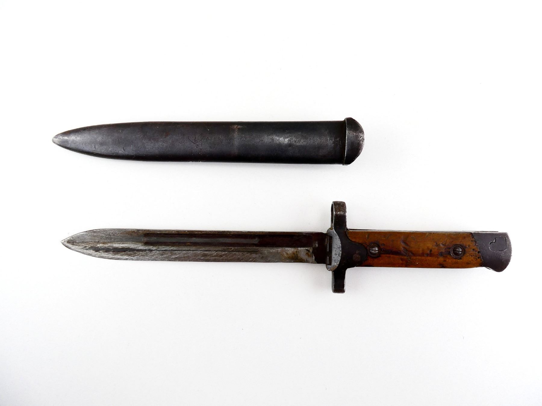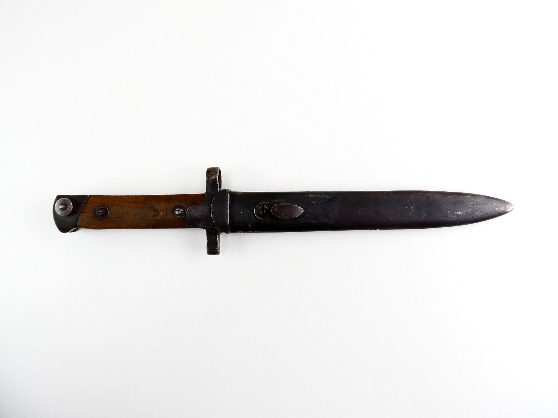 (1) FITS 6.5MM & 7.35MM M1938 MANNLICHER-CARCANO SHORT RIFLES, FIXED BLADE, 2-PIECE WOOD GRIP, METAL IN-BETWEEN WOOD MARKED: "MA" IN RECTANGULAR SHAPE, "A 92638", METAL POMMEL, NO VISIBLE MARKINGS, METAL SCABBARD, NO VISIBLE MARKINGS, BLADE APPROX. 6 7/8", OVERALL LENGTH APPROX. 11.25". SEE PHOTOS.