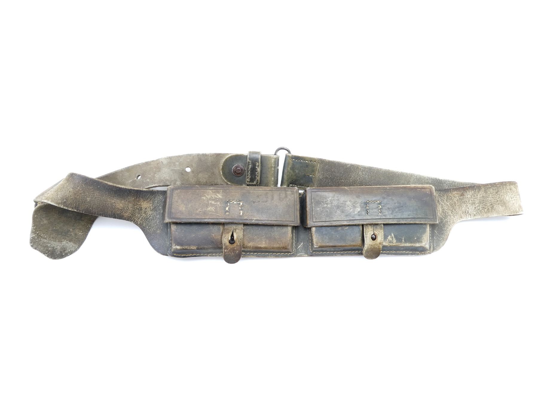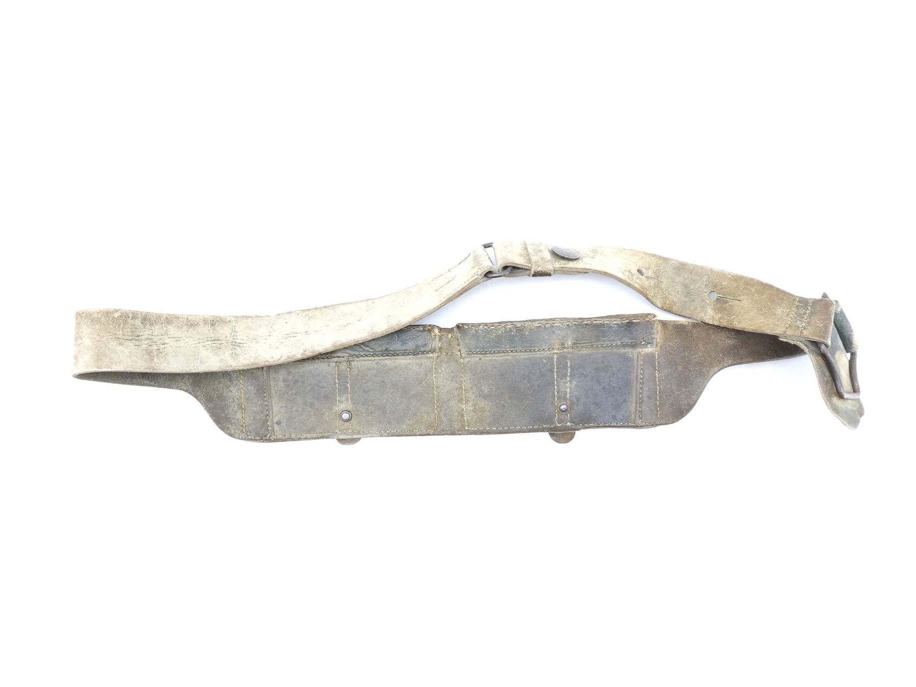 (1) FADED GREEN LEATHER BANDOLIER, FITS CARANO AMMO ON STRIPPER CLIPS, DOUBLE-POCKET AMMO POUCHES BUILT INTO BANDOLIER, NO VISIBLE MARKINGS, METAL FITTINGS, SHOWS AGE / WEAR. SEE PHOTOS.