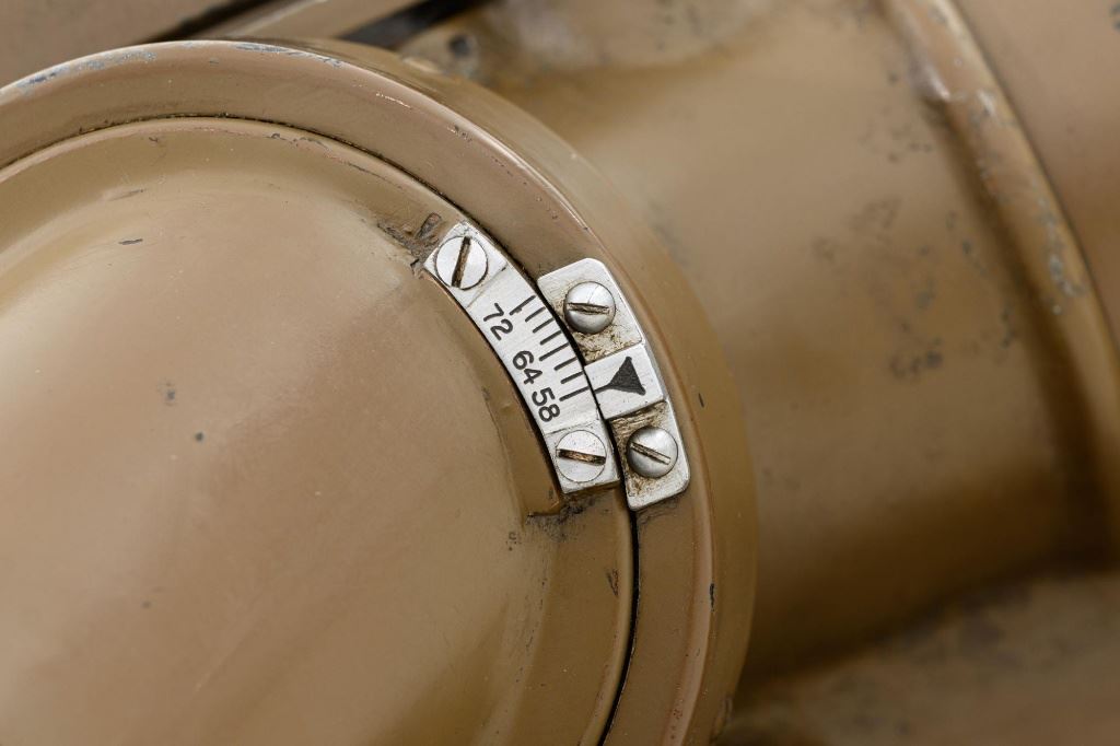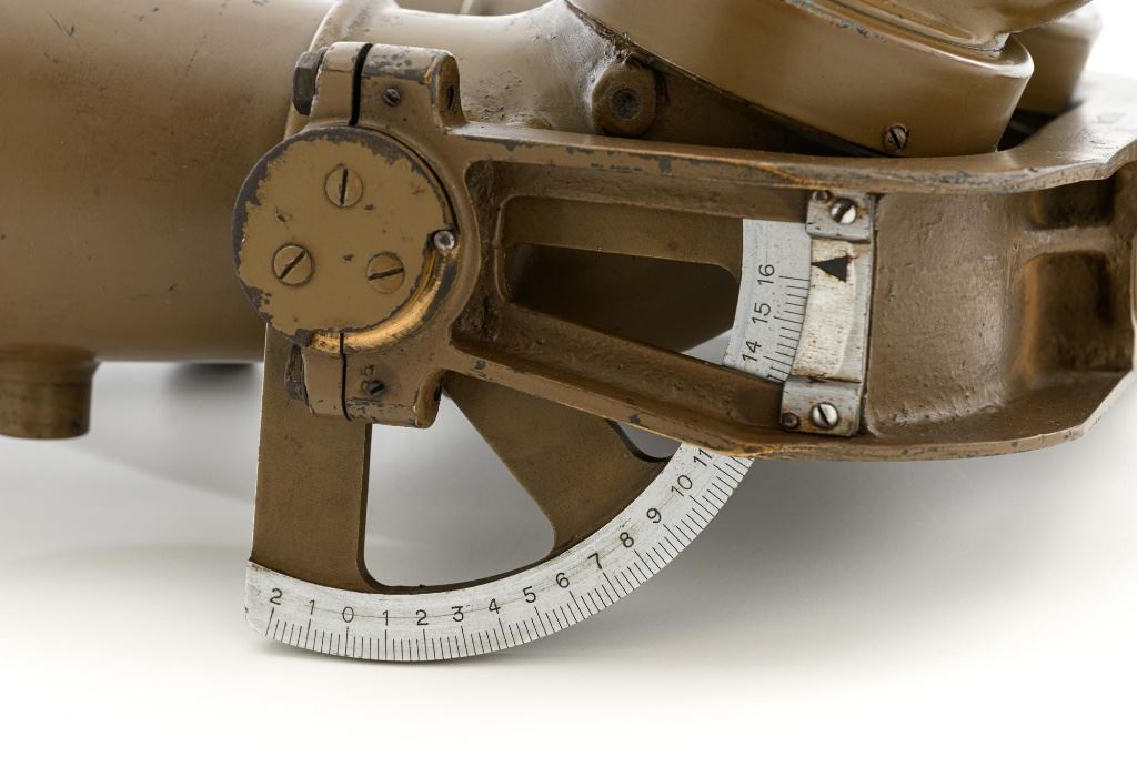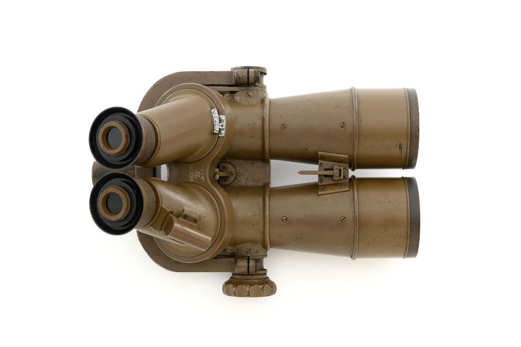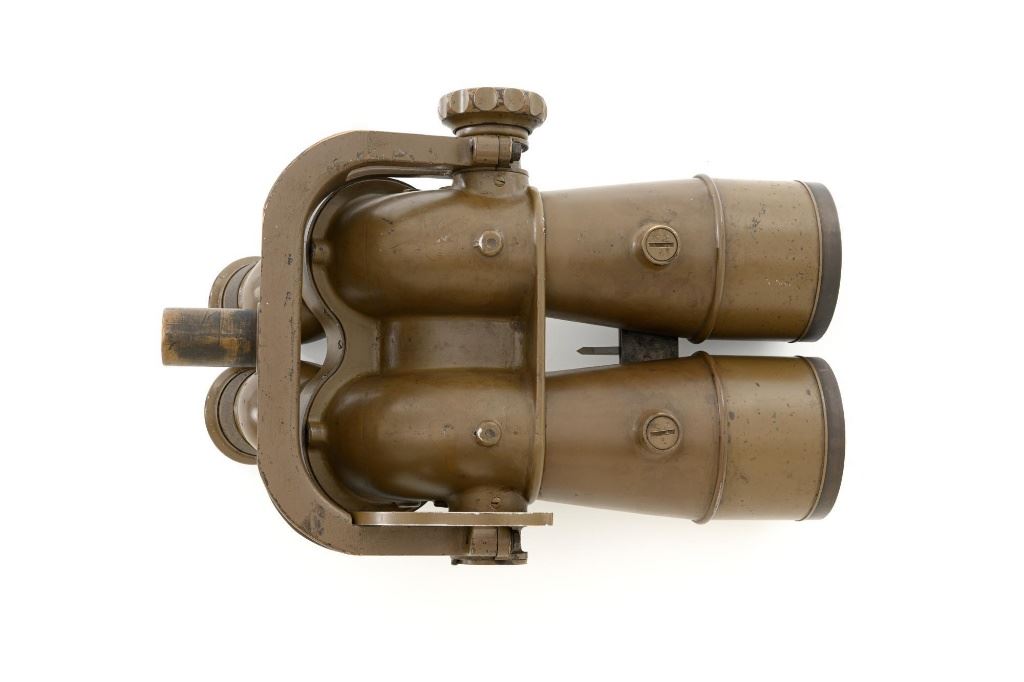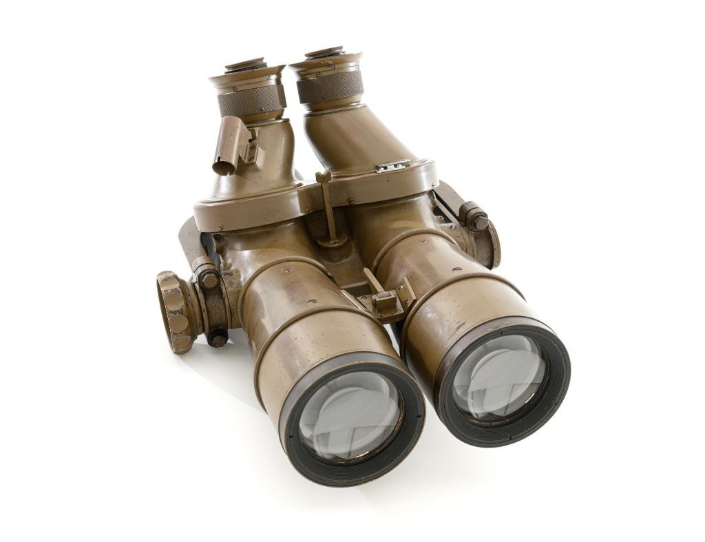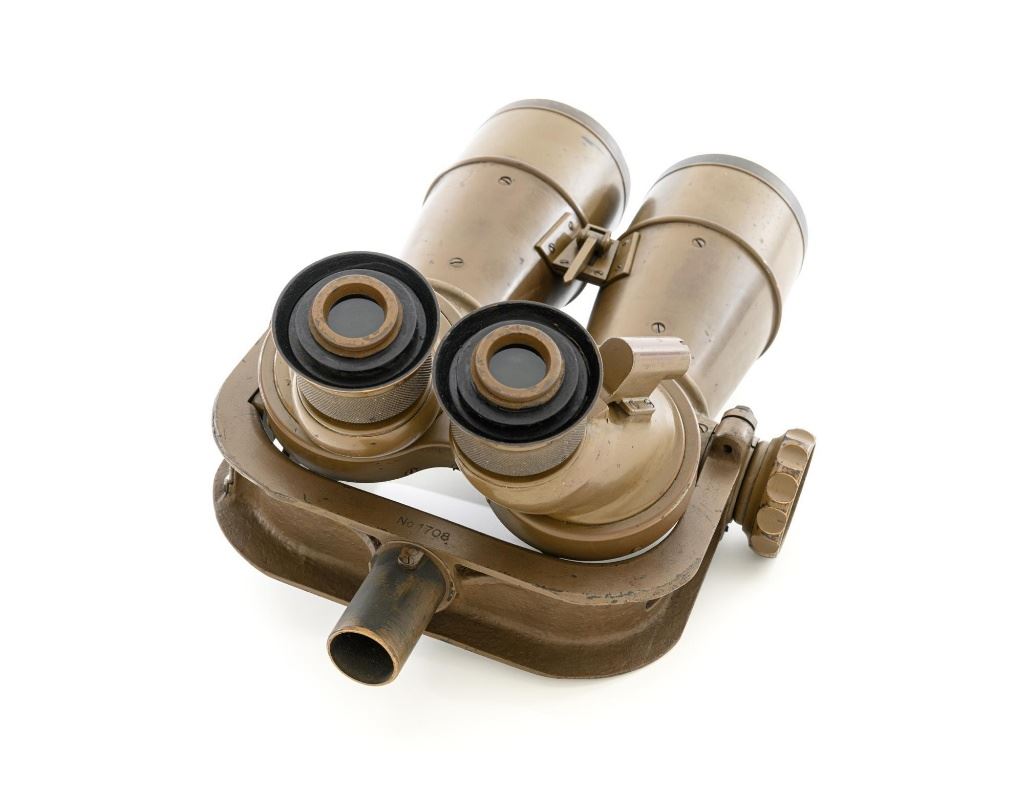 WWII Imperial Japanese Navy Deck Binoculars by Tokyo Optical Company, 10 x 6 high quality deck binoculars, mount and optic are serial numbered 1708. 60mm objective lenses, offset at 60 degrees. Individually-focused oculars, with diopter adjustment markings from -4 to +3. IPD adjusts from about 57mm to 72mm with a scale on the left side. Clean lenses, not scratched, view is very good, slightly dimmed. Right side with range finding reticle. Fixed rear and folding front sights. The body is very good overall, with the paint surviving and in fine condition. Sunshades move freely. Ocular lenses somewhat angled, not quite square, likely adjustable. Base of the mount is 1.1" diameter, easily adapted to display. Weight is 14 lb with mount. Est.: $1,000-$1,500.