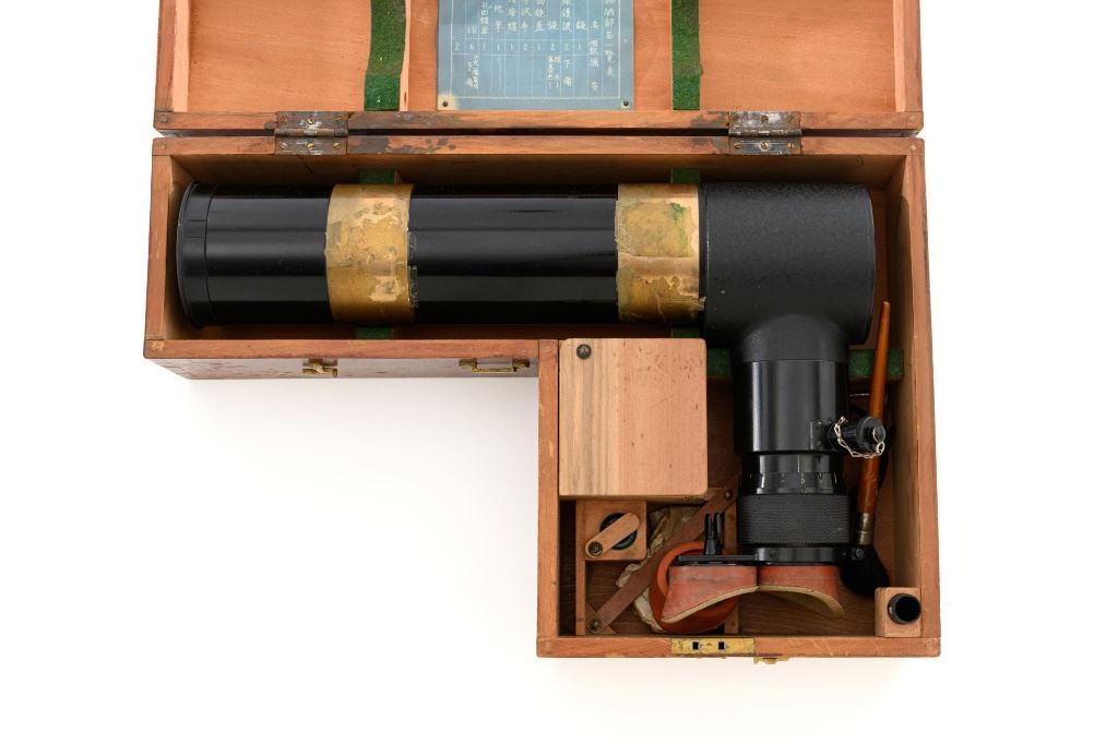 WWII Japanese 8cm High-Angle Telescope by NIKKO, 10 x 80mm 6 Type 5 telescope, made in 1941, #15 with matching numbered case. Made by Nippon Kogaku Kogyo Kabushikigaisha, or NIKKO (Japan Optical) which became Nikon. scope appears little used, with the exterior finish showing only light handling wear the winged rubber eyepieces clean and flexible, with inspection stamps still present. The view through the scope is very good, slightly hazy. Plain crosshair reticle. Eyepiece rotates for left or right eye use. Diopter stiffly adjustable from -4 to +2. Affixed inside the cover are "Handling Precautions for Eyepiece Rubber" (right side) and "Storage Parts List" (left). Brass lens cover is numbered "15" inside. Present are two spare rubber eyepieces, one still wrapped, the amber and green ocular lens filters, six replacement lamps, "Drying Hole Stopper" screwdriver, dust brush, and two (2) keys for the case. The 21" x 14" x 6-1/2" wood case shows much wear outside and remains very good inside, with some wear to the green felt that supports the piece. Scope is 18-1/4" long and weighs 26 lb. Est.: $1,200-$1,800.