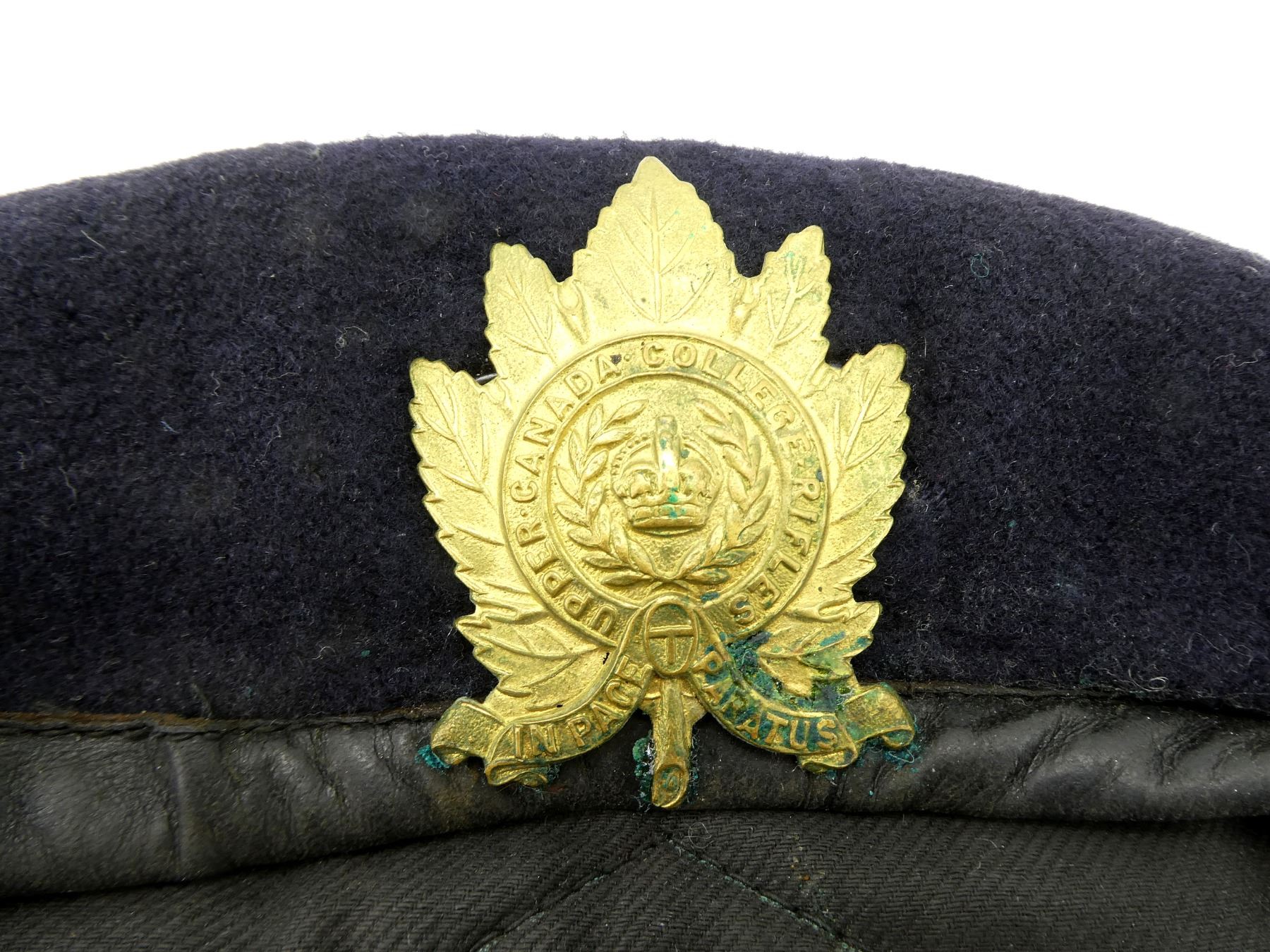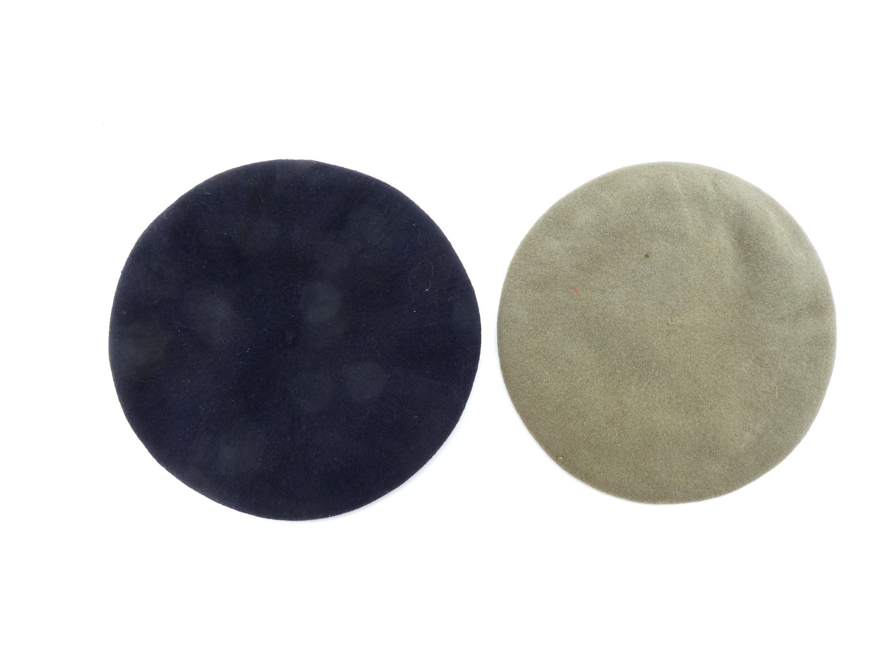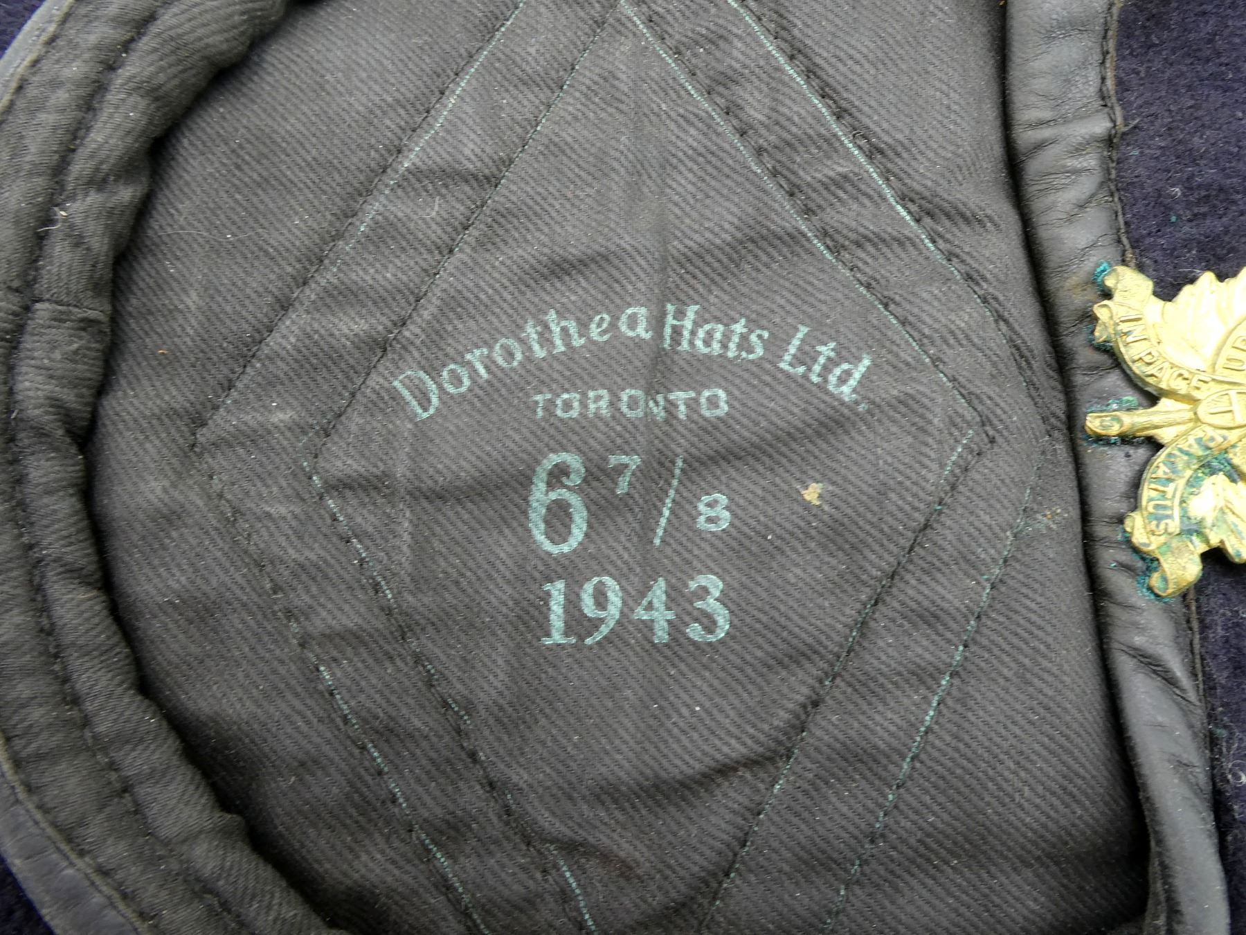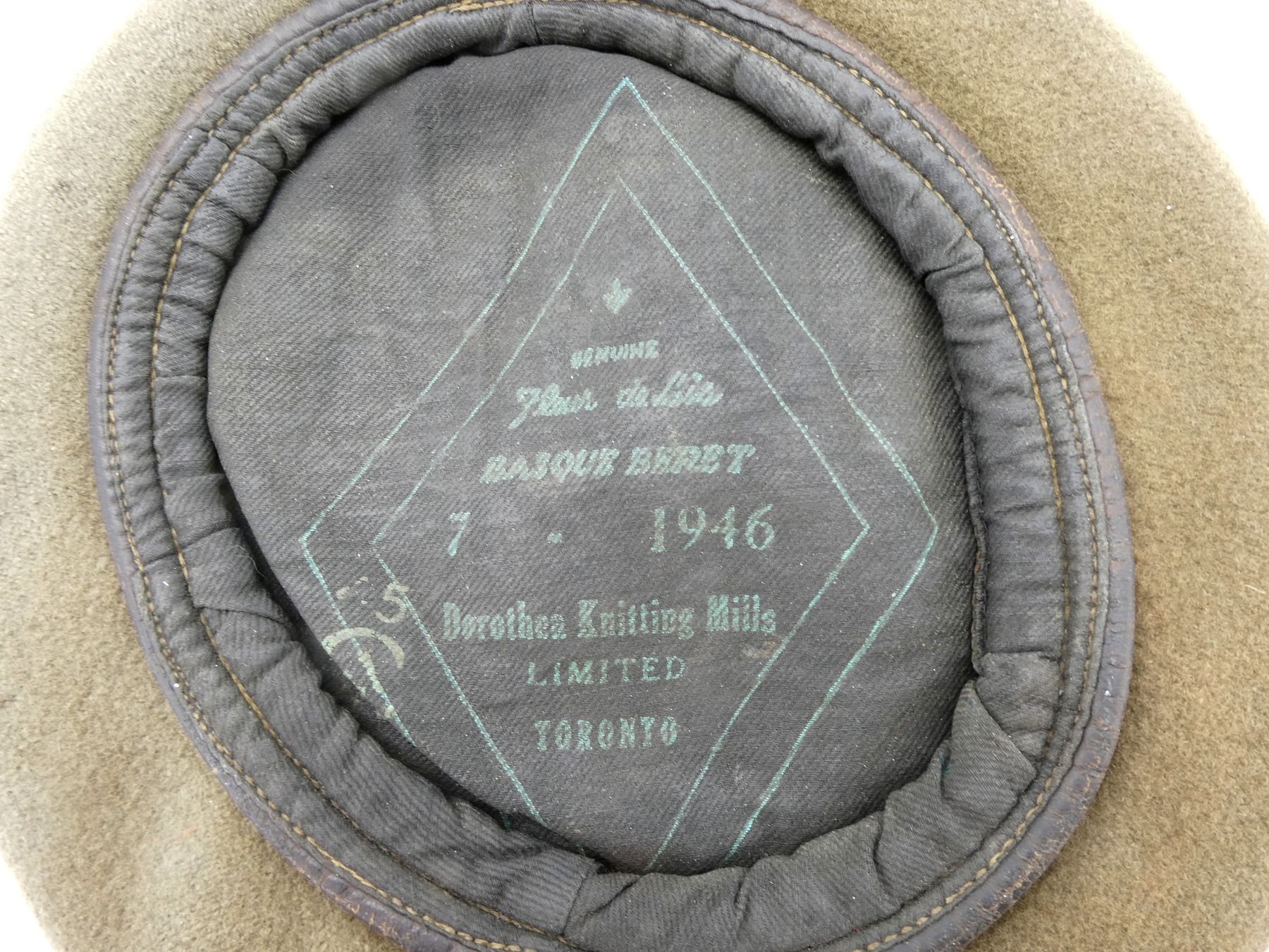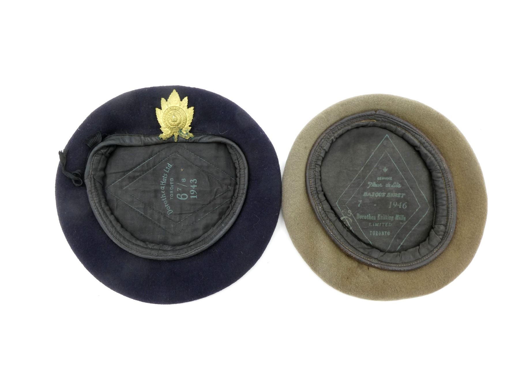 LOT INCLUDES; (1) WWII CANADIAN NAVY BLUE WOOL BERET WITH BRASS UPPER CANADA COLLEGE RIFLES MAPLE LEAF CAP BADGE, BERET MARKED: "DOROTHEA HATS LTD., TORONTO, 6 7/8, 1943", SHOWS SOME AGE / WEAR & (1) POST-WWII CANADIAN TAN WOOL BERET, NO CAP BADGE, BERET MARKED: "GENUINE, FLEUR DE LIS, BASQUE BERET, 7, 1946, DOROTHEA KNITTING MILLS, LIMITED, TORONTO" WITH C-BROAD ARROW, SHOWS AGE / WEAR. SEE PHOTOS.