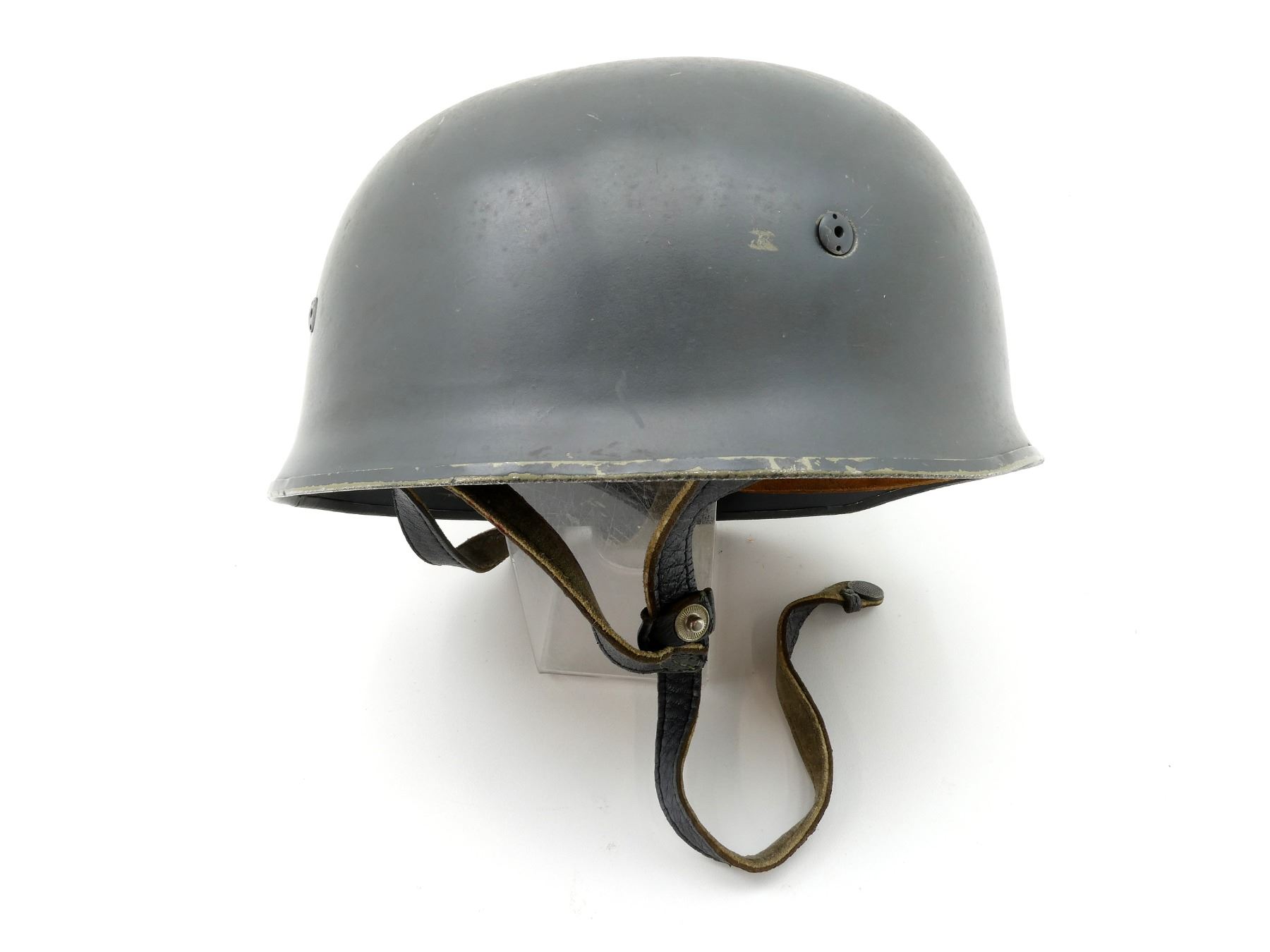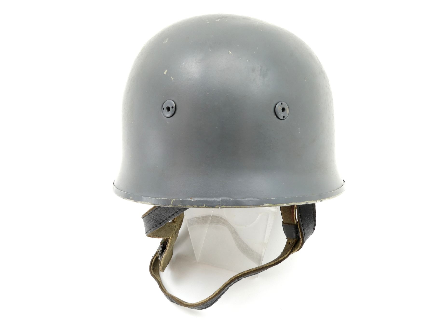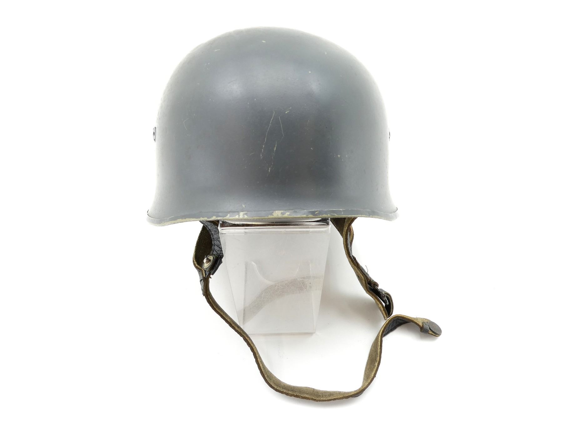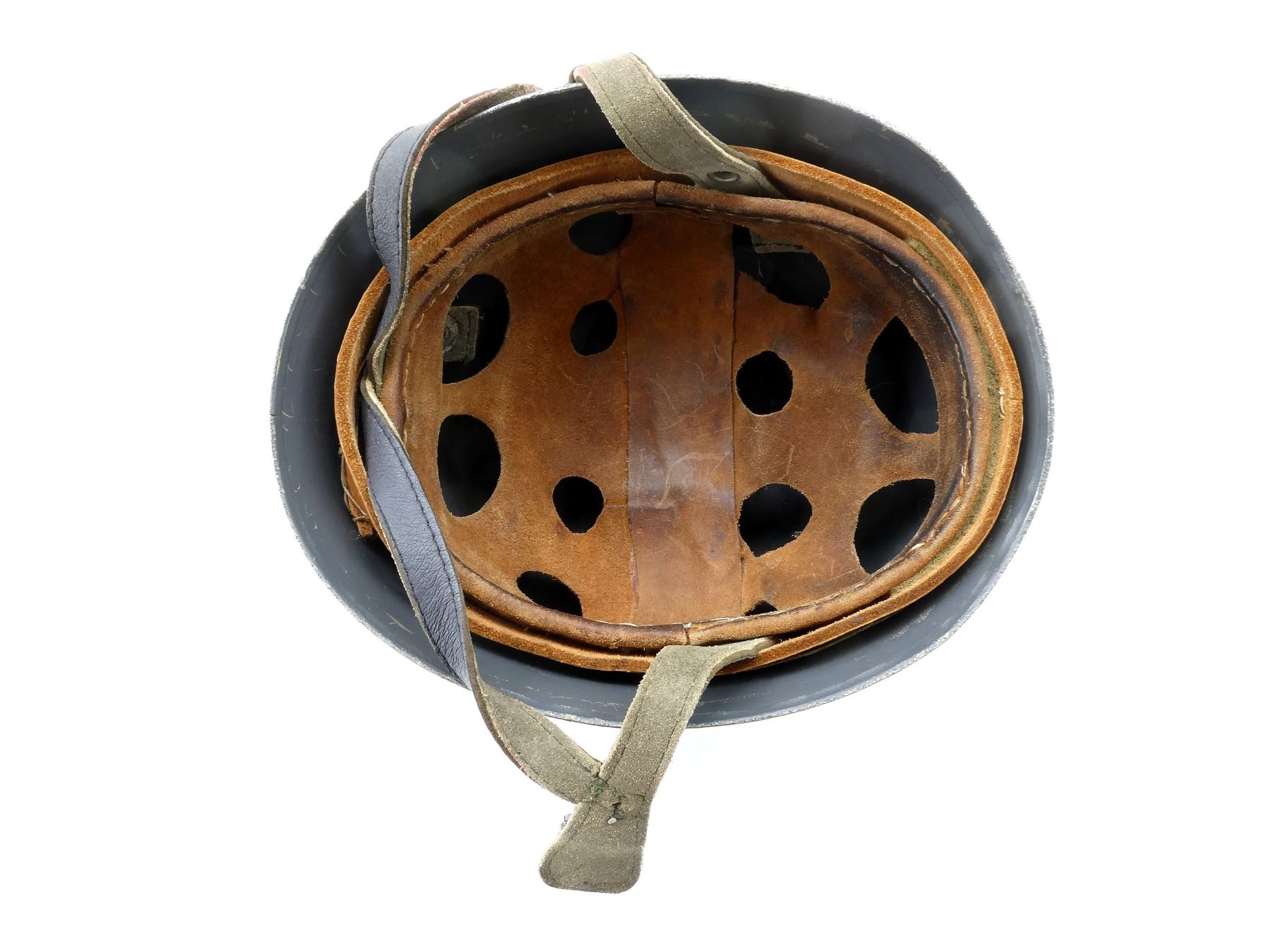 (1) GREY PAINTED HELMET (REPAINTED), ROLL EDGE, NO VISIBLE DECALS / NO VISIBLE MARKINGS, LINER REPLACED WITH POST-WWII BROWN LEATHER LINER, NO VISIBLE MARKINGS ON LINER, GREY LEATHER CHIN STRAP, NO VISIBLE MARKINGS, LINER / CHIN STRAP SHOWS SOME AGE / WEAR. SEE PHOTOS.