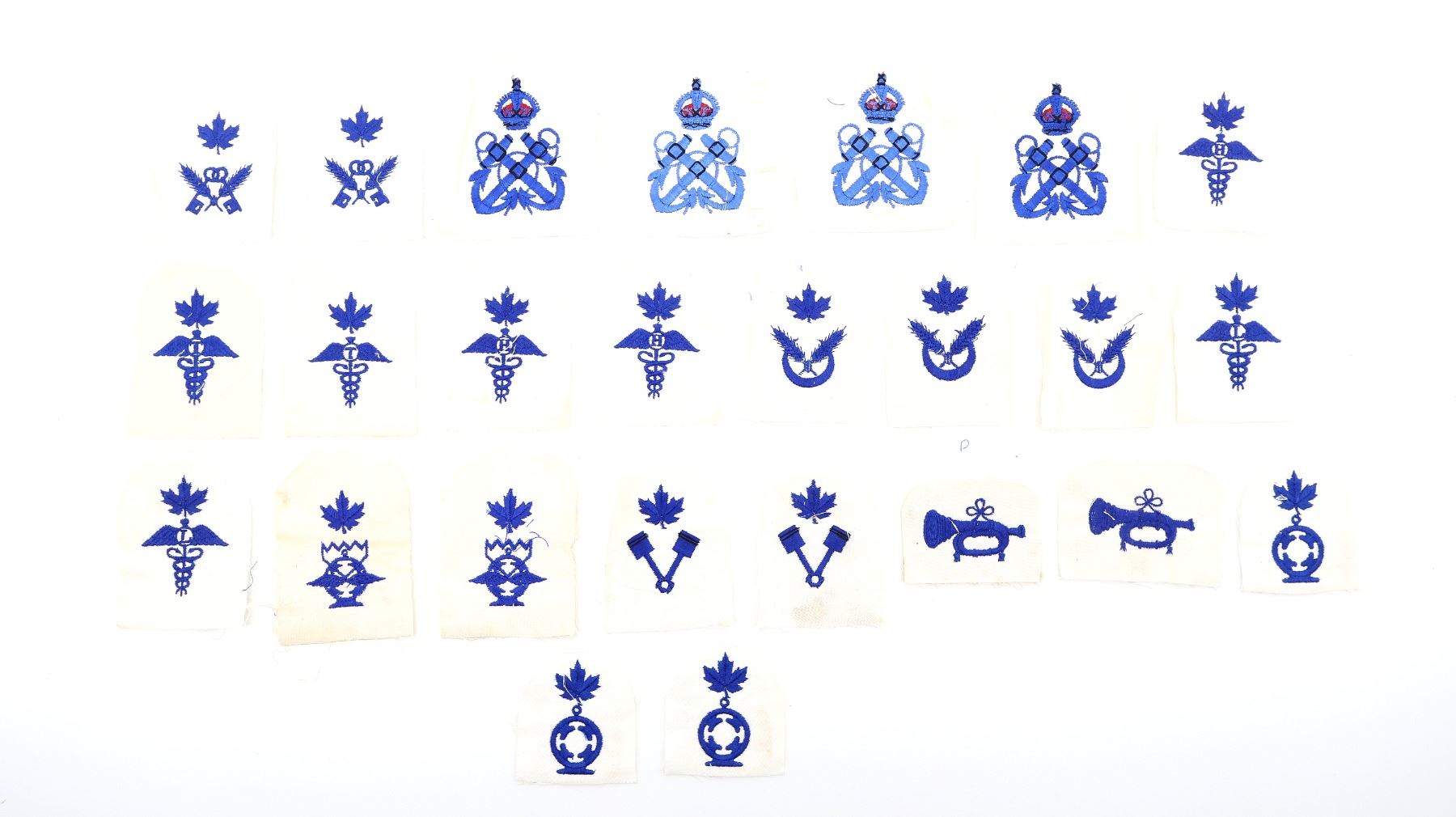 APPROX. (25) PIECES, VARIOUS MATERIALS / COLOURS / SIZES, INCLUDES; BUGLER, MECHANIC, AIR ELECTRICAL TECHNICIAN, ELECTRICIAN'S MATE, LABORATORY ASSISTANT, COOK, HYGIENE ASSISTANT, TECHNICAL ASSISTANT, STEWARD, ETC. SEE PHOTOS.