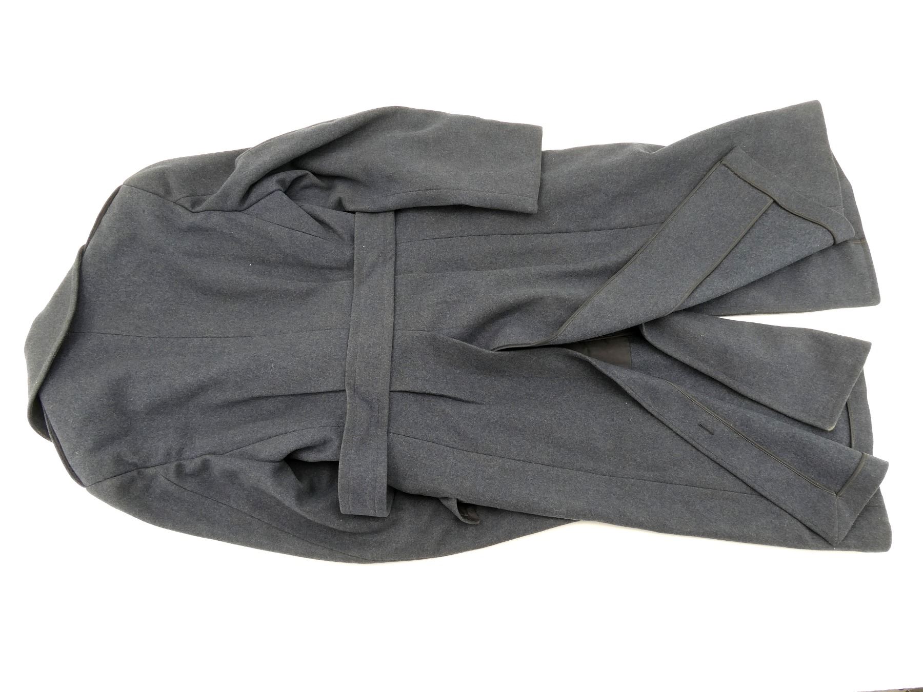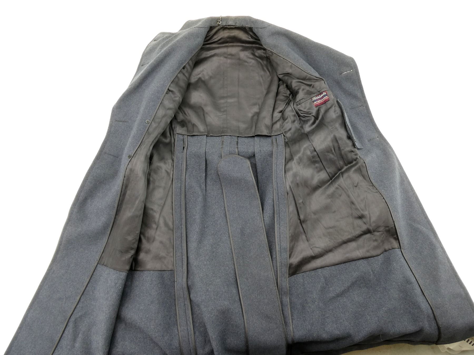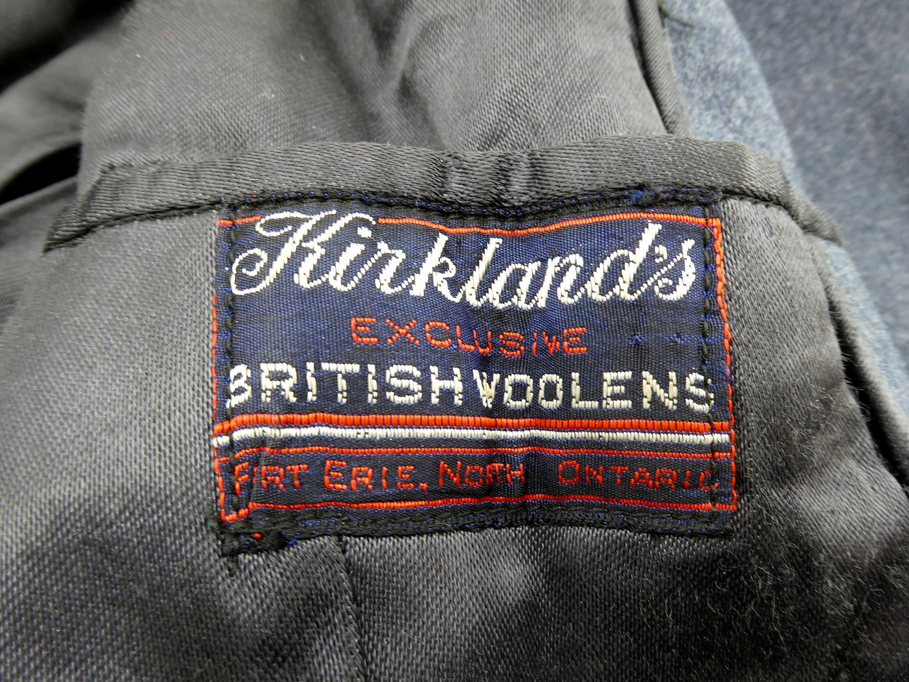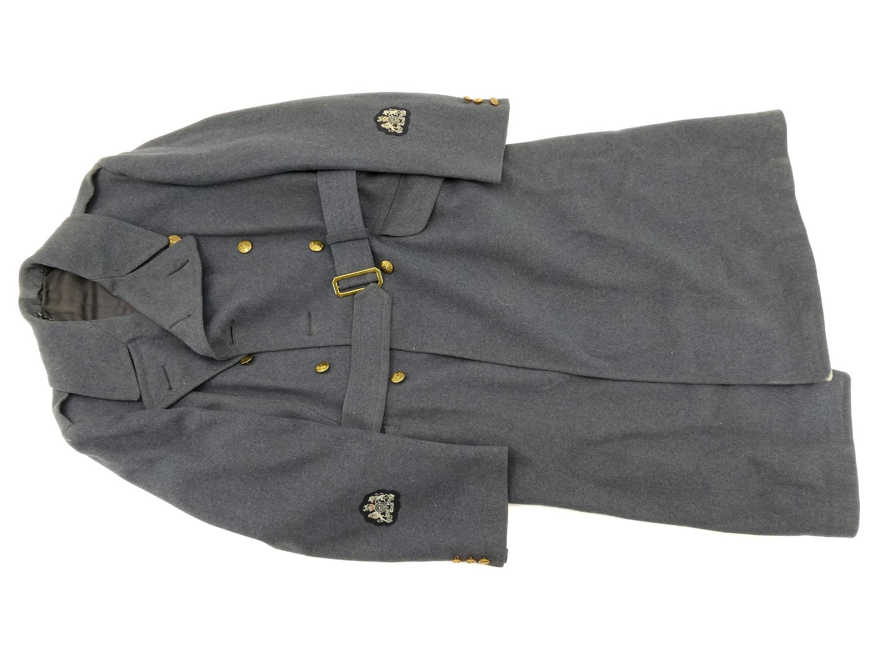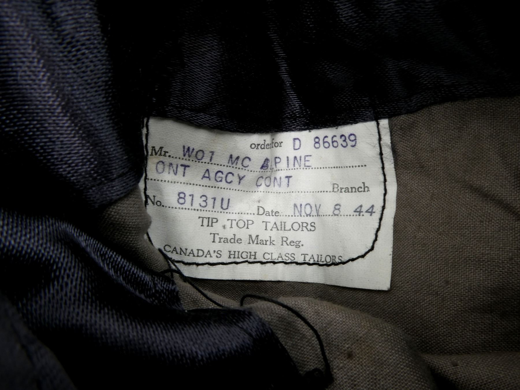 (1) BLUE WOOL GREAT COAT, MARKED: "KIRKLANDS, EXCLUSIVE, BRITISH WOOLENS, FORT ERIE, NORTH ONTARIO", "ORDER FOR D86639, MR. WO1 MC ALPINE, ONT AGCY CONT BRANCH, NO 8131U, DATE NOV 8 44, TIP TOP TAILORS" ETC., WARRANT OFFICER CLASS 1 CUFF BADGES, BRASS KING'S CROWN "R.C.A.F." BUTTONS, DOUBLE-BREASTED FRONT WITH WAIST BELT, SHOWS SLIGHT WEAR, SHOULDER WIDTH APPROX. 17". SEE PHOTOS.