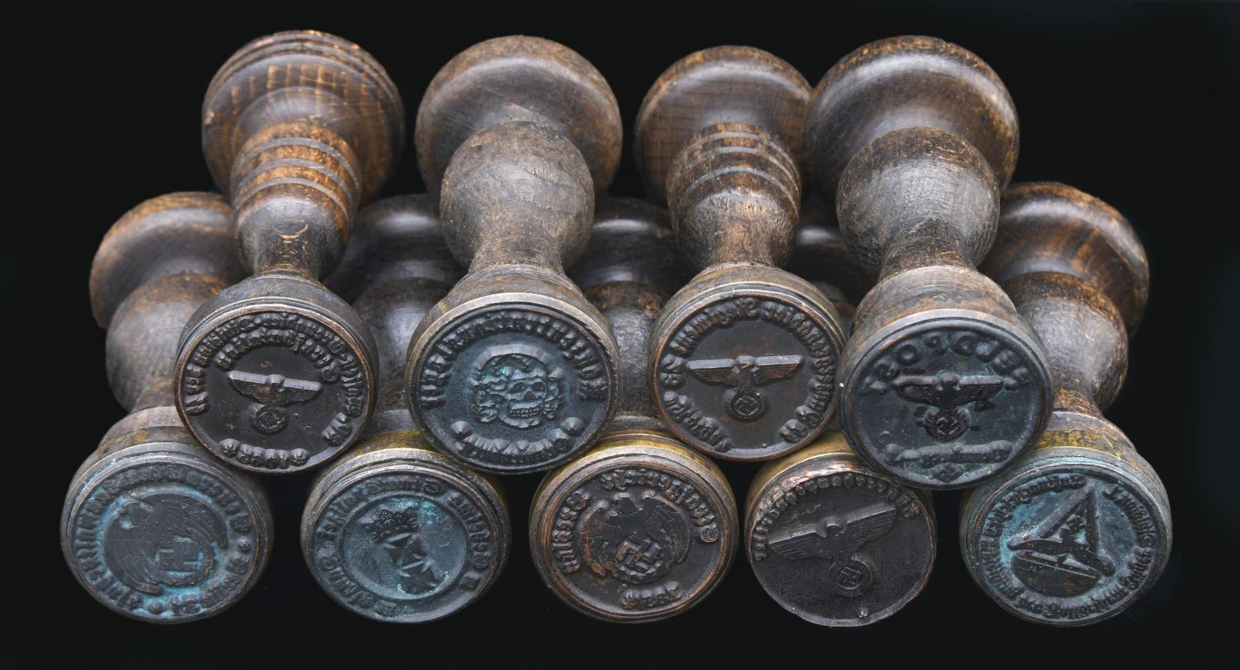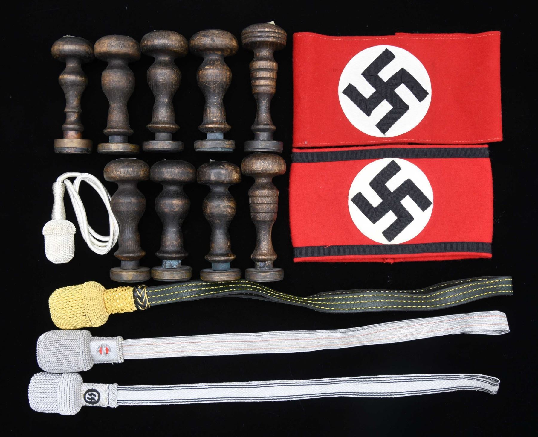 This lot includes 9 ink hand stamps from various WWII German organizations. They all have brass stamp heads with turned wooden handles. Although these appear to have age, we do believe they are of post-WWII production. / 1 Wool SS armband with cloth RZM tags. / 1 Wool Party armband with a paper RZM tag. / 1 Silver bullion dagger knot. / 1 Silver bullion SS sword knot. / 1 Silver bullion sword knot with a red tip and orange stripe on the thong. / 1 Gold bullion and leather sword knot. CONDITION: ink stamps are believed to show artificial wear; other items show virtually no wear. (02-23335/BF). $300-500.