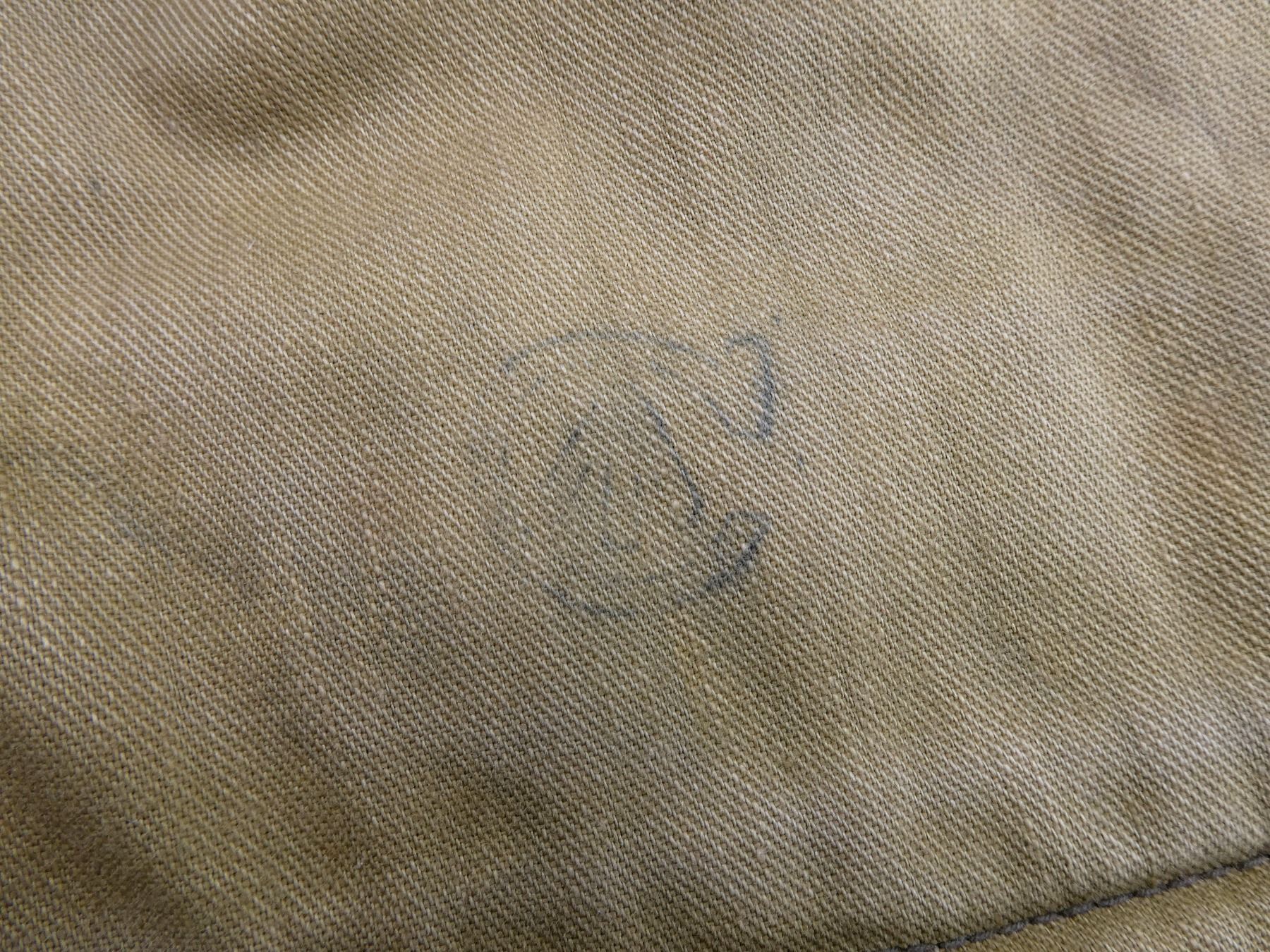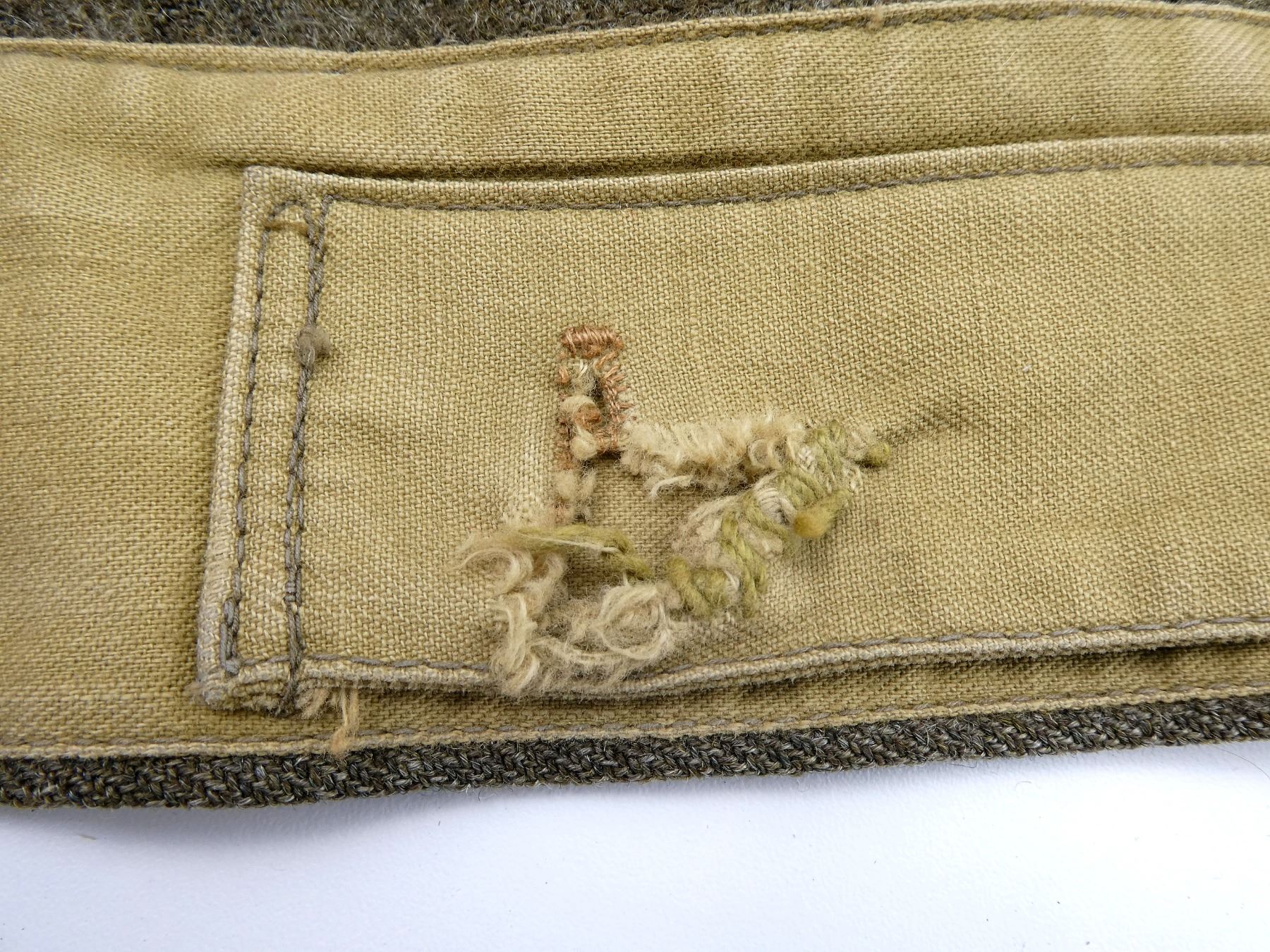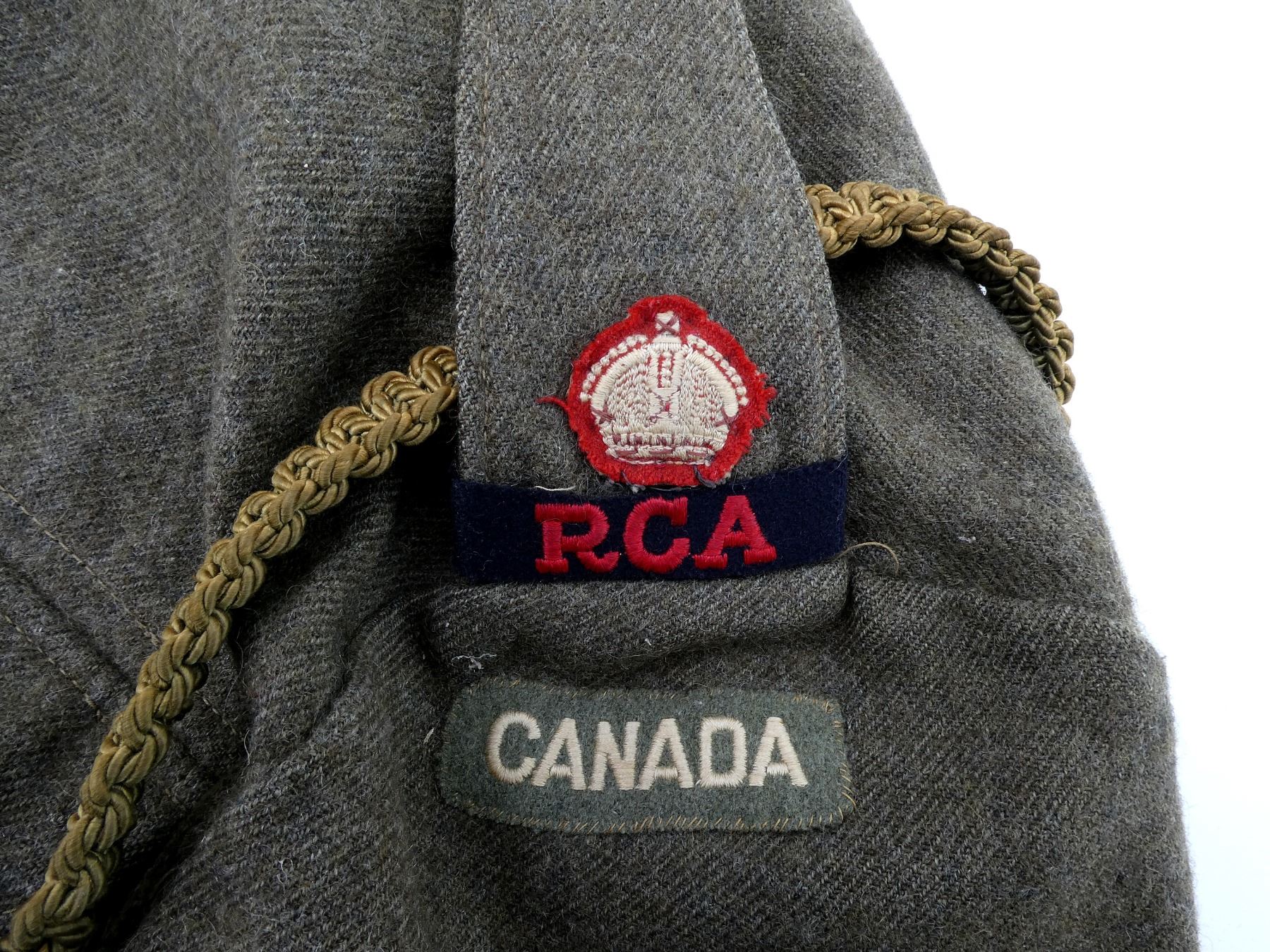 (1) OLIVE GREEN WOOL BATTLE DRESS TUNIC, FAINTLY MARKED: "WORK??????, CO. ?, MONTREAL 1942" ETC. WITH C-BROAD ARROW, KING'S CROWN SHOULDER BADGES, "RCA" CLOTH SHOULDER FLASHES, "CANADA" SHOULDER BADGES, CLOSED COLLAR, BUTTON FRONT, WITH PISTOL LANYARD, SHOWS AGE / WEAR, SHOULDER WIDTH APPROX. 17.5". SEE PHOTOS