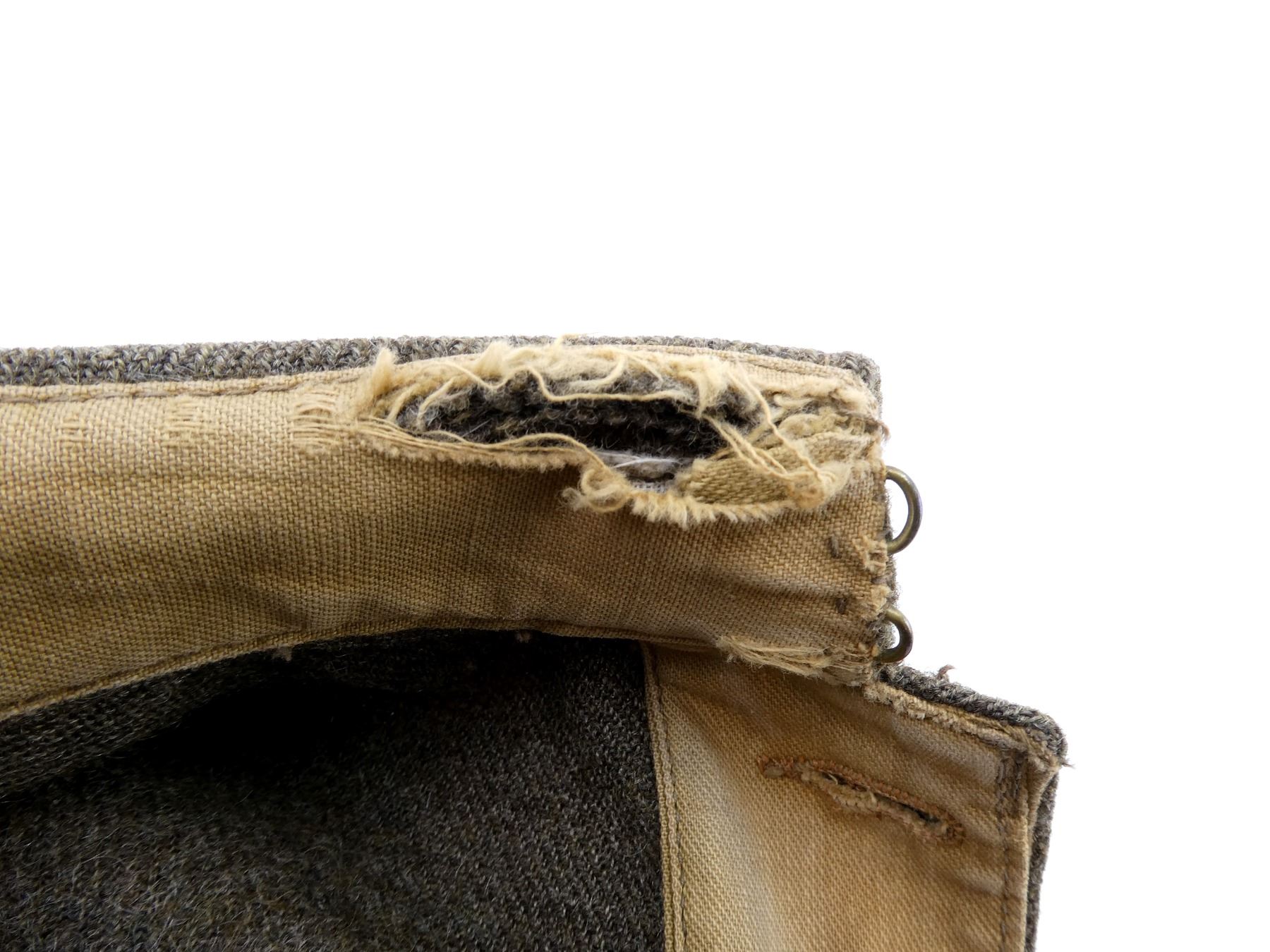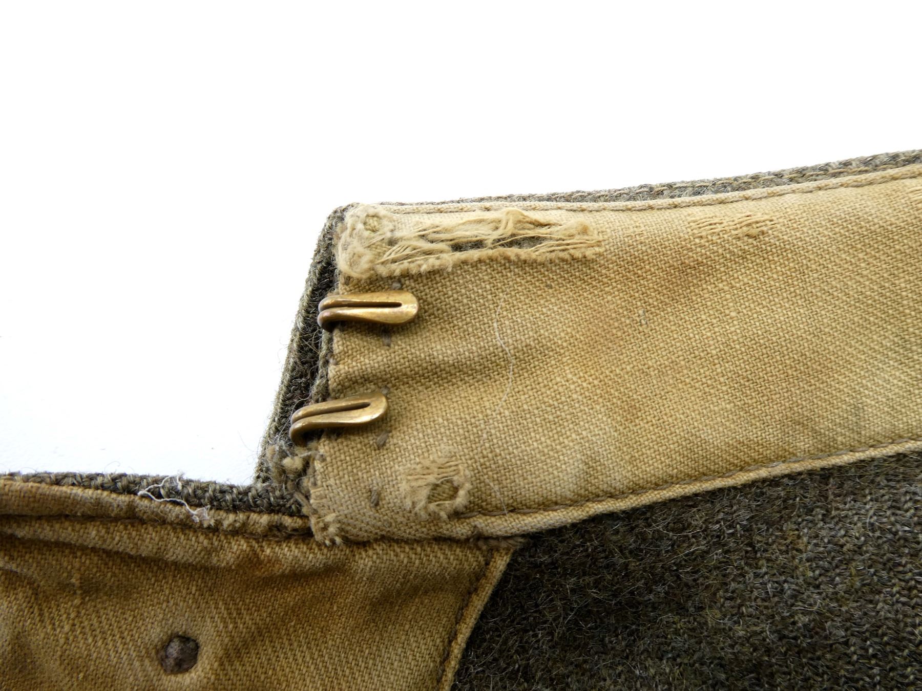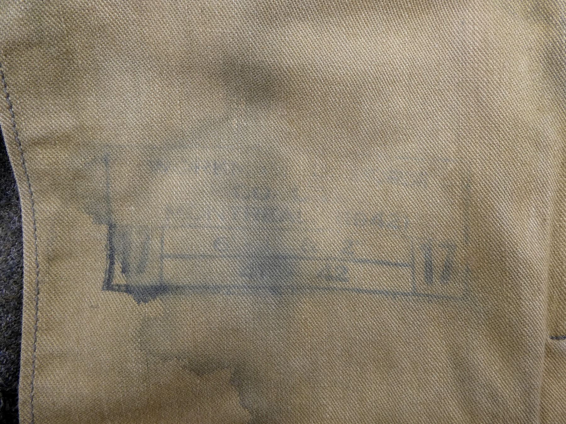 (1) OLIVE GREEN WOOL BATTLE DRESS TUNIC, FAINTLY MARKED: "WORK??????, CO. ?, MONTREAL 1942" ETC. WITH C-BROAD ARROW, KING'S CROWN SHOULDER BADGES, "RCA" CLOTH SHOULDER FLASHES, "CANADA" SHOULDER BADGES, CLOSED COLLAR, BUTTON FRONT, WITH PISTOL LANYARD, SHOWS AGE / WEAR, SHOULDER WIDTH APPROX. 17.5". SEE PHOTOS