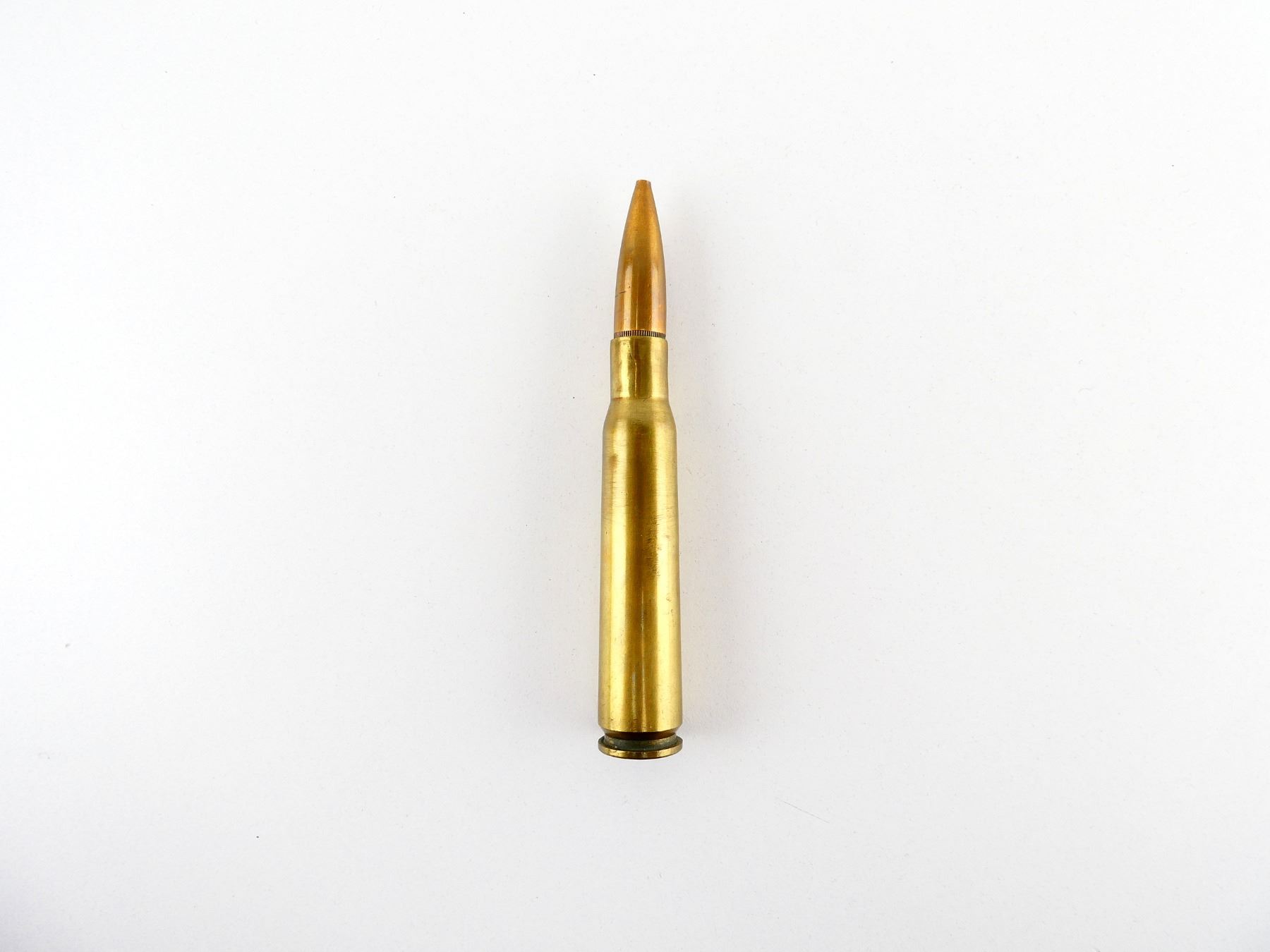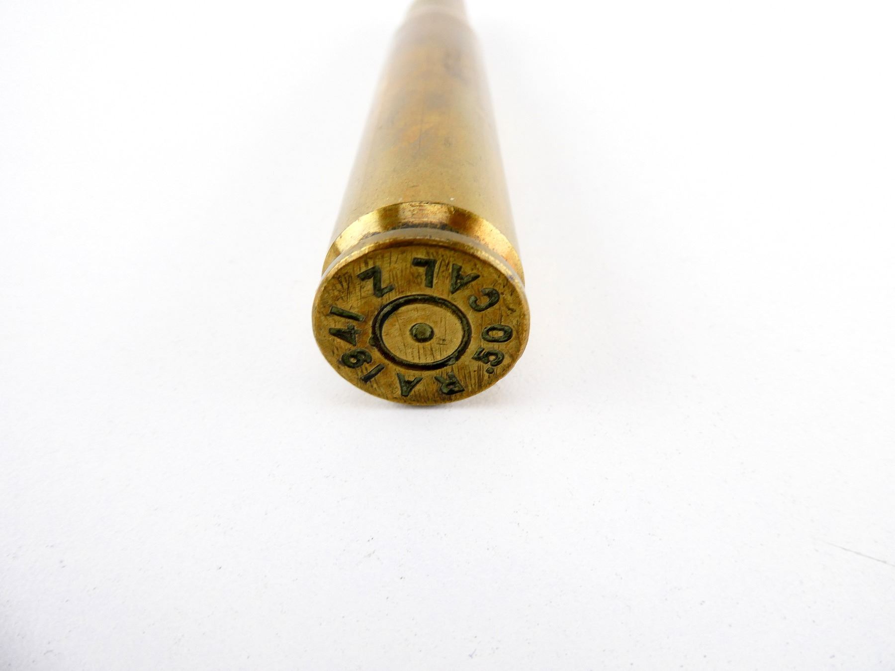 (1) .50 CAL. BRASS CASING, FIRED PRIMER, WITH COPPER PROJECTILE TURNED INTO A LETTER OPENER, PROJECTILE REMOVES FROM SHELL CASING WITH BLADE AFFIXED TO BOTTOM, SHELL CASING BOTTOM MARKED: "RA 1941 Z, .50 CAL", NO VISIBLE MARKINGS ON PROJECTILE, BRASS CASING APPROX. 0.75" DIA., PROJECTILE WITH BLADE OVERALL LENGTH APPROX. 5 1/8" & CASING / PROJECTILE PUT TOGETHER OVERALL LENGTH APPROX. 5 3/8". SEE PHOTOS.