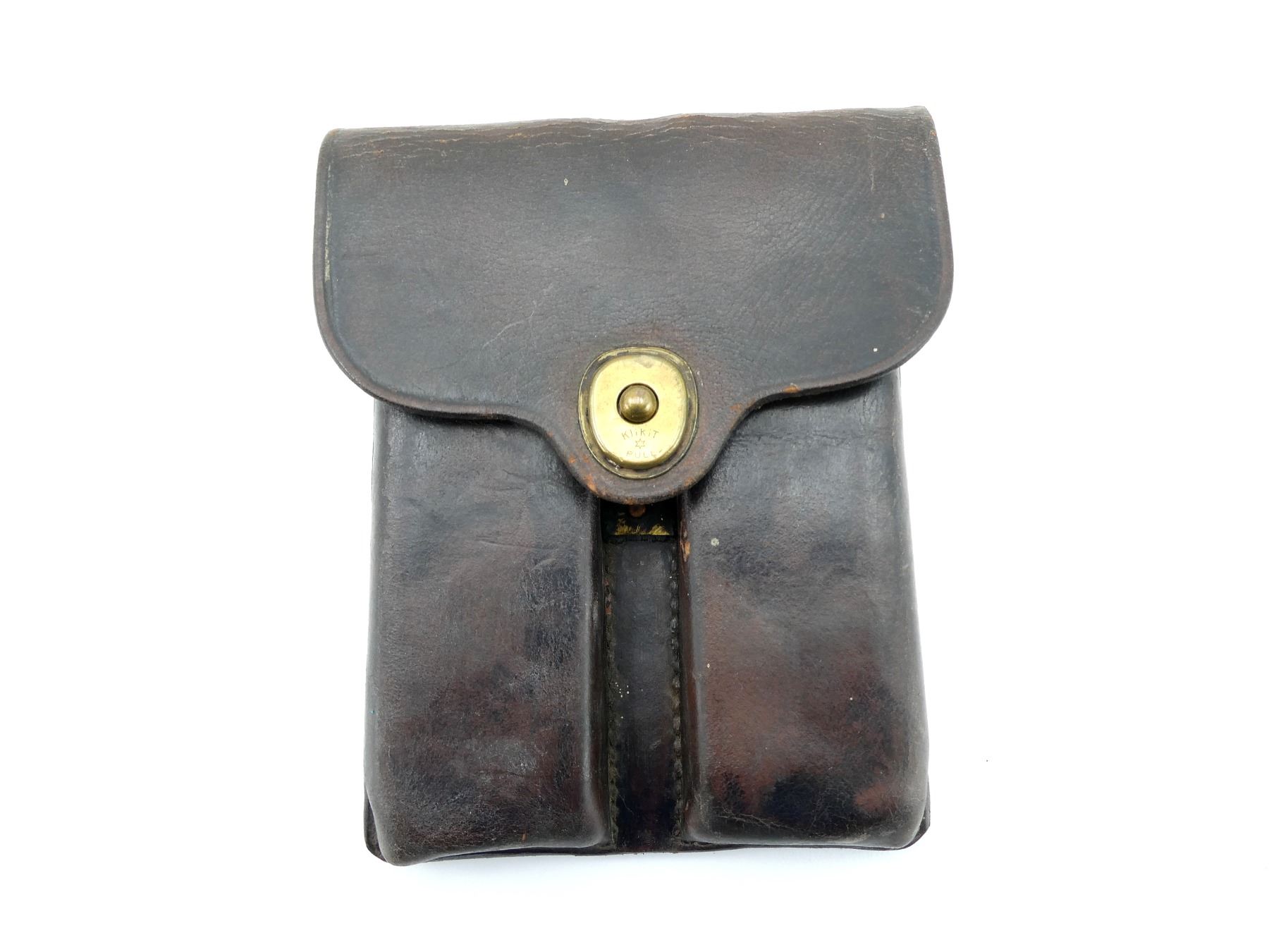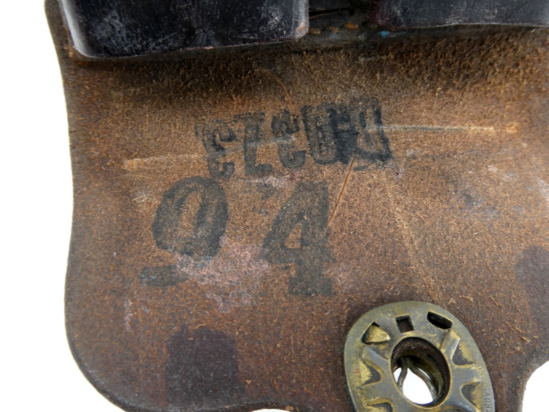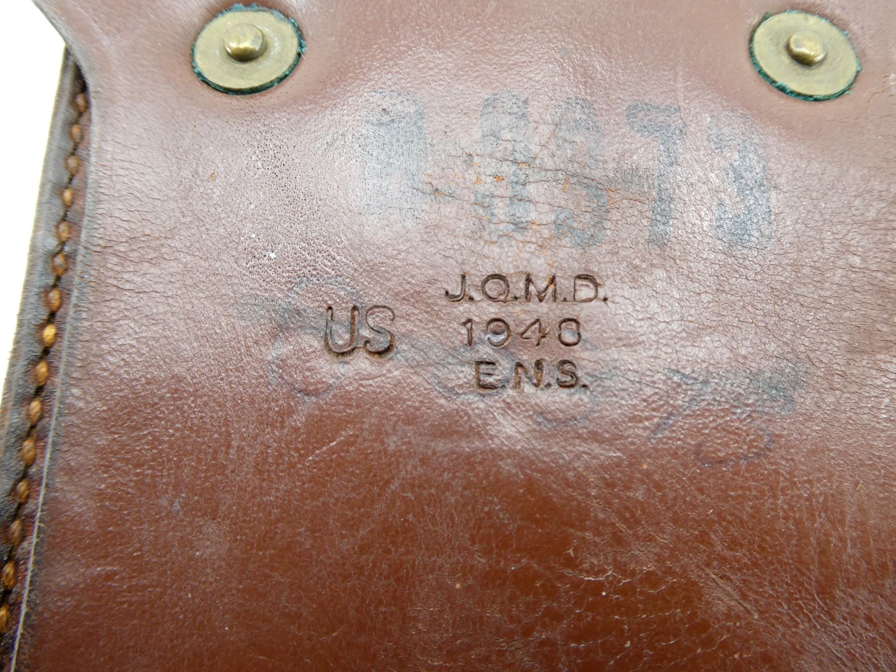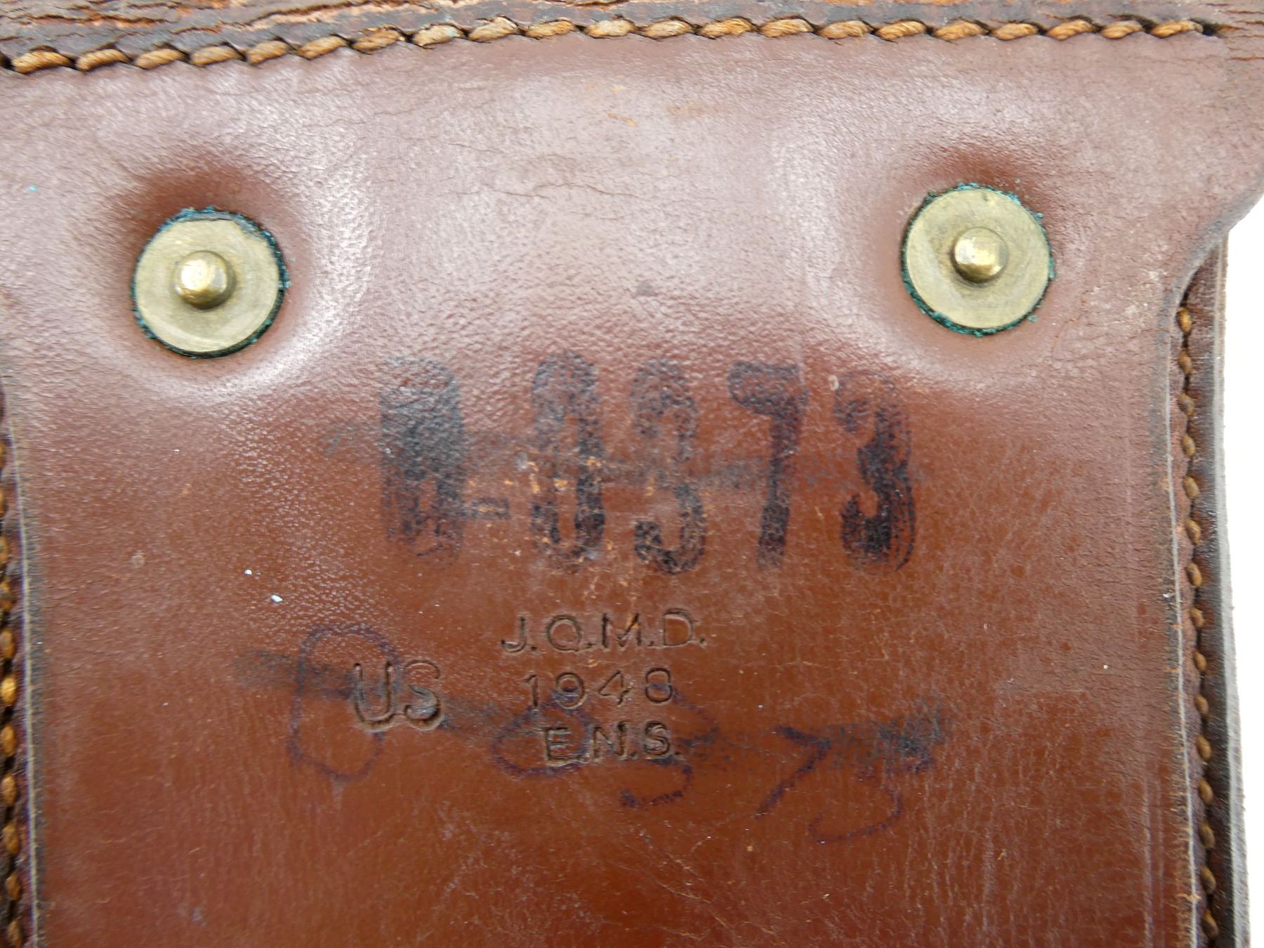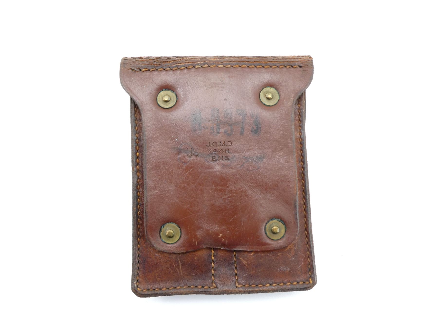 (1) BROWN LEATHER DOUBLE-POCKET MAG POUCH, MARKED: "US", "J.Q.M.D., 1940, E.N.S.", "B-0373", VARIOUS OTHER INK STAMP / HAND-WRITTEN MARKINGS, BRASS FITTINGS, BELT LOOP. SEE PHOTOS.