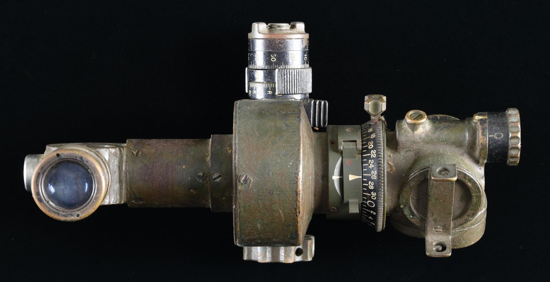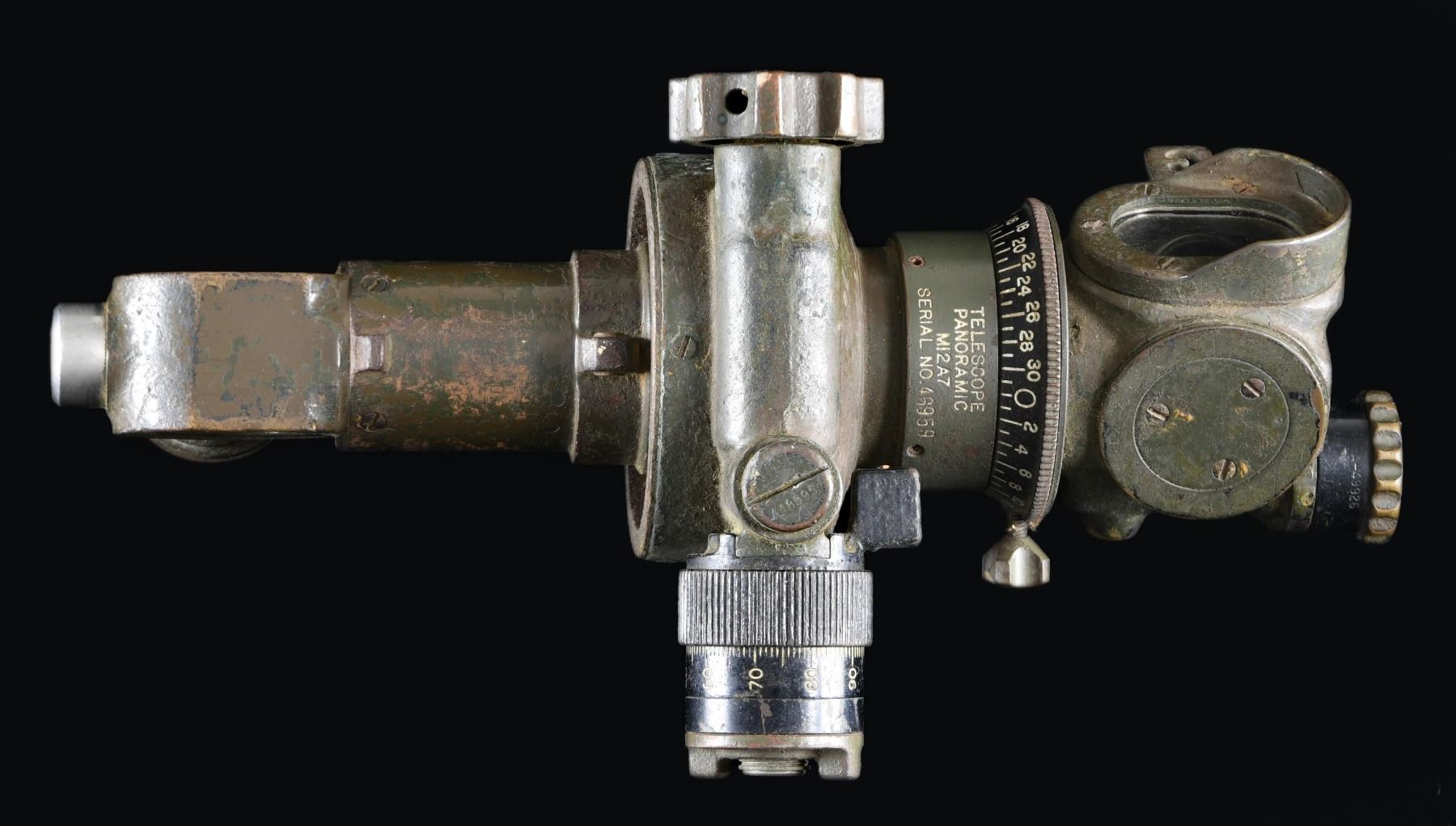 A seldom-seen example of a WWII US tank sight, designated M12-A7. This sight appears to be complete, except for the eyecup, and the original paint is nearly complete. The top of the sight and the rear of the sight are marked "TELESCOPE  PANORAMIC  M12A7  SERIAL NO. 46959". CONDITION: Most of the original paint remains on the site. All dials and adjustments appear to function well. (02-23647/BF). $300-500.