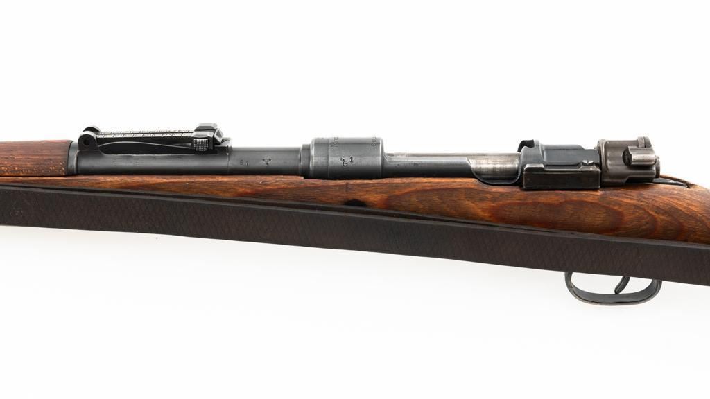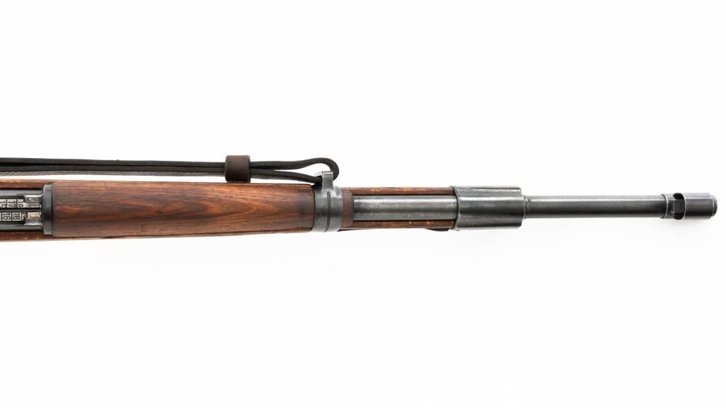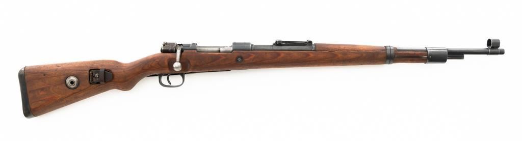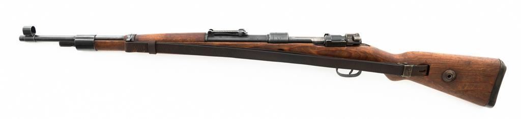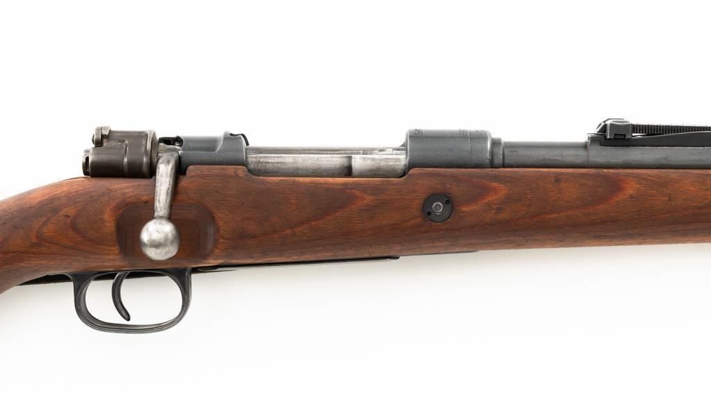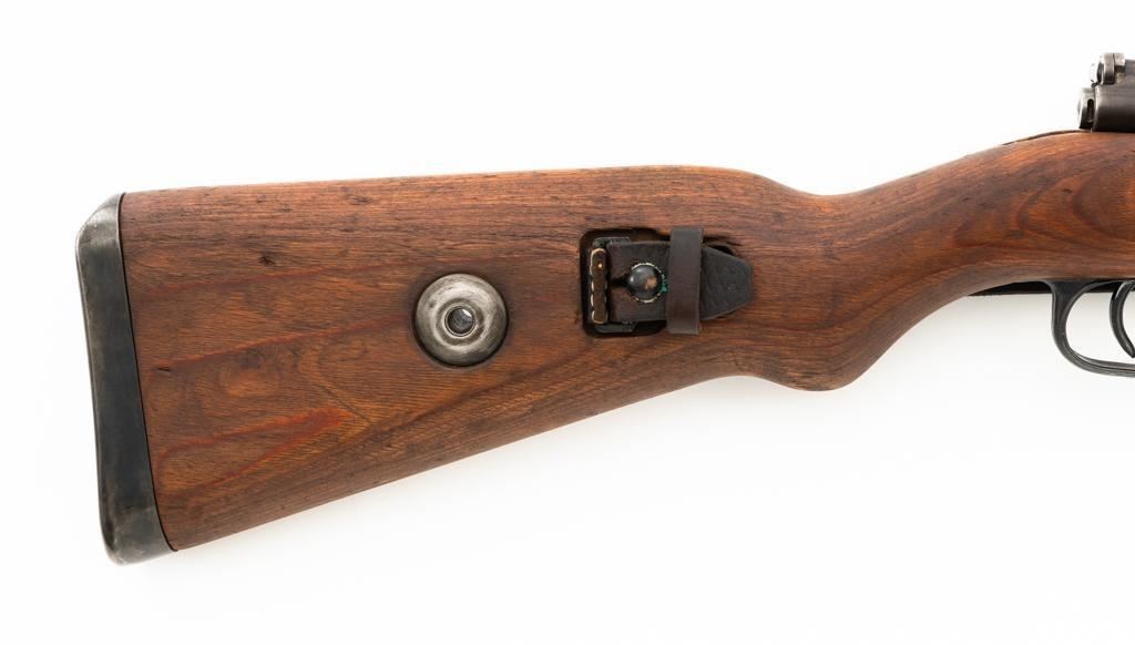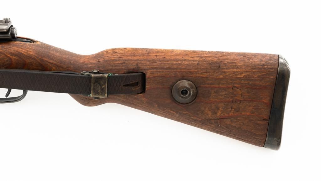 Waffenwerke Brunn dou 45 Kar 98k Mauser Bolt Action Rifle, #61e, 8x57mm cal., 23.6" barrel, blued finish, laminated stock and handguard, cupped buttplate, inverted-"V" front sight with attached hood, and adjustable tangent rear sight with "V"-notched groove, graduated to 2000 meters. Includes a dark brown leather Israeli sling, in good used condition. No cleaning rod. Top of the receiver ring is marked "WaA 380/Mod.98/dou.45". Barrel stamped with partially visible "HP" code and firing proof with swastika defaced by a center punch. Matching numbered trigger guard. Other numbers do not match. Import marked on left side of the barrel. Condition overall is fine, retaining approx. 92% of its reblued finish, showing areas of thinning and toning. Wood is lightly sanded. There are two 2.5" delamination cracks to left side of the buttstock, and other moderate handling marks. Action operates smoothly. Floorplate has been filed and the bolt will close on an empty chamber. Bore is good with clearly defined rifling. Est.: $500-$800. (C&R)