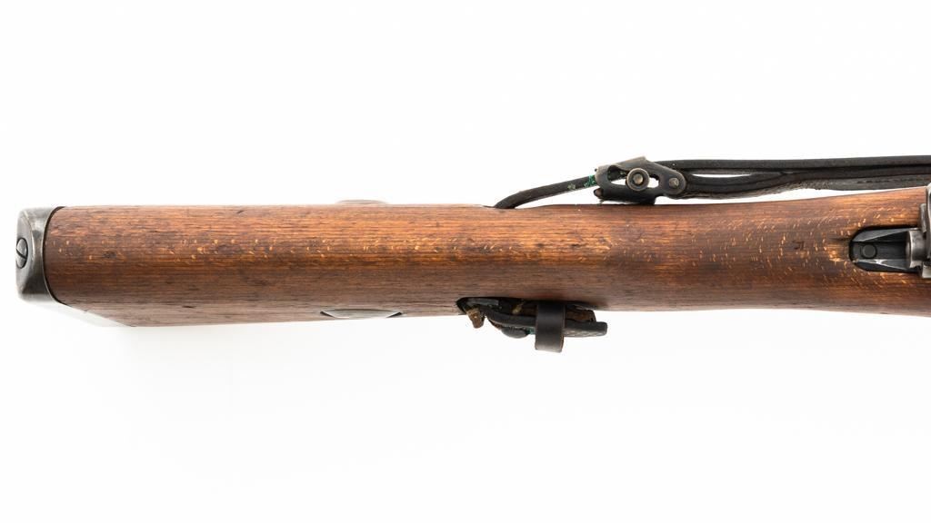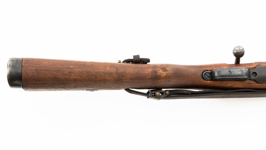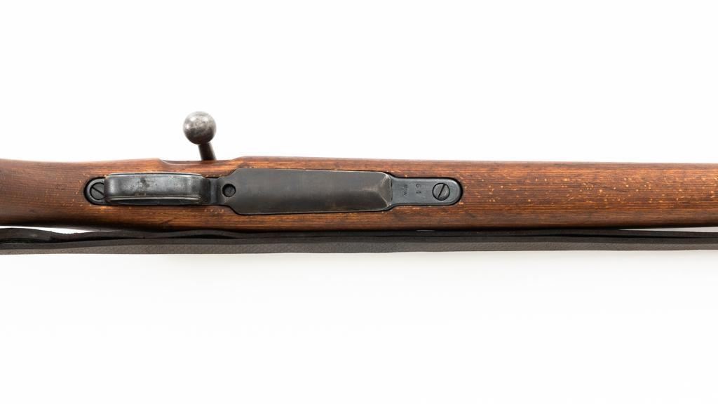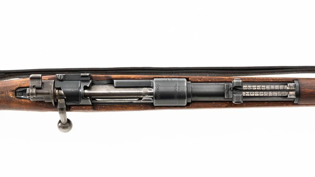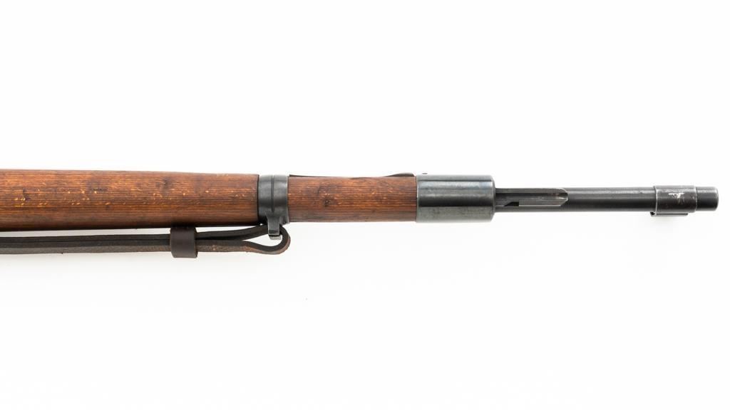 Waffenwerke Brunn dou 45 Kar 98k Mauser Bolt Action Rifle, #61e, 8x57mm cal., 23.6" barrel, blued finish, laminated stock and handguard, cupped buttplate, inverted-"V" front sight with attached hood, and adjustable tangent rear sight with "V"-notched groove, graduated to 2000 meters. Includes a dark brown leather Israeli sling, in good used condition. No cleaning rod. Top of the receiver ring is marked "WaA 380/Mod.98/dou.45". Barrel stamped with partially visible "HP" code and firing proof with swastika defaced by a center punch. Matching numbered trigger guard. Other numbers do not match. Import marked on left side of the barrel. Condition overall is fine, retaining approx. 92% of its reblued finish, showing areas of thinning and toning. Wood is lightly sanded. There are two 2.5" delamination cracks to left side of the buttstock, and other moderate handling marks. Action operates smoothly. Floorplate has been filed and the bolt will close on an empty chamber. Bore is good with clearly defined rifling. Est.: $500-$800. (C&R)