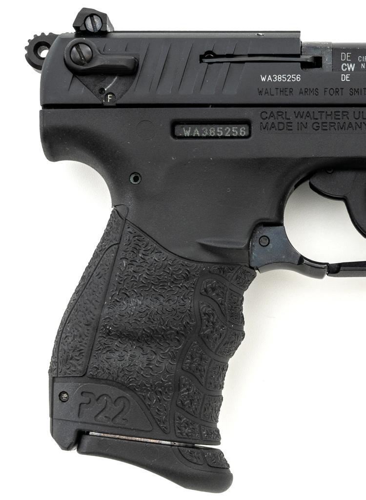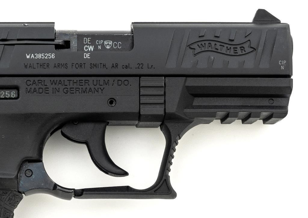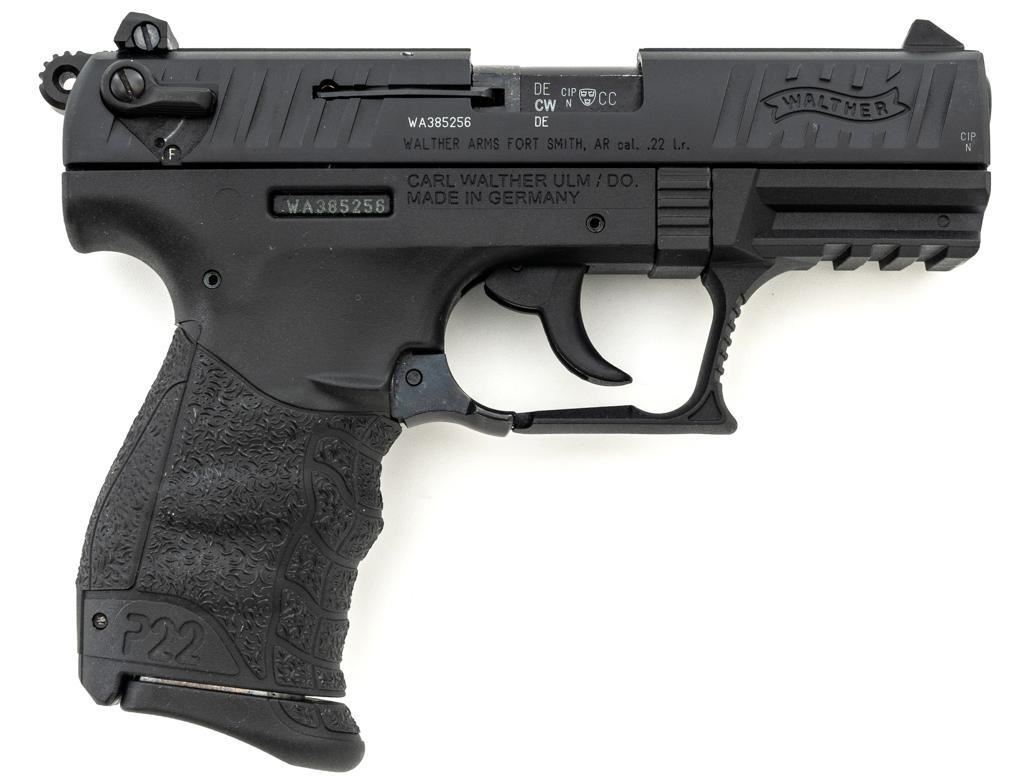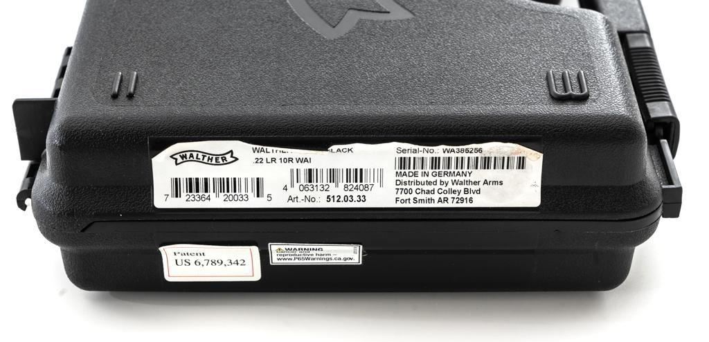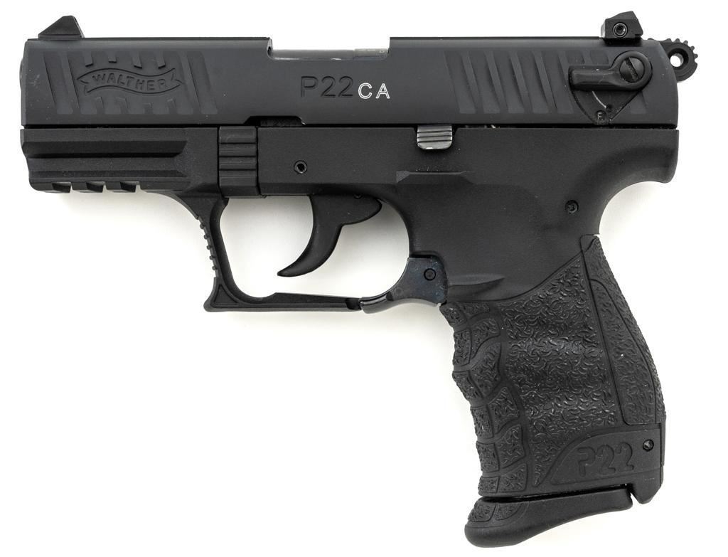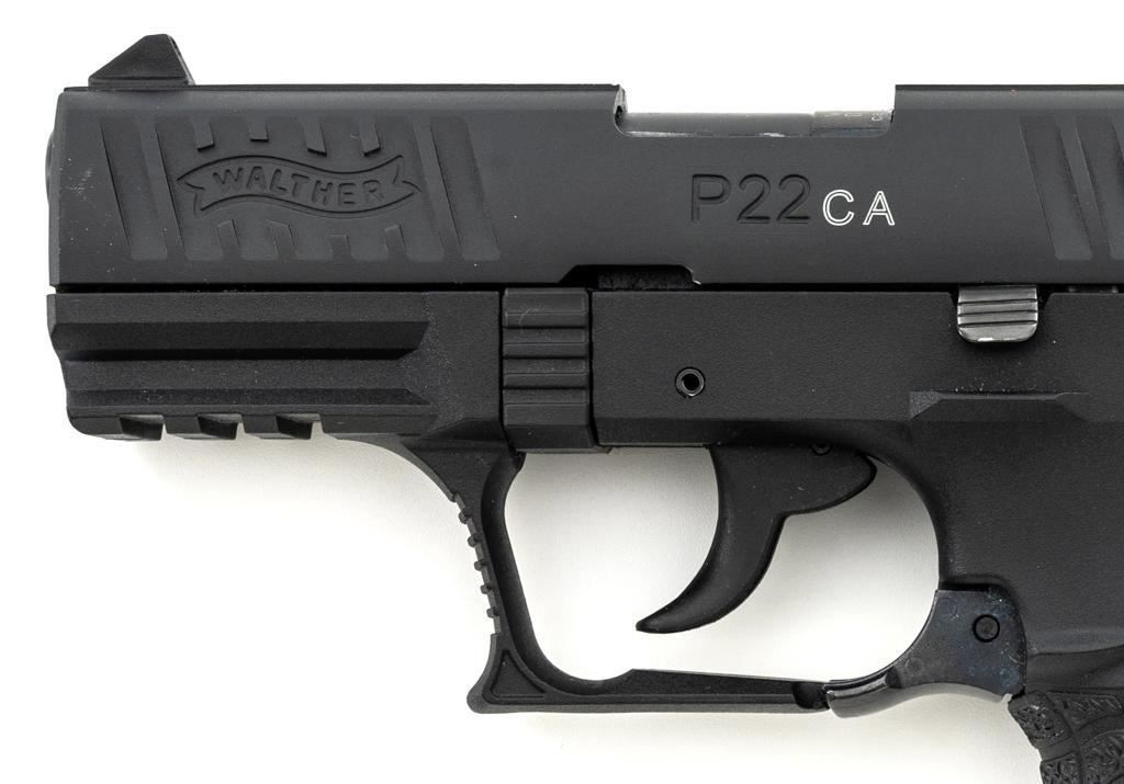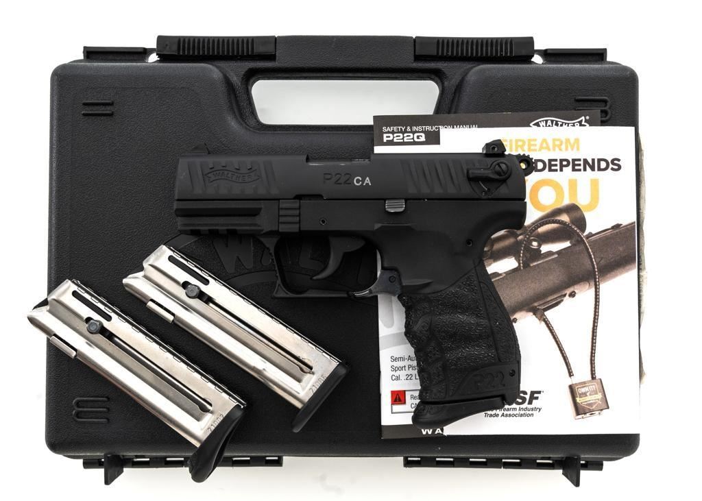 Walther P22CA Semi-Automatic Pistol, #WA385256, .22 LR cal., 3.5" barrel, double/single action, black slide, black composite frame, integral textured grips, white three-dot sights, lower accessory rail, frame extension, ambidextrous safety and mag release, with three (3) factory 10-rounds magazines. Mfgd 2022. In original hard case with matching end label and instruction manual. Consignor stated guide rod has been replaced with a Tandemkross stainless steel captured spring guide rod, the factory guide rod is not included. Condition is excellent, appearing near new, showing only light marks from handling. Action operates smoothly. Bore is bright with excellent rifling. Est.: $200-$300. (Modern/PPT)